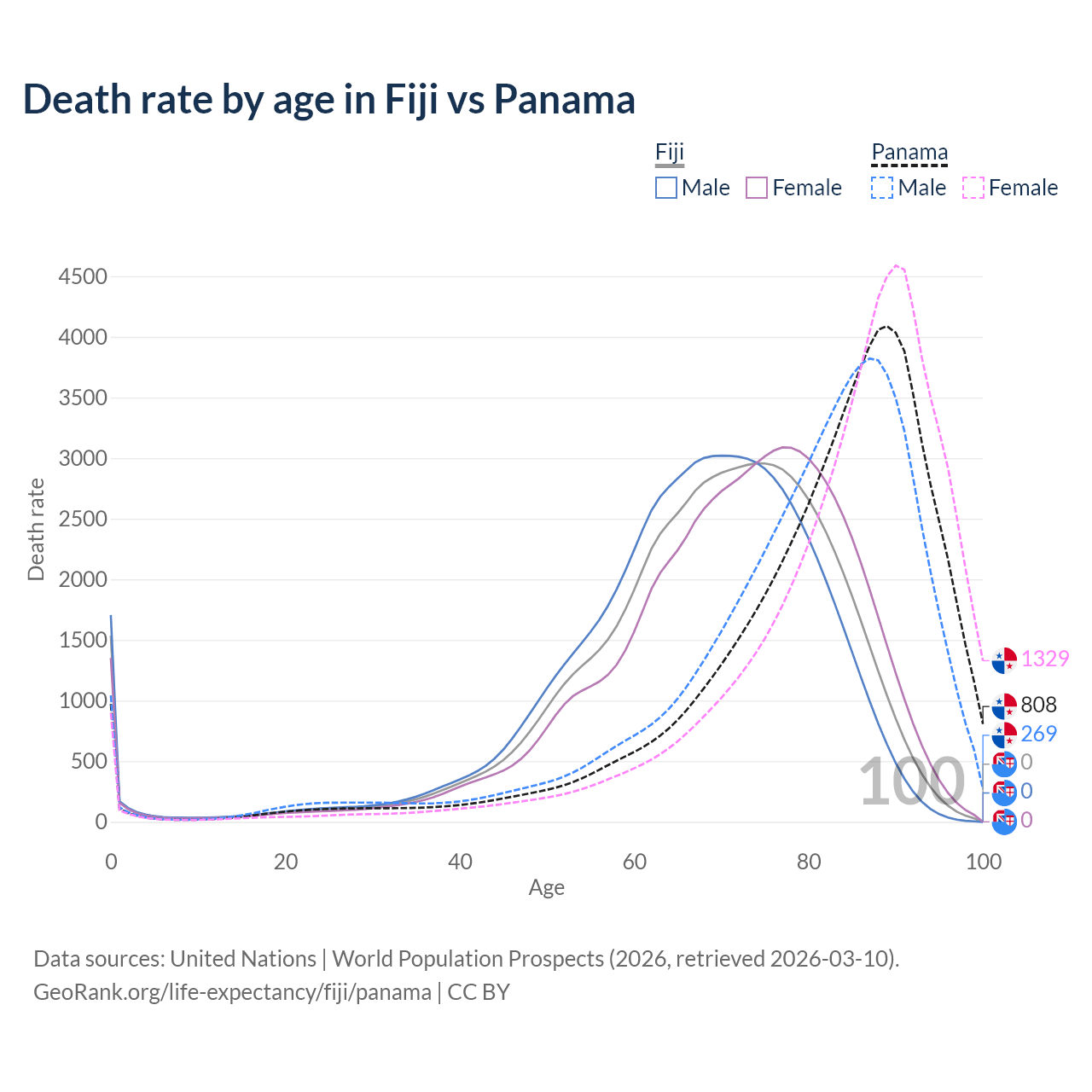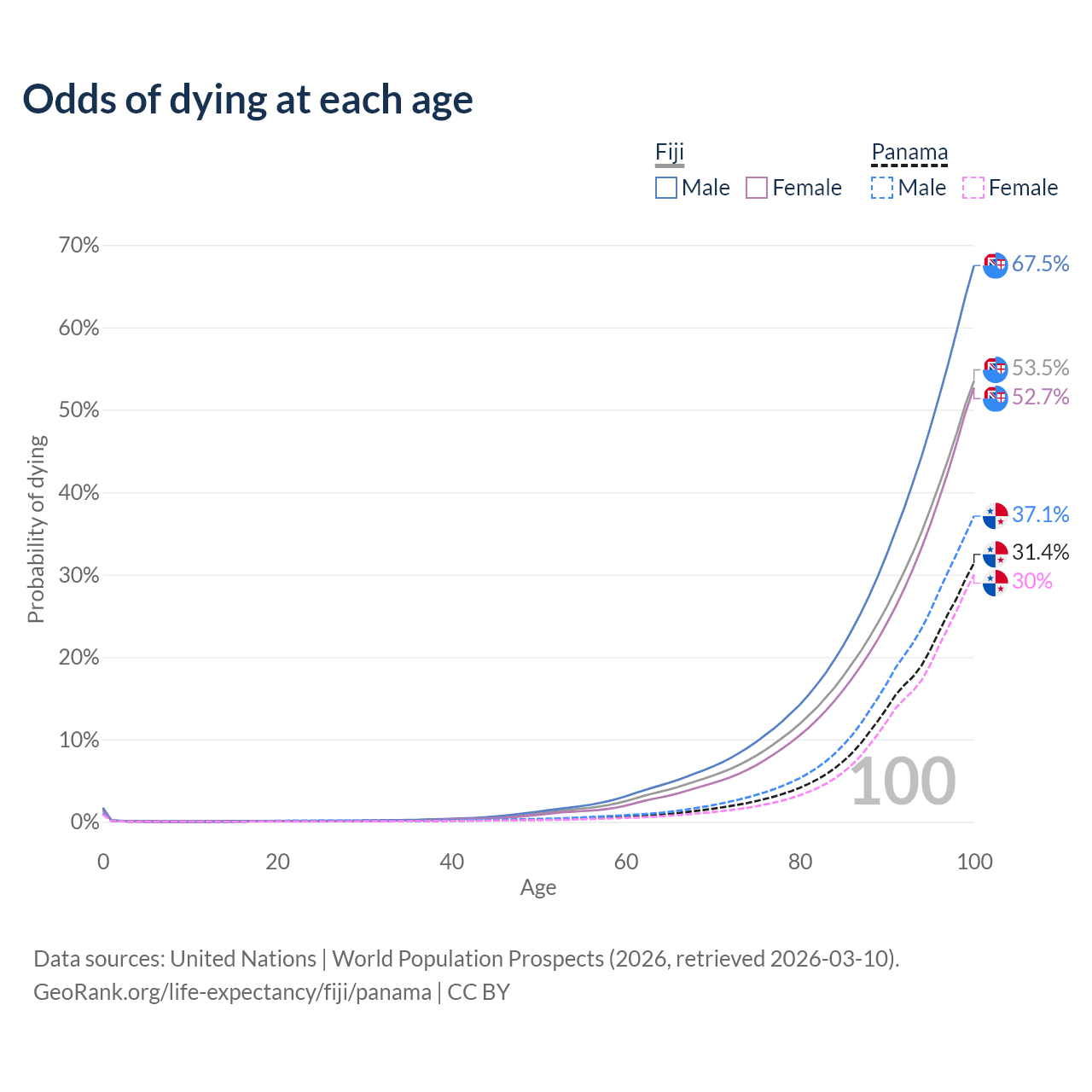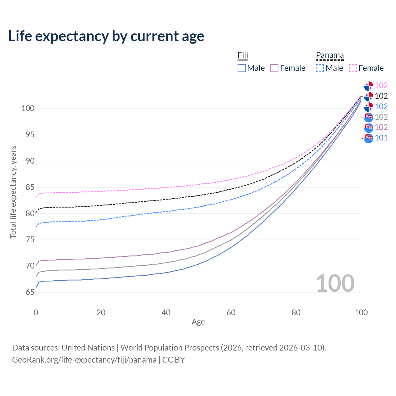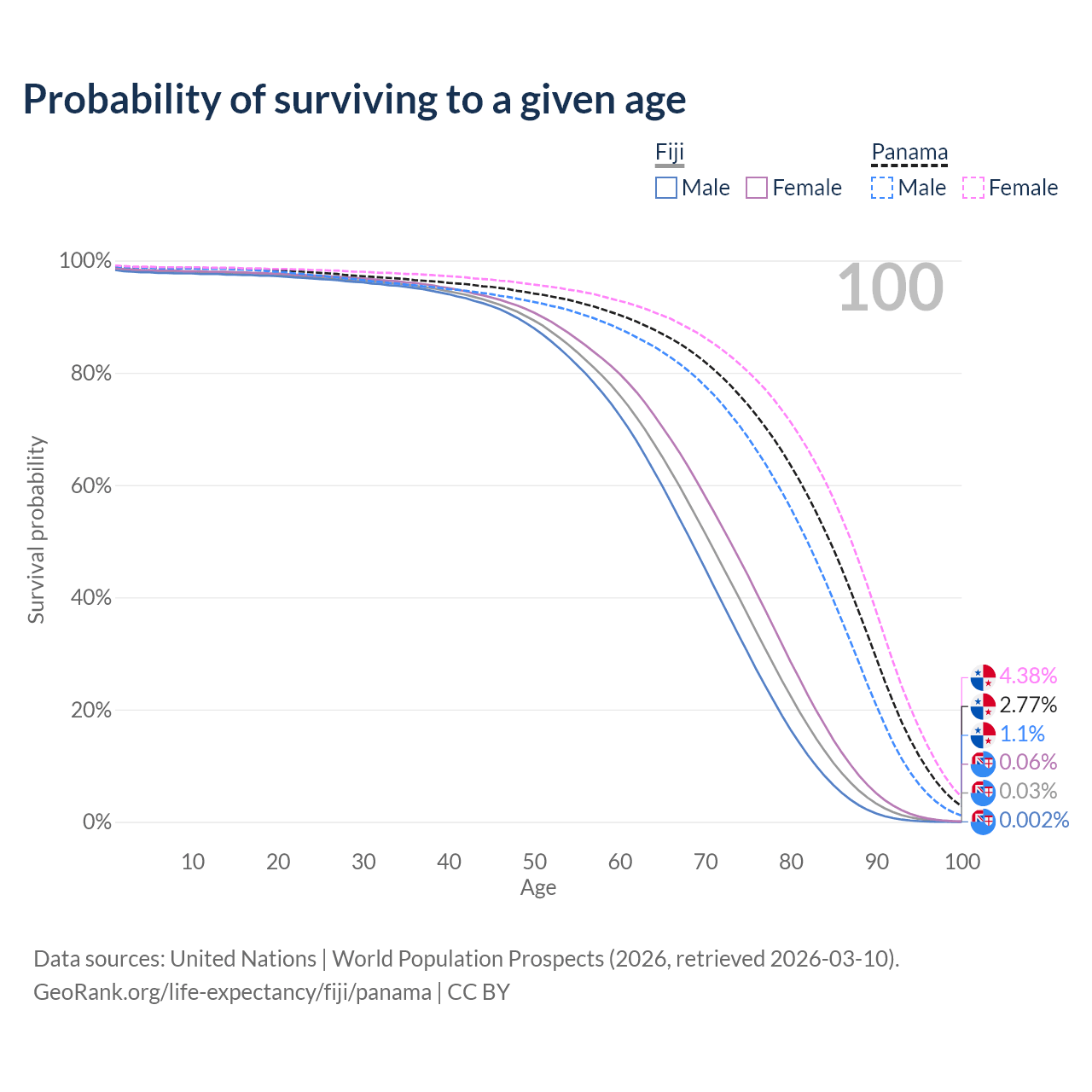 This life expectancy calculator shows the odds of living to 100, 95, 90, and below based on current age for both males and females in Fiji and Panama, along with mean and median age of death. The calculations are based on the 2026 life tables (actuarial tables) from the UN World Population Prospects.