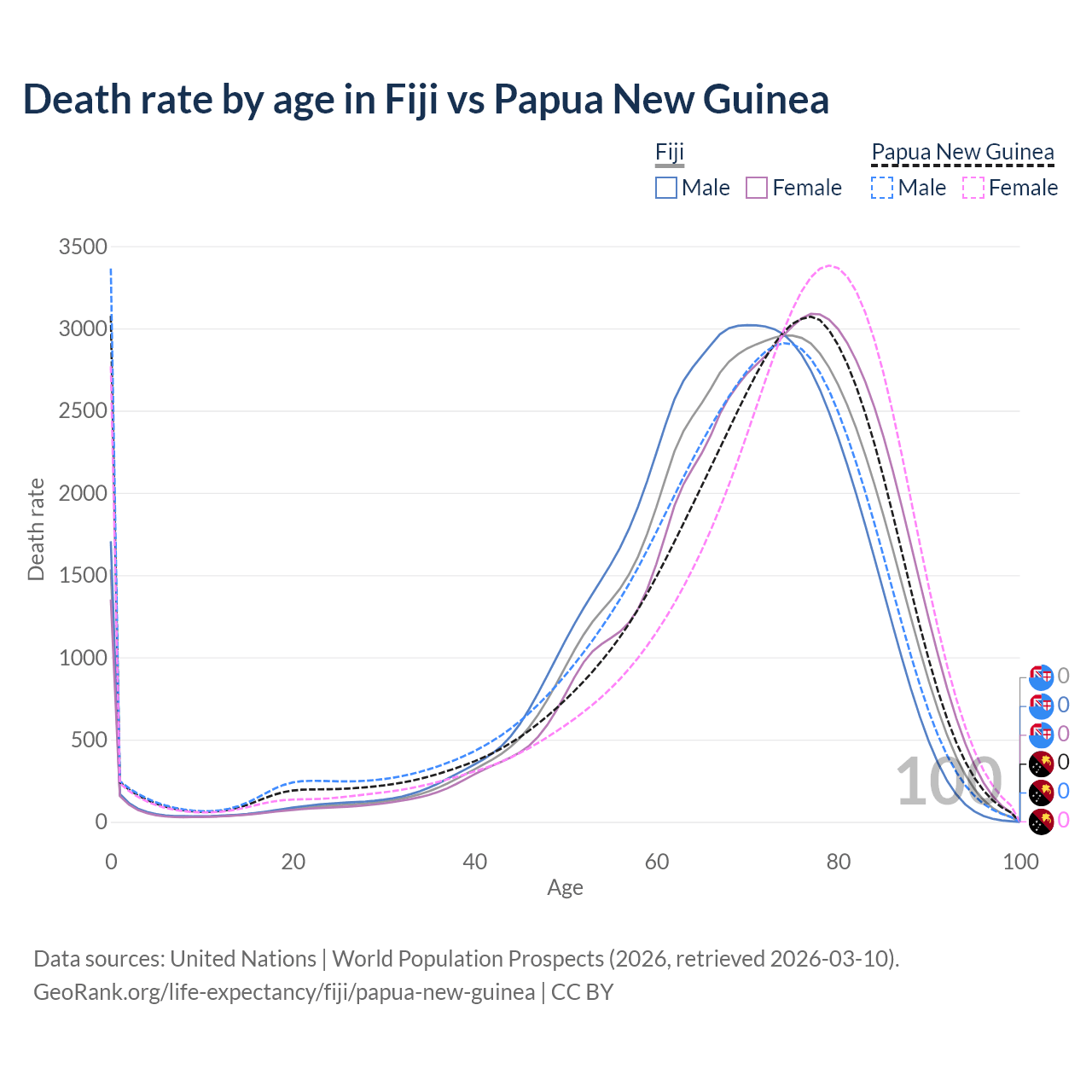 In Fiji, the most common age of death is 74, compared to 0 in Papua New Guinea. The median age of death is 70.5 in Fiji and 71.7 in Papua New Guinea, meaning only half of each cohort is expected to live past that age.