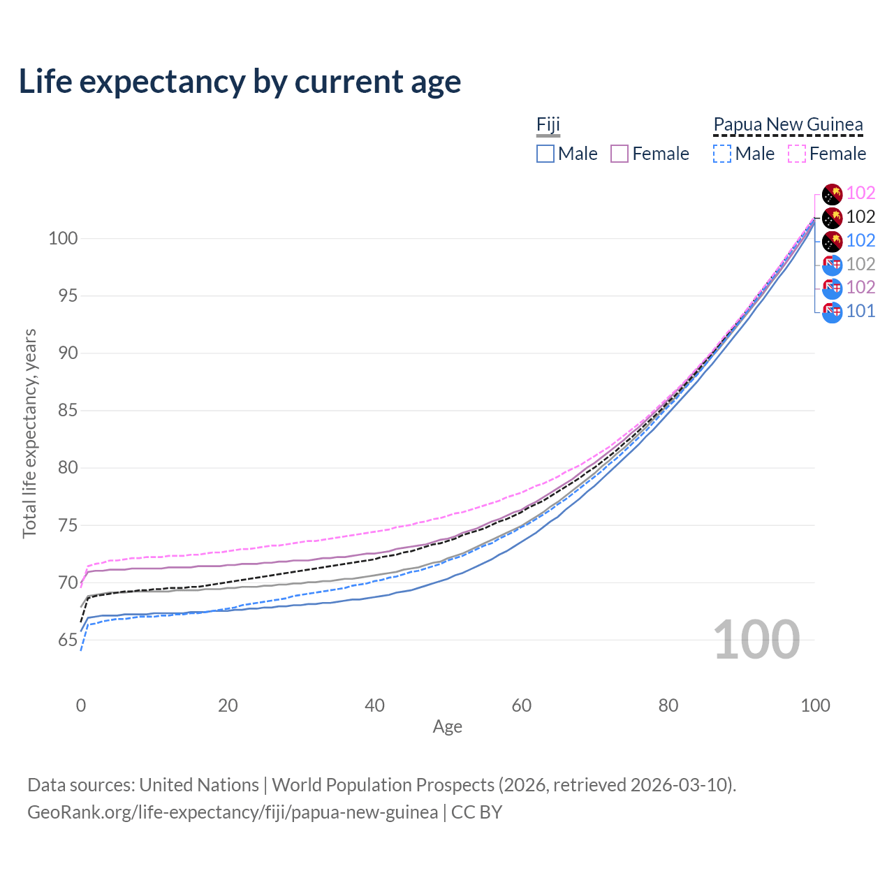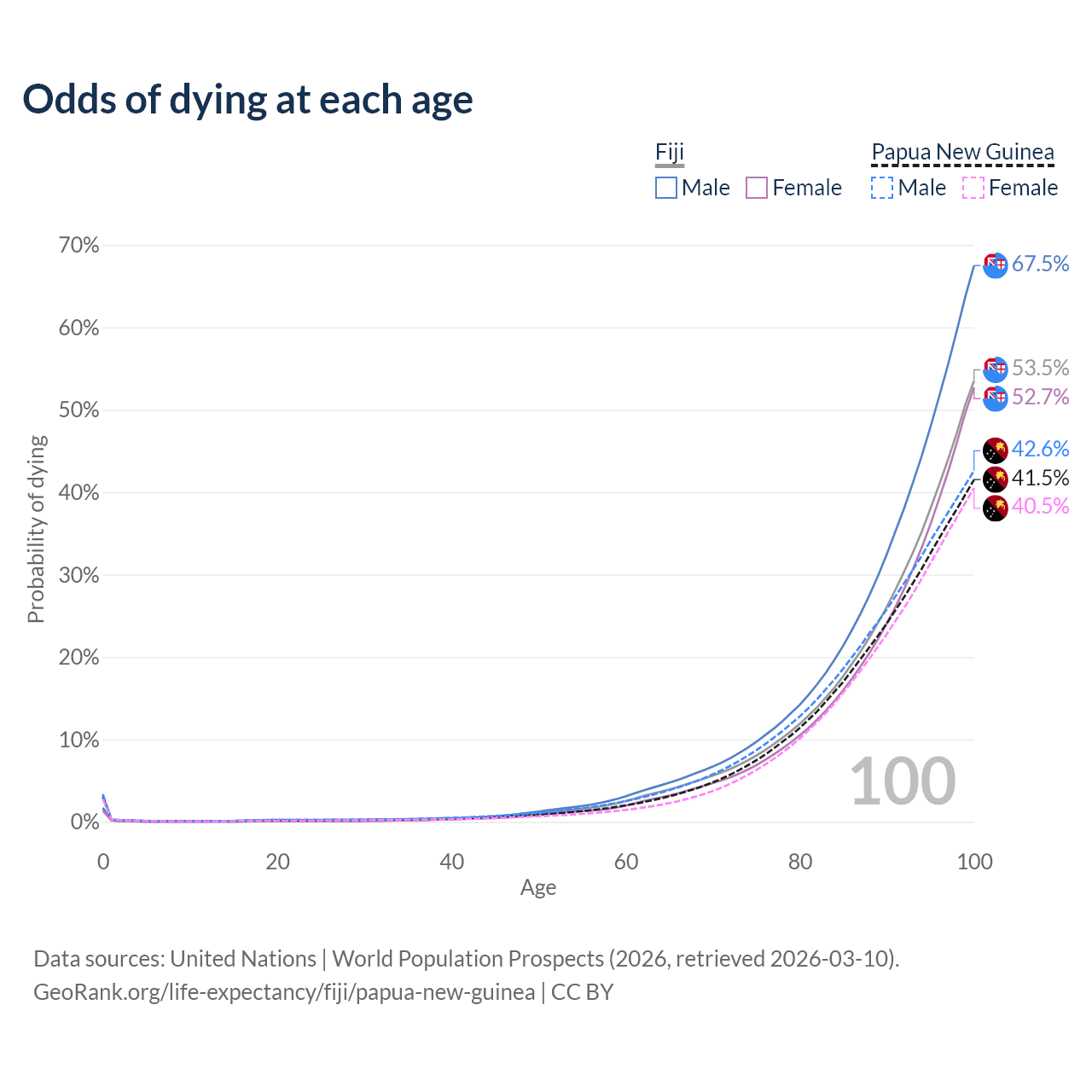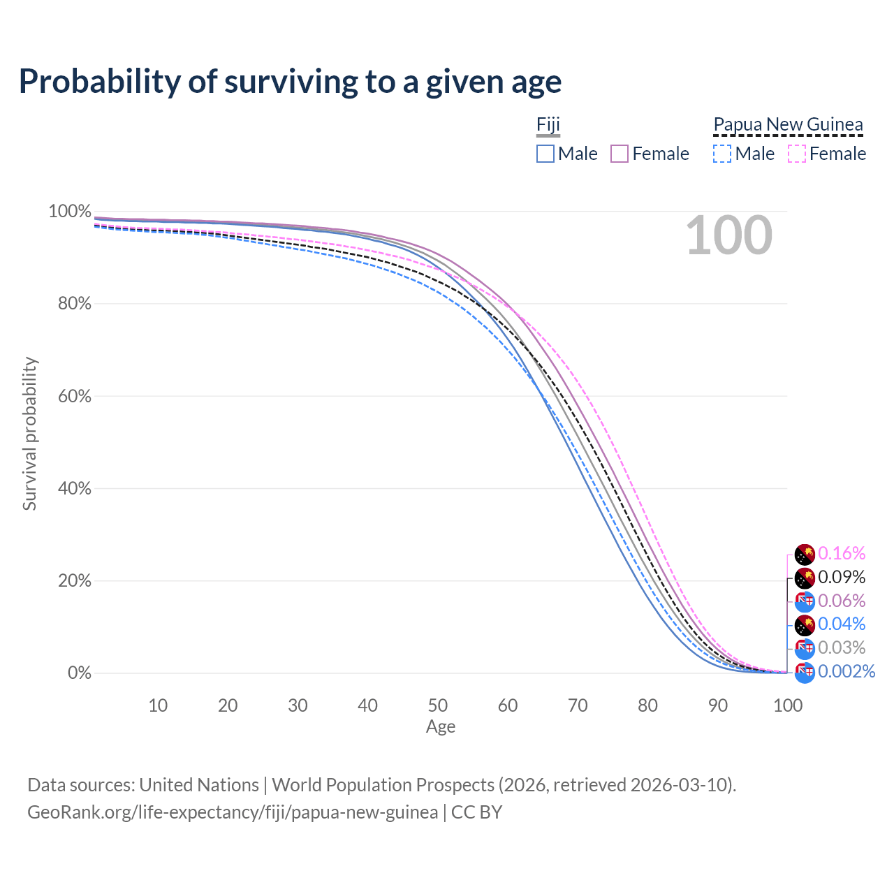 This life expectancy calculator shows the odds of living to 100, 95, 90, and below based on current age for both males and females in Fiji and Papua New Guinea, along with mean and median age of death. The calculations are based on the 2026 life tables (actuarial tables) from the UN World Population Prospects.