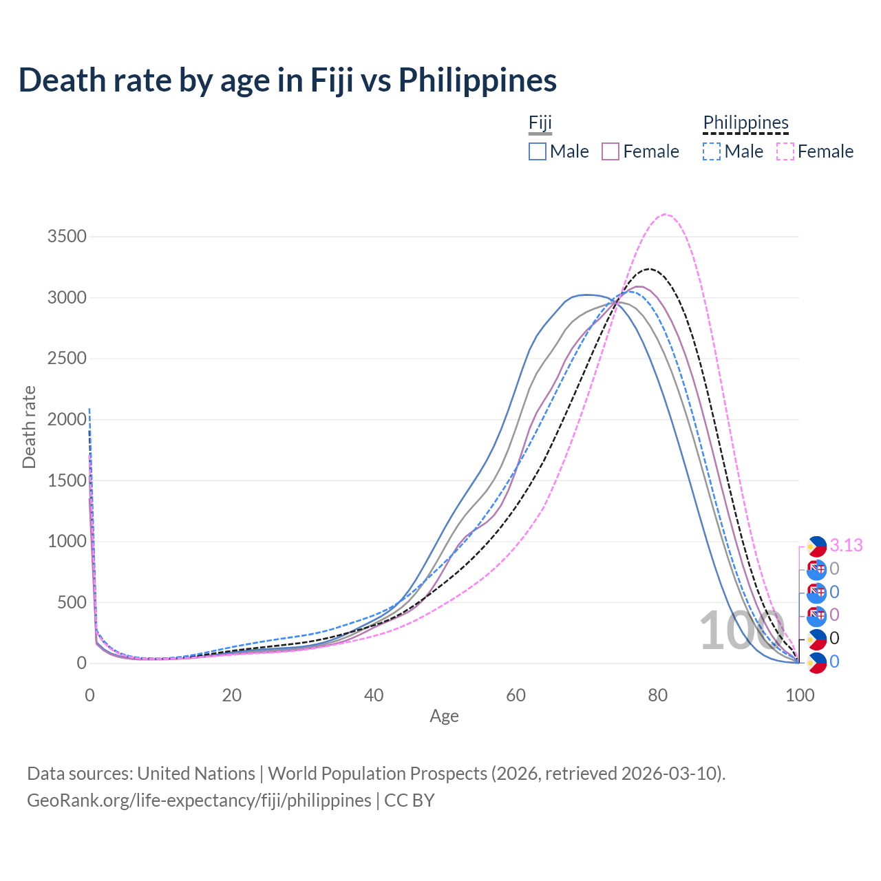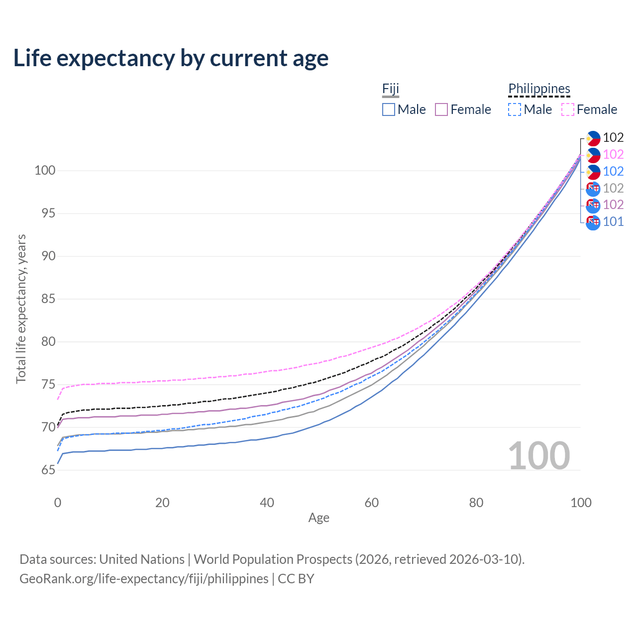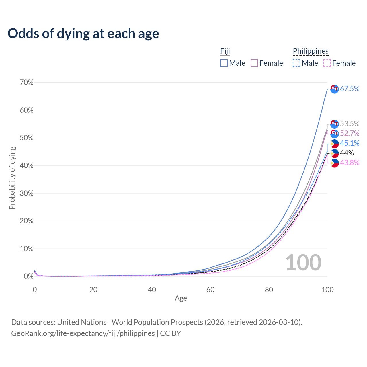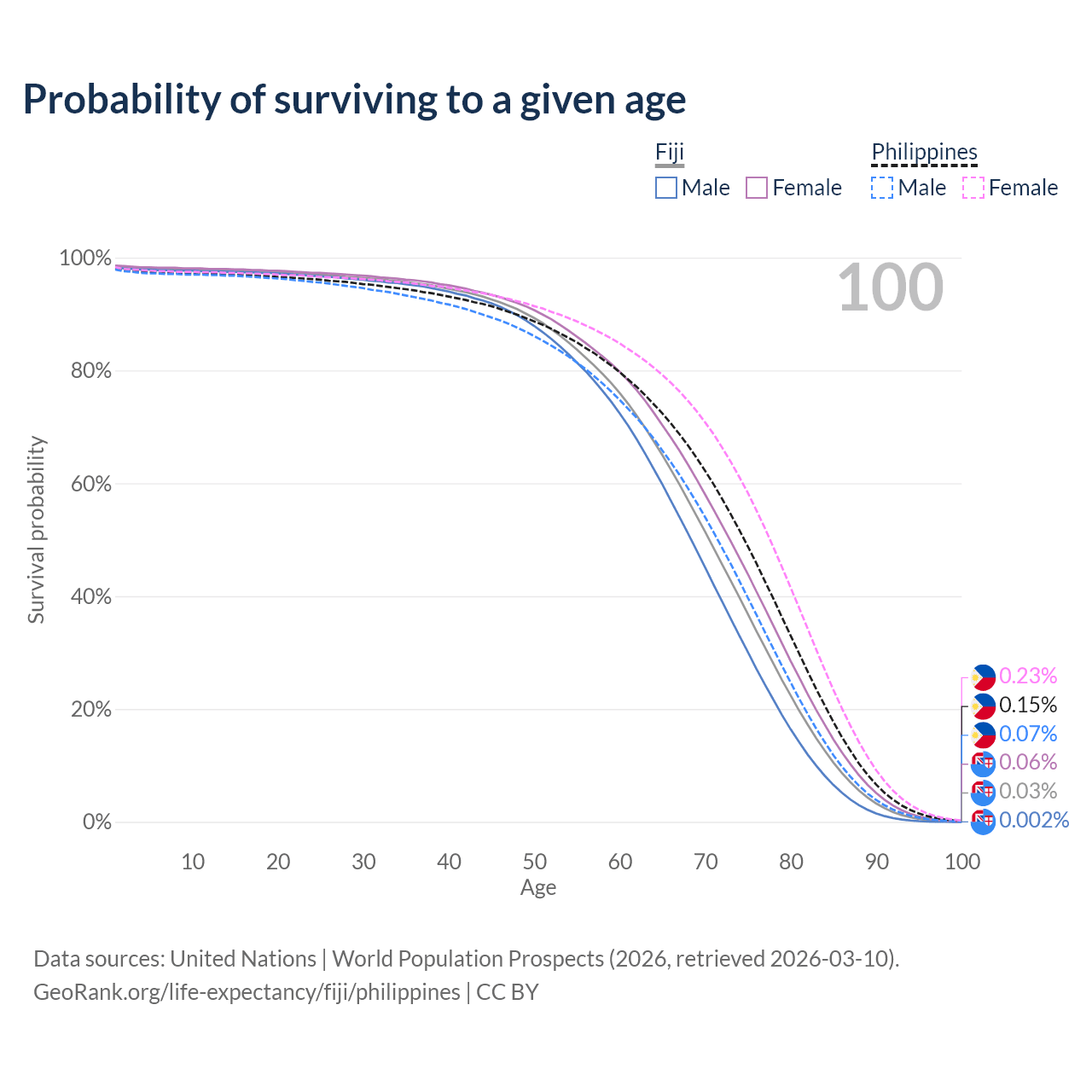 This life expectancy calculator shows the odds of living to 100, 95, 90, and below based on current age for both males and females in Fiji and the Philippines, along with mean and median age of death. The calculations are based on the 2026 life tables (actuarial tables) from the UN World Population Prospects.