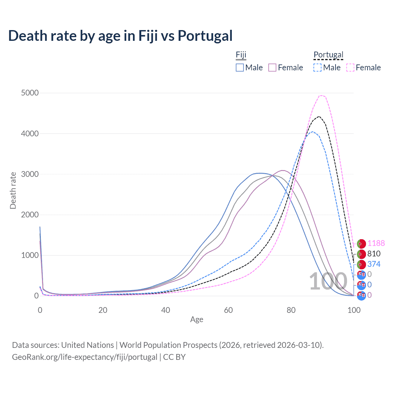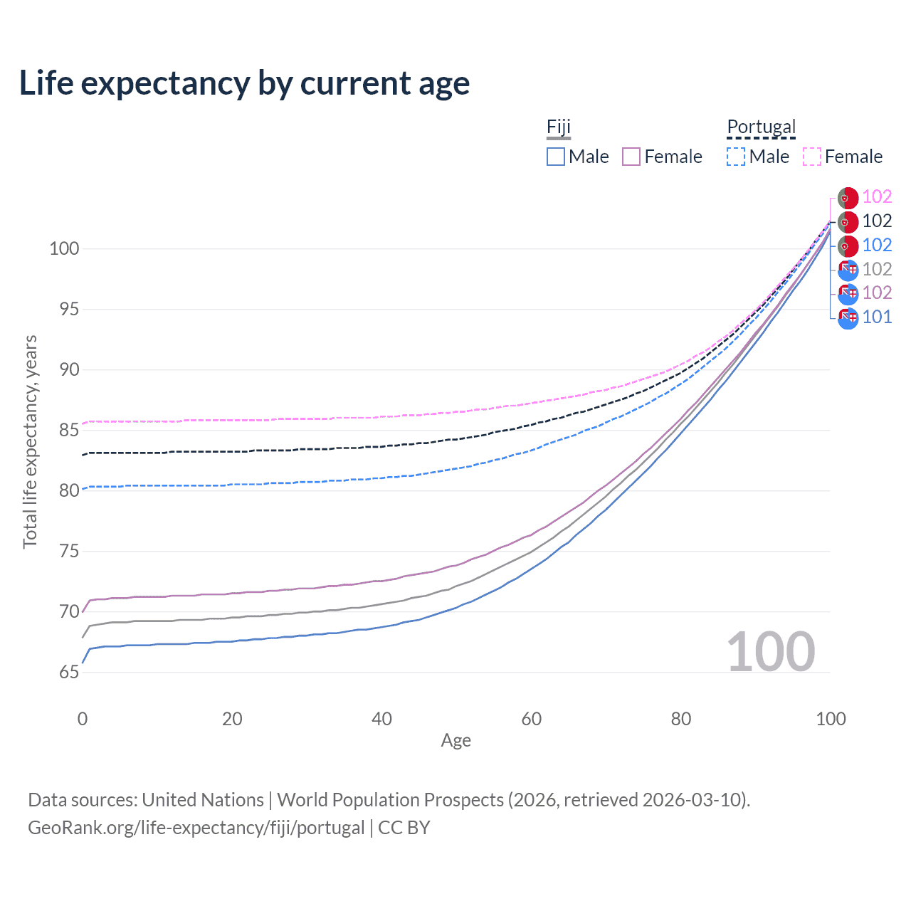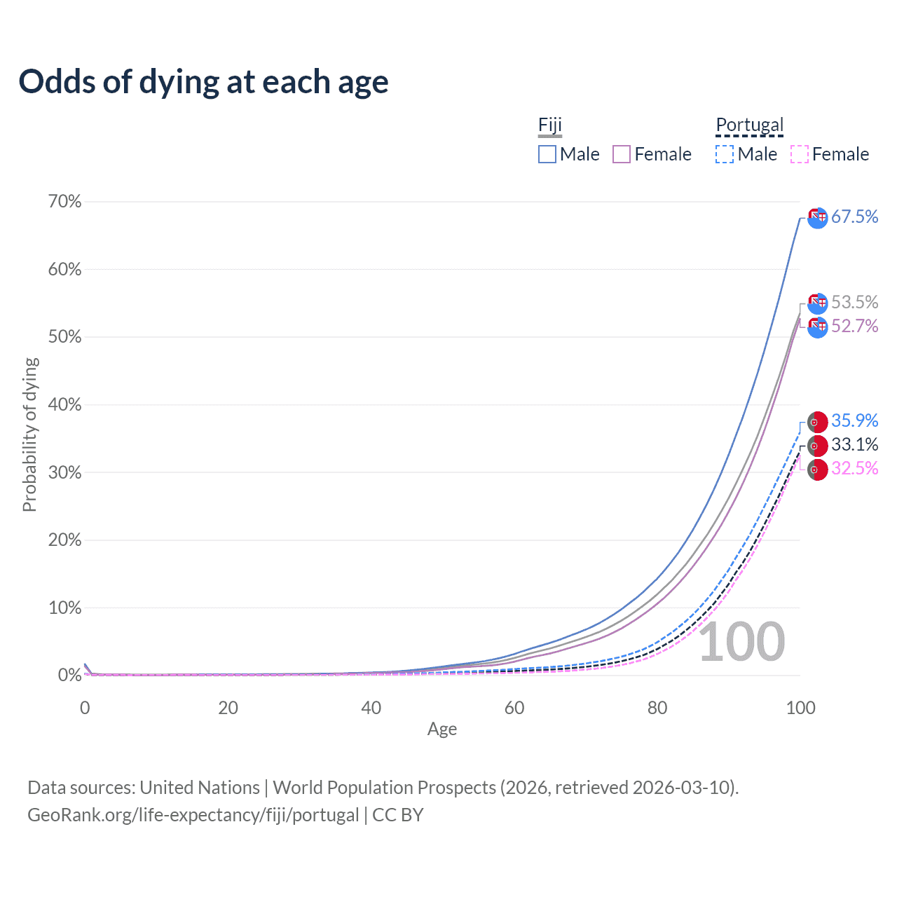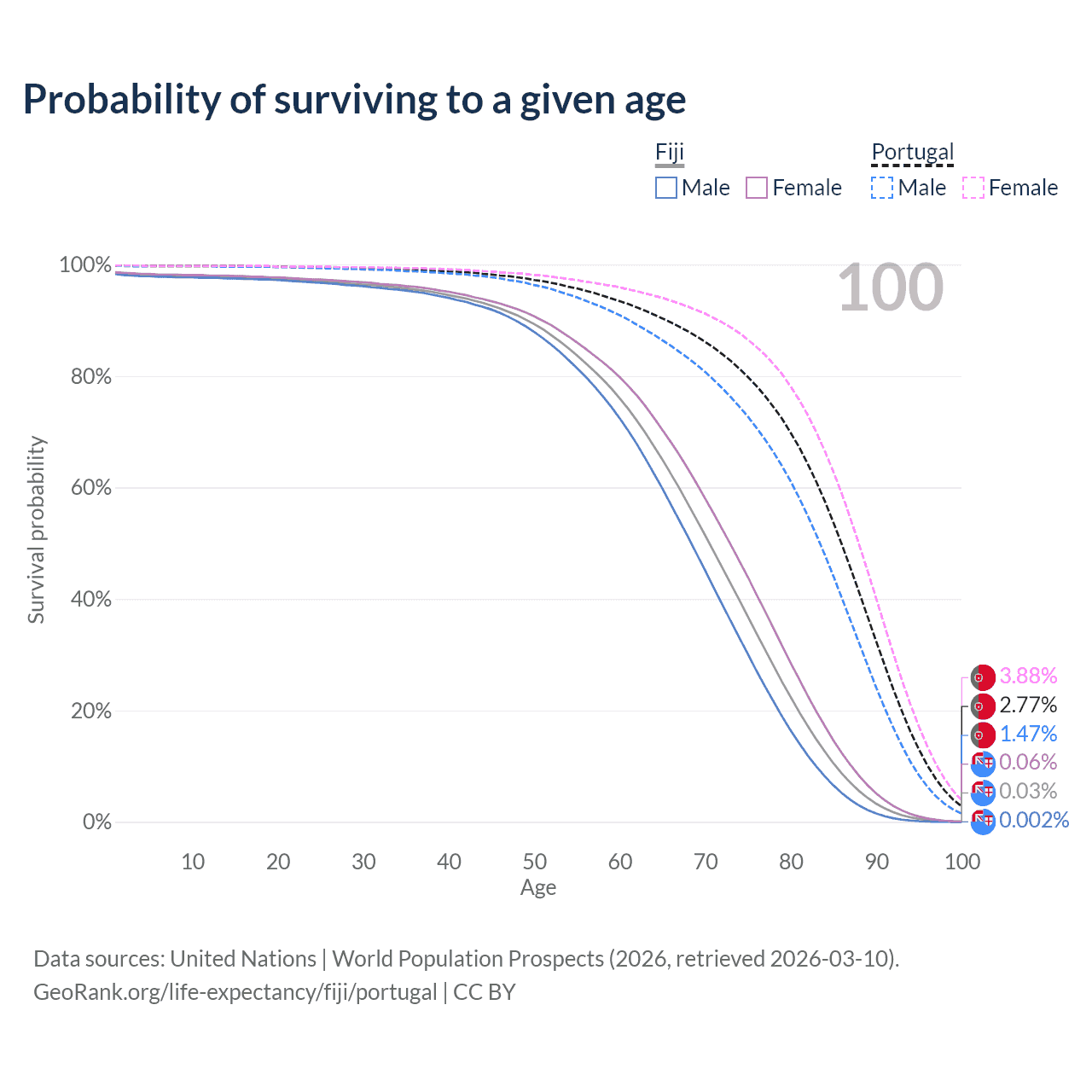 This life expectancy calculator shows the odds of living to 100, 95, 90, and below based on current age for both males and females in Fiji and Portugal, along with mean and median age of death. The calculations are based on the 2026 life tables (actuarial tables) from the UN World Population Prospects.