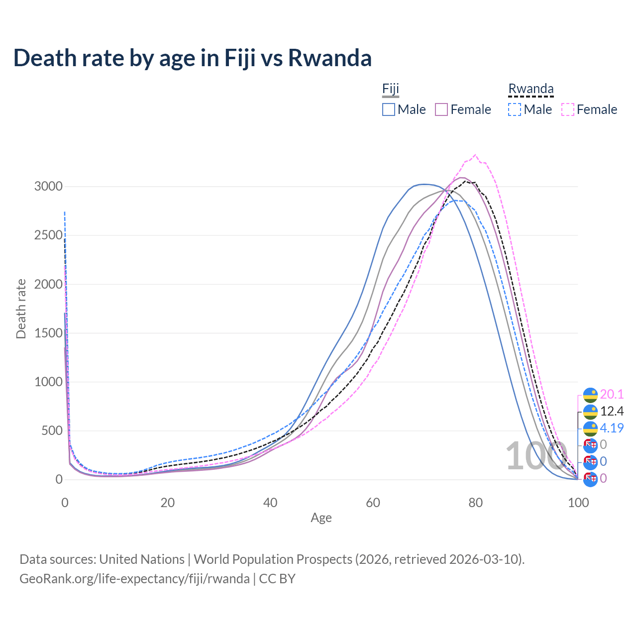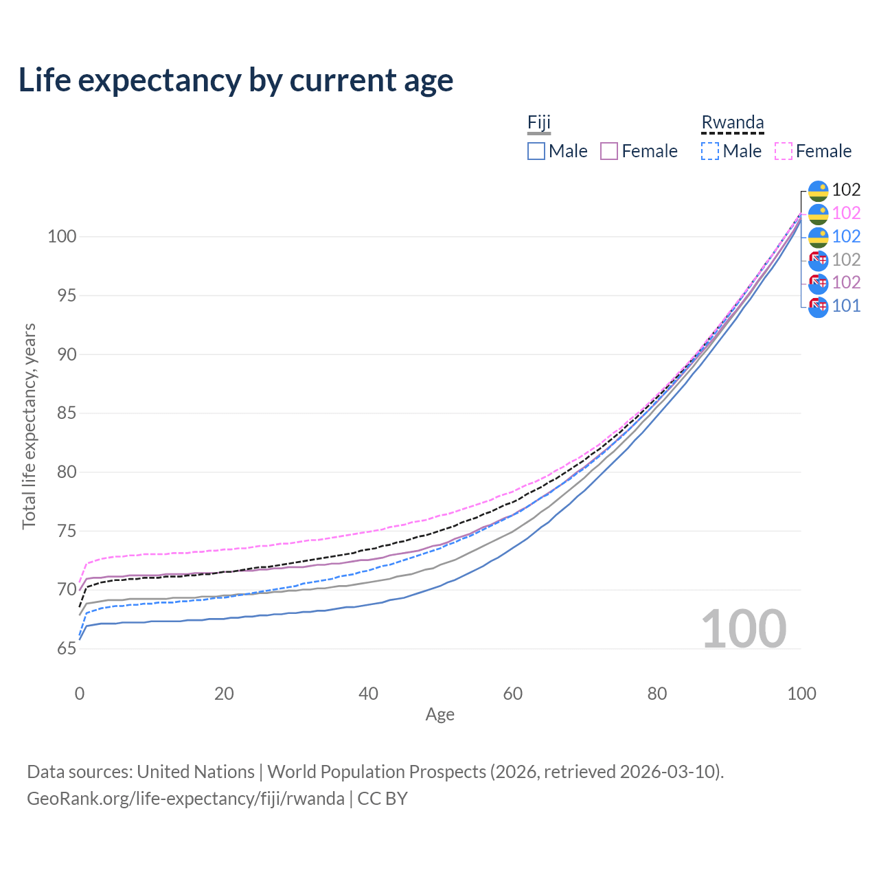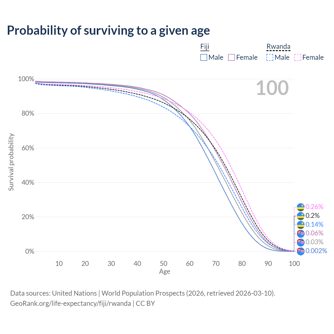 This life expectancy calculator shows the odds of living to 100, 95, 90, and below based on current age for both males and females in Fiji and Rwanda, along with mean and median age of death. The calculations are based on the 2026 life tables (actuarial tables) from the UN World Population Prospects.