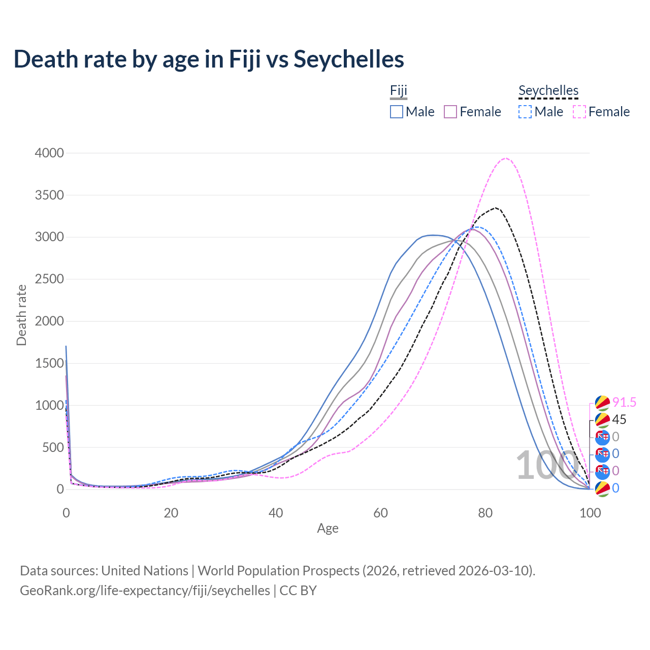 In Fiji, the most common age of death is 74, compared to 82 in the Seychelles. The median age of death is 70.5 in Fiji and 77 in the Seychelles, meaning only half of each cohort is expected to live past that age.