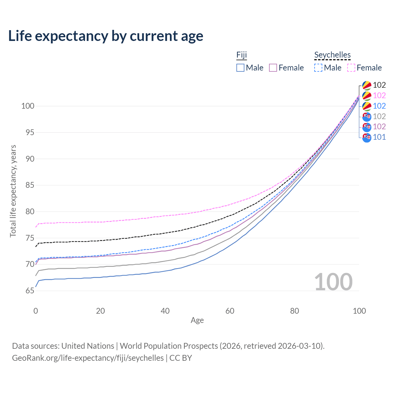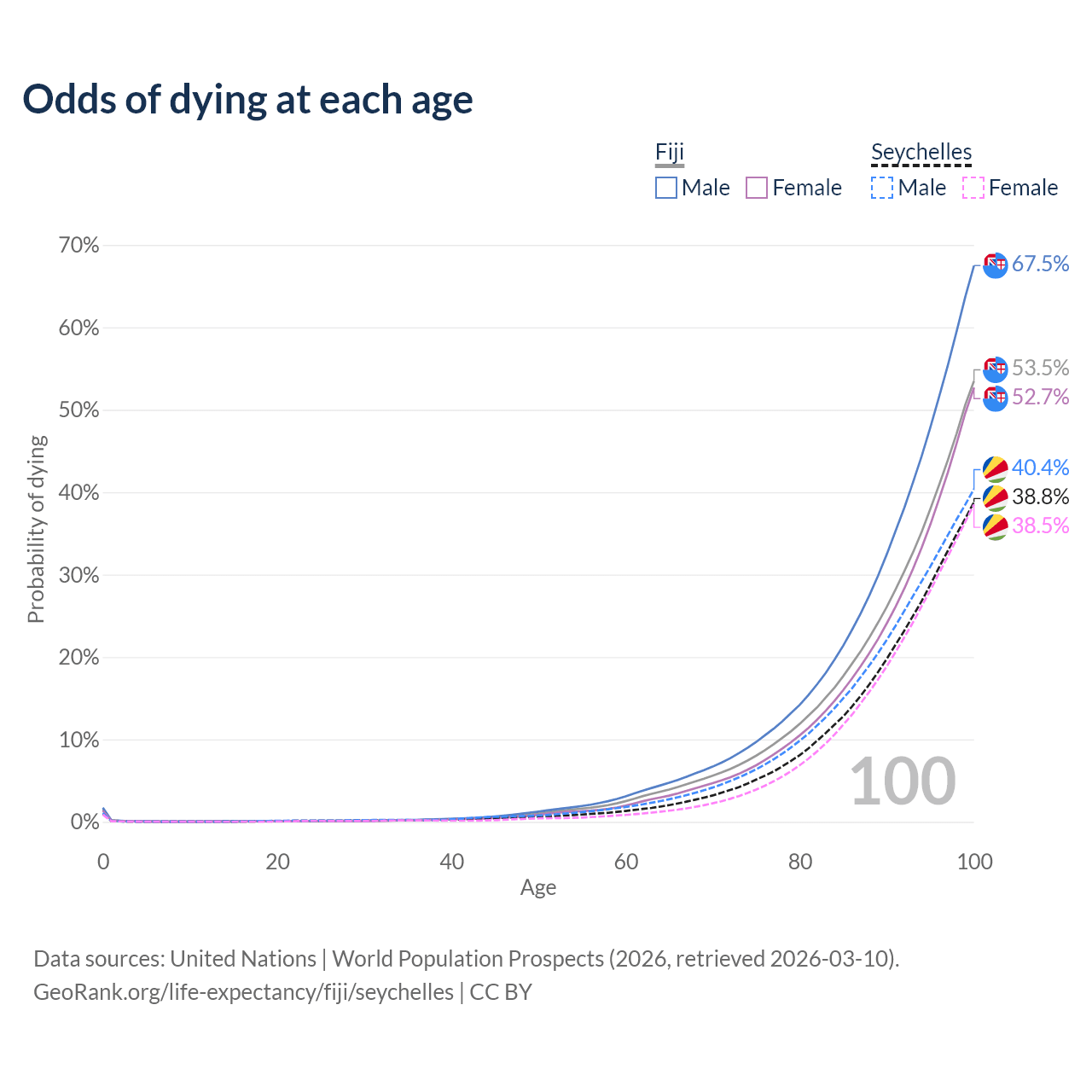 This life expectancy calculator shows the odds of living to 100, 95, 90, and below based on current age for both males and females in Fiji and the Seychelles, along with mean and median age of death. The calculations are based on the 2026 life tables (actuarial tables) from the UN World Population Prospects.