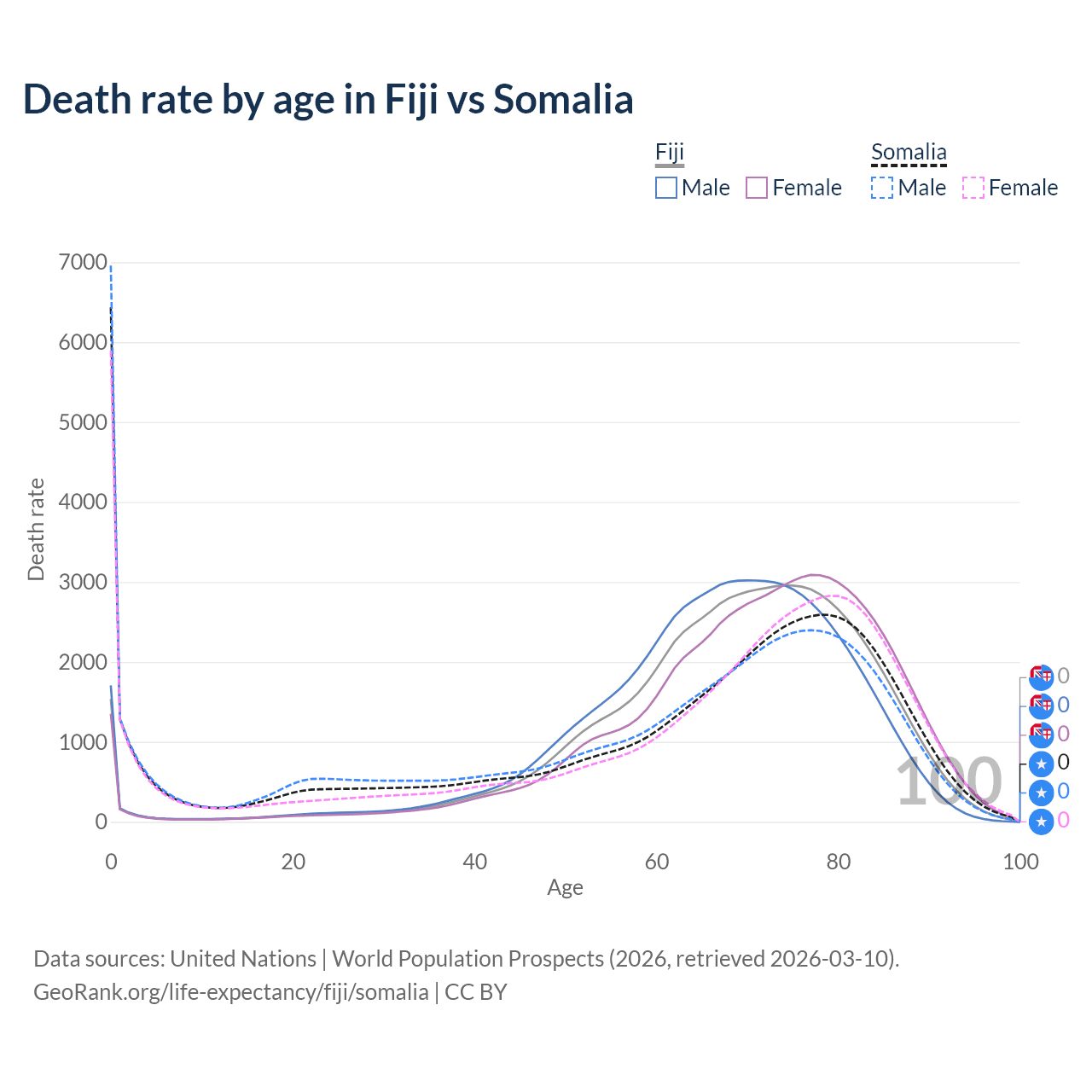 In Fiji, the most common age of death is 74, compared to 0 in Somalia. The median age of death is 70.5 in Fiji and 69 in Somalia, meaning only half of each cohort is expected to live past that age.