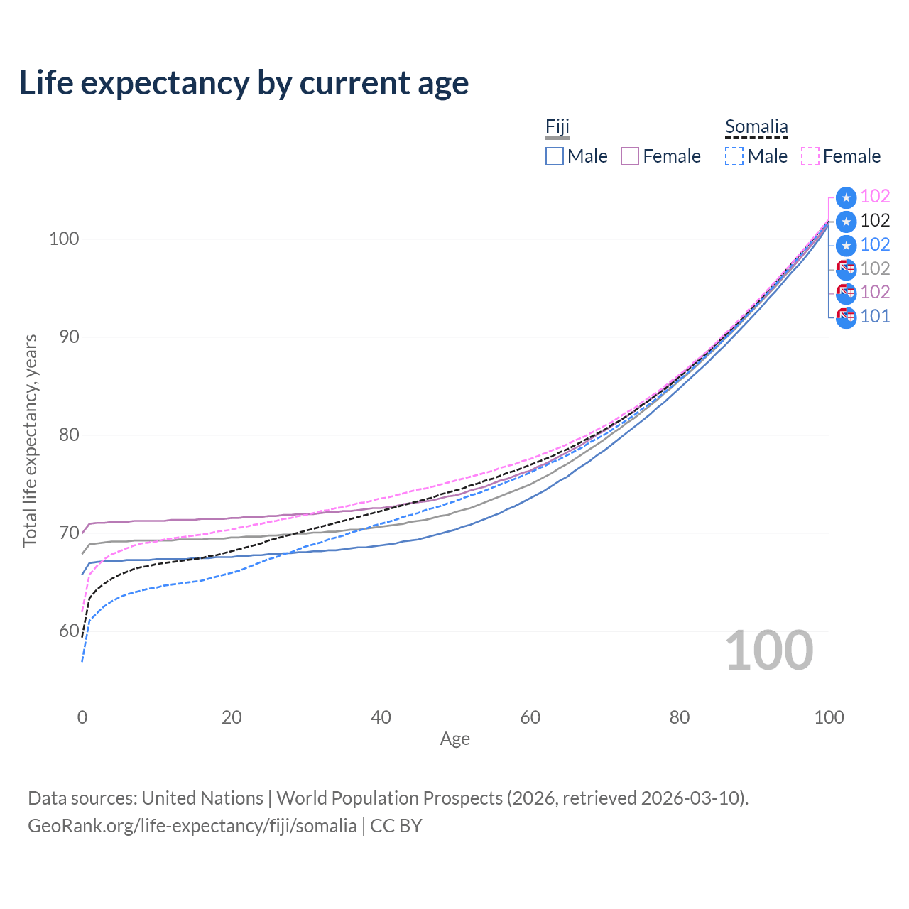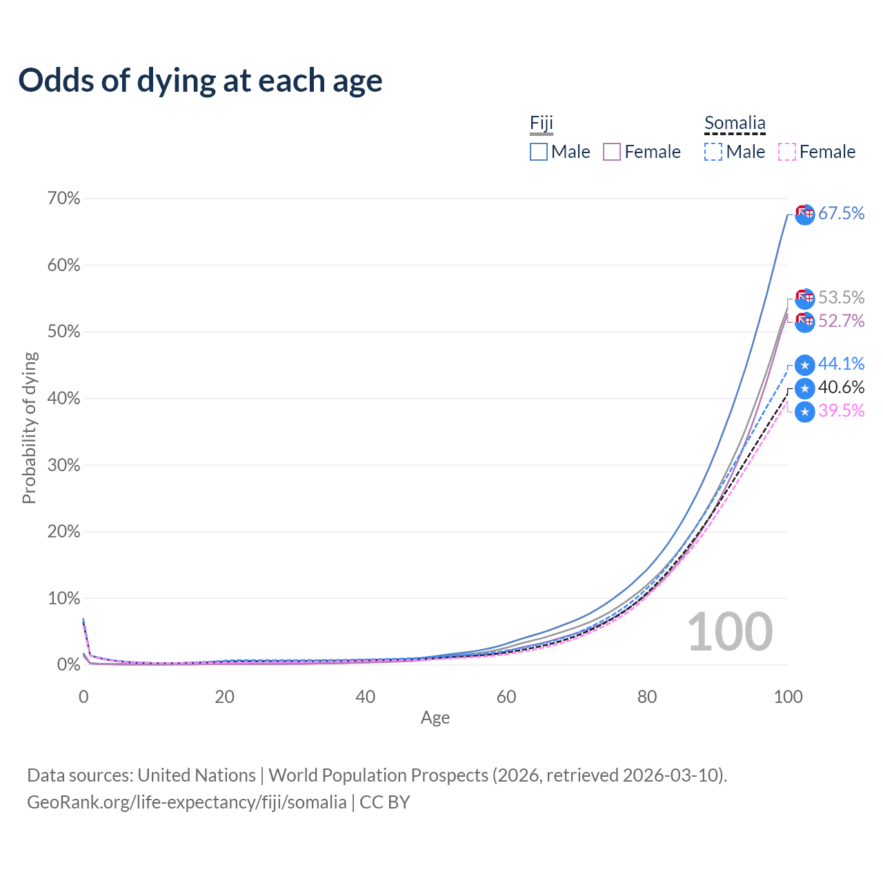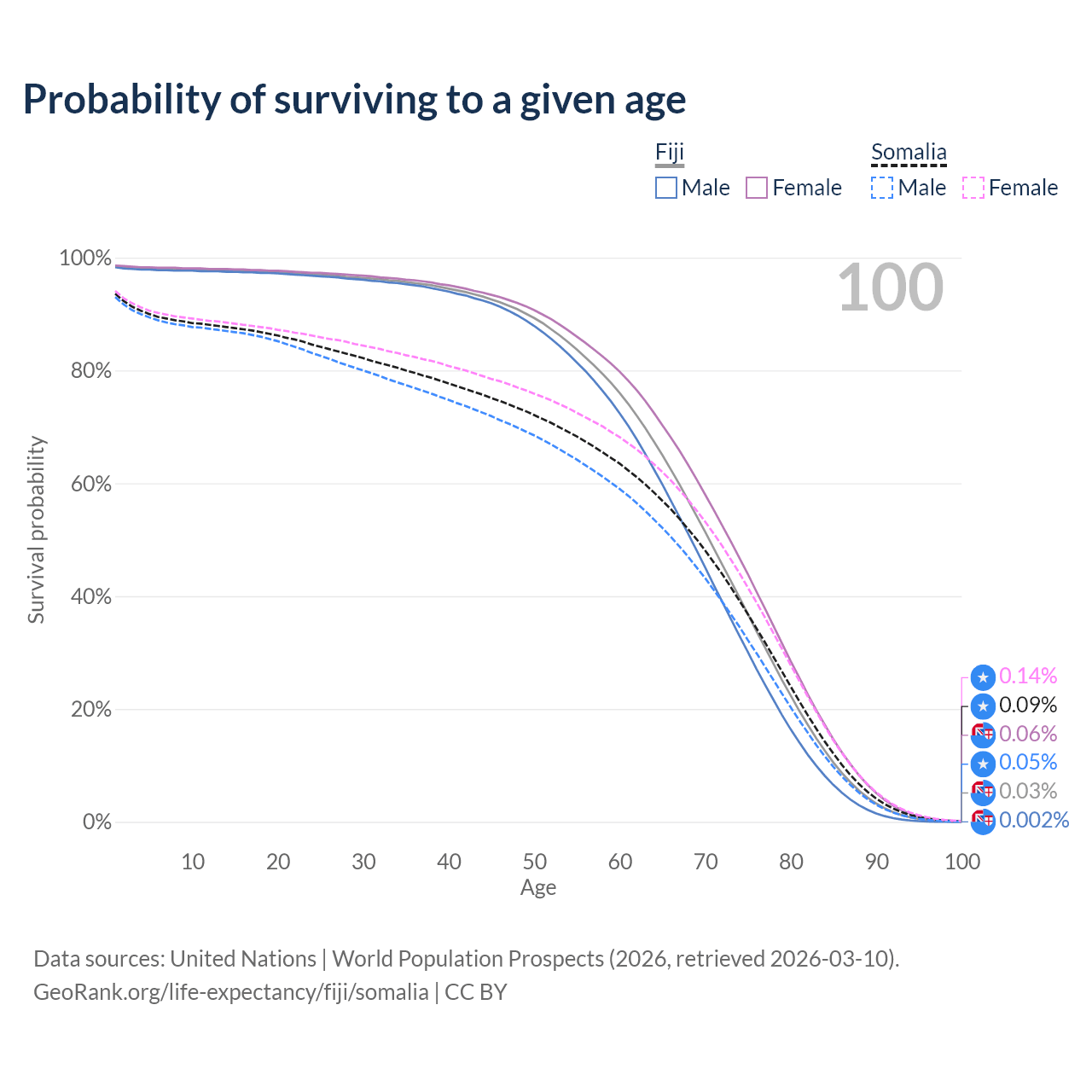 This life expectancy calculator shows the odds of living to 100, 95, 90, and below based on current age for both males and females in Fiji and Somalia, along with mean and median age of death. The calculations are based on the 2026 life tables (actuarial tables) from the UN World Population Prospects.