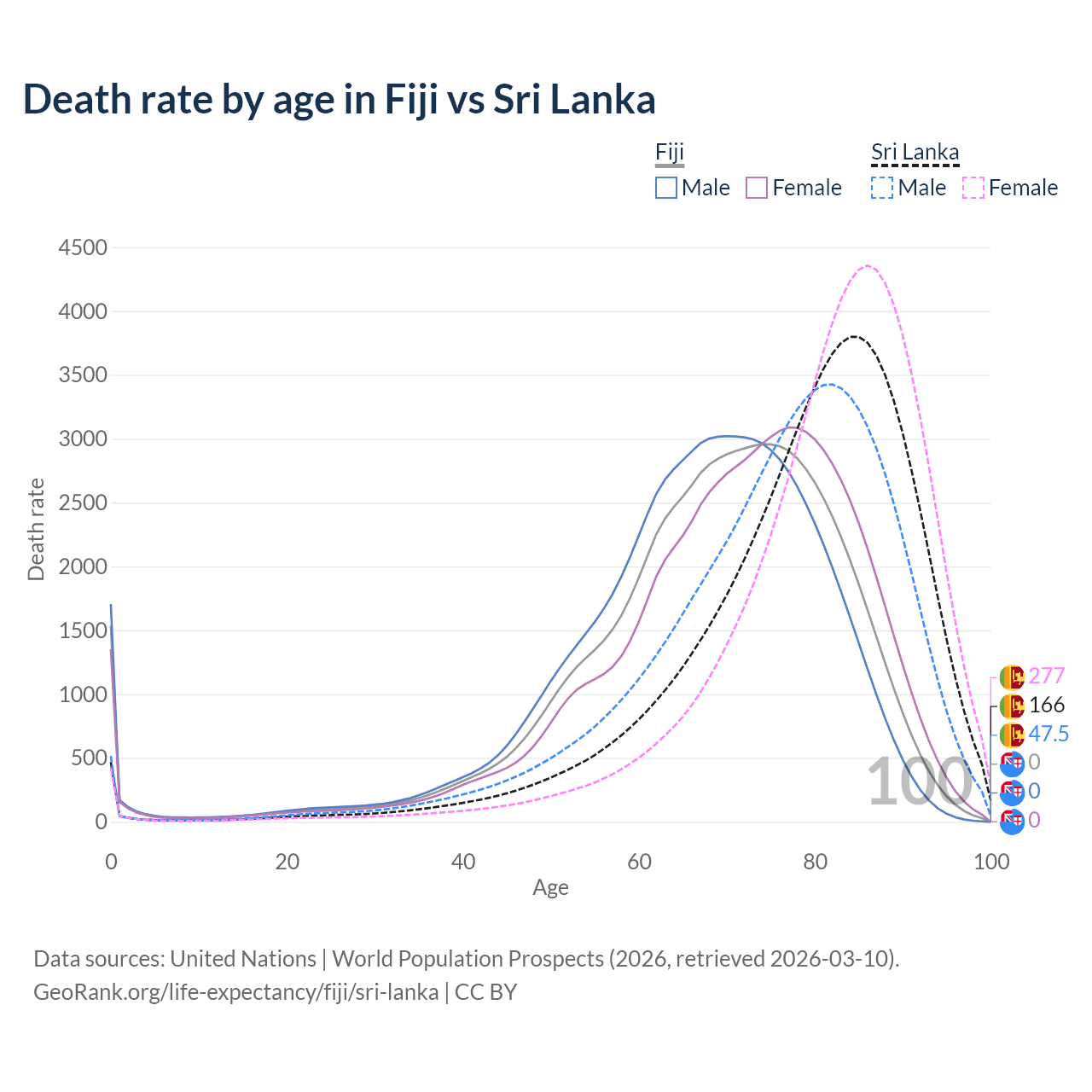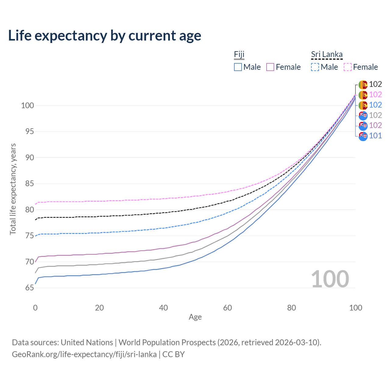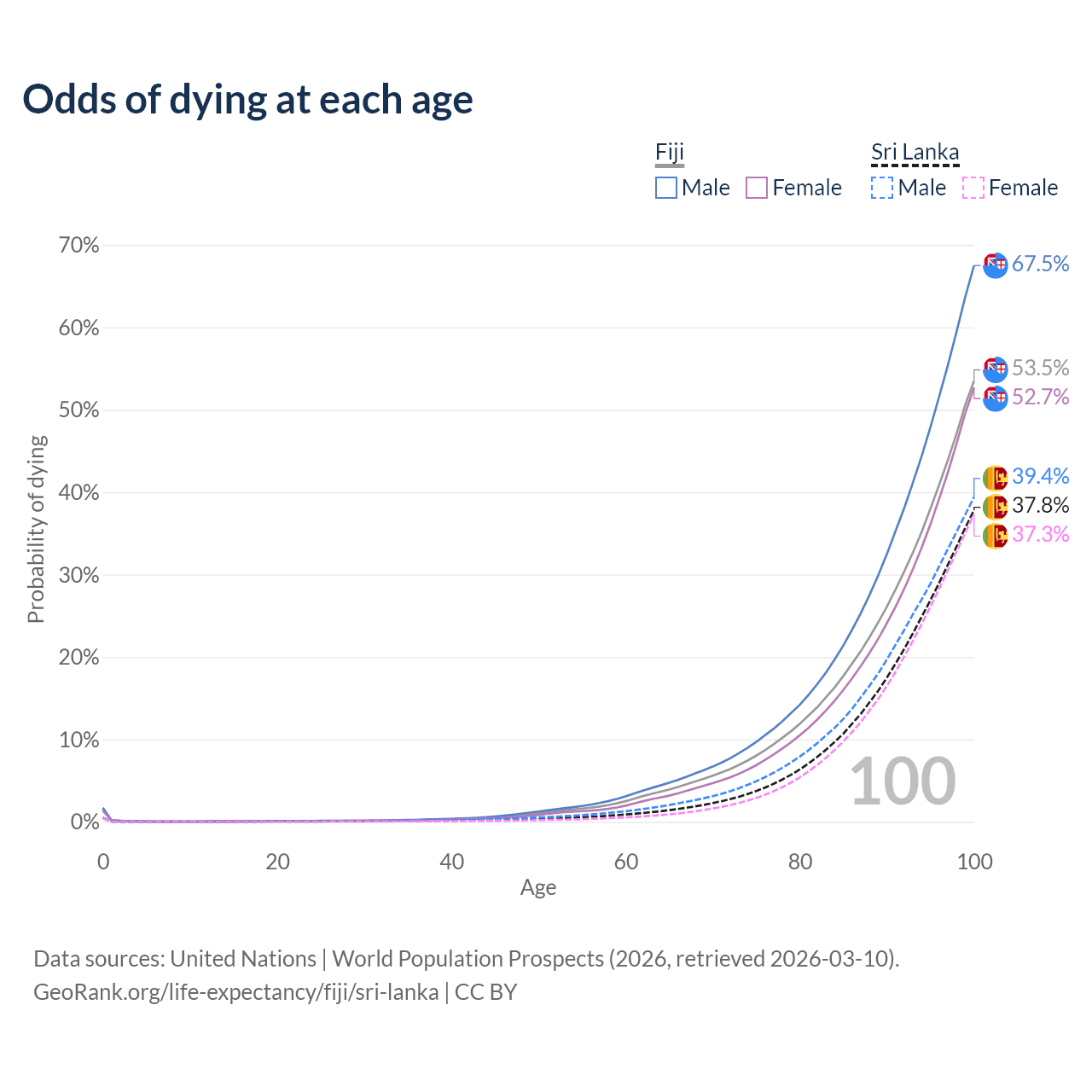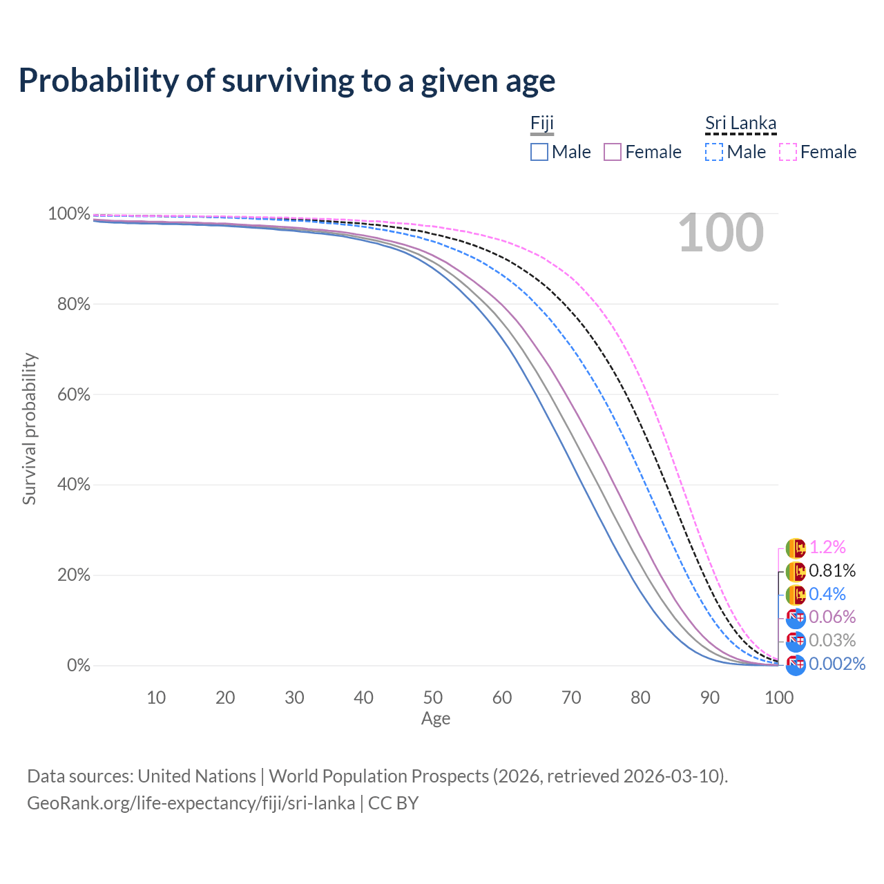 This life expectancy calculator shows the odds of living to 100, 95, 90, and below based on current age for both males and females in Fiji and Sri Lanka, along with mean and median age of death. The calculations are based on the 2026 life tables (actuarial tables) from the UN World Population Prospects.