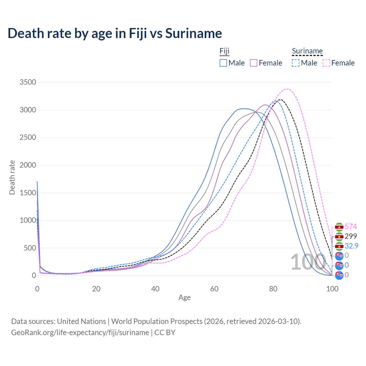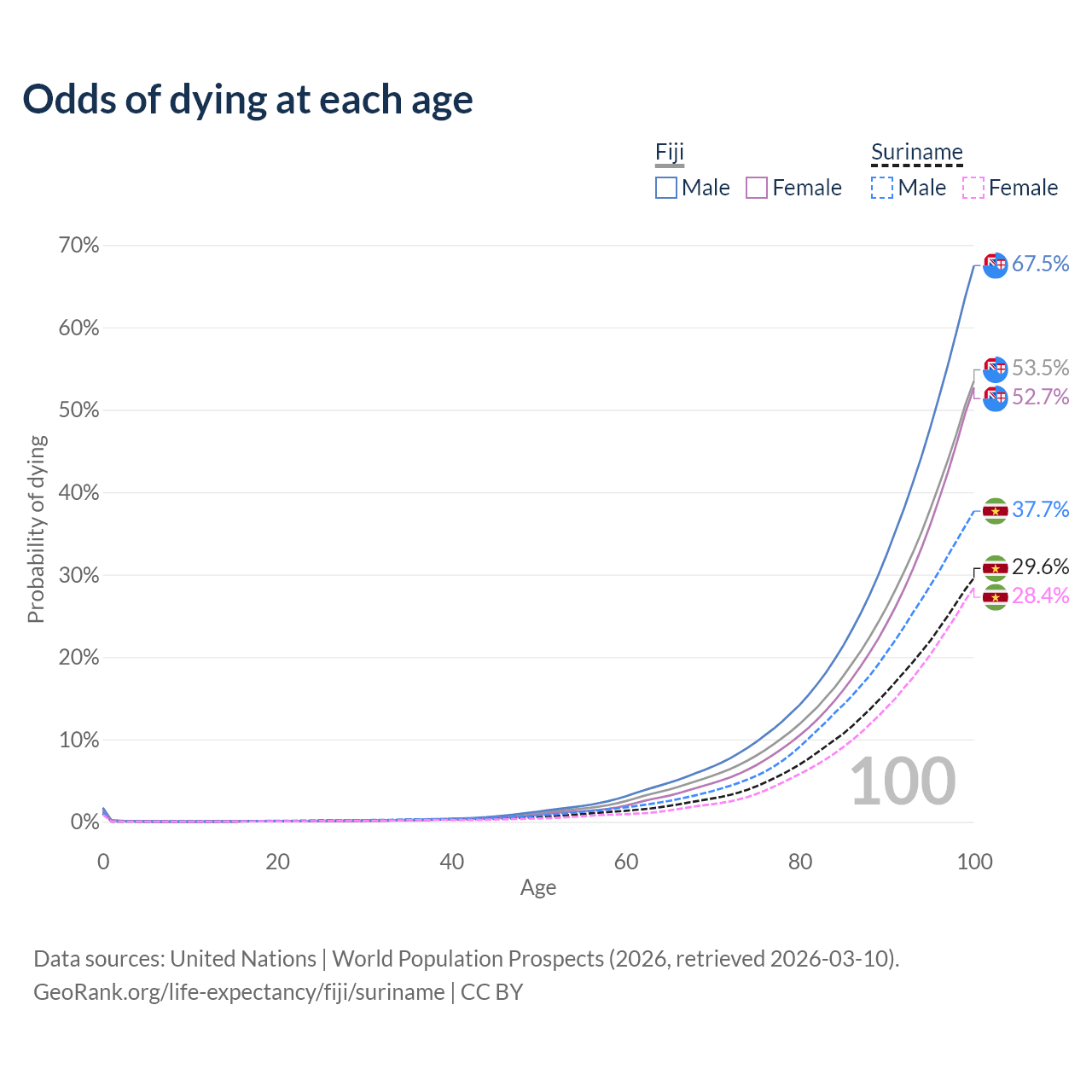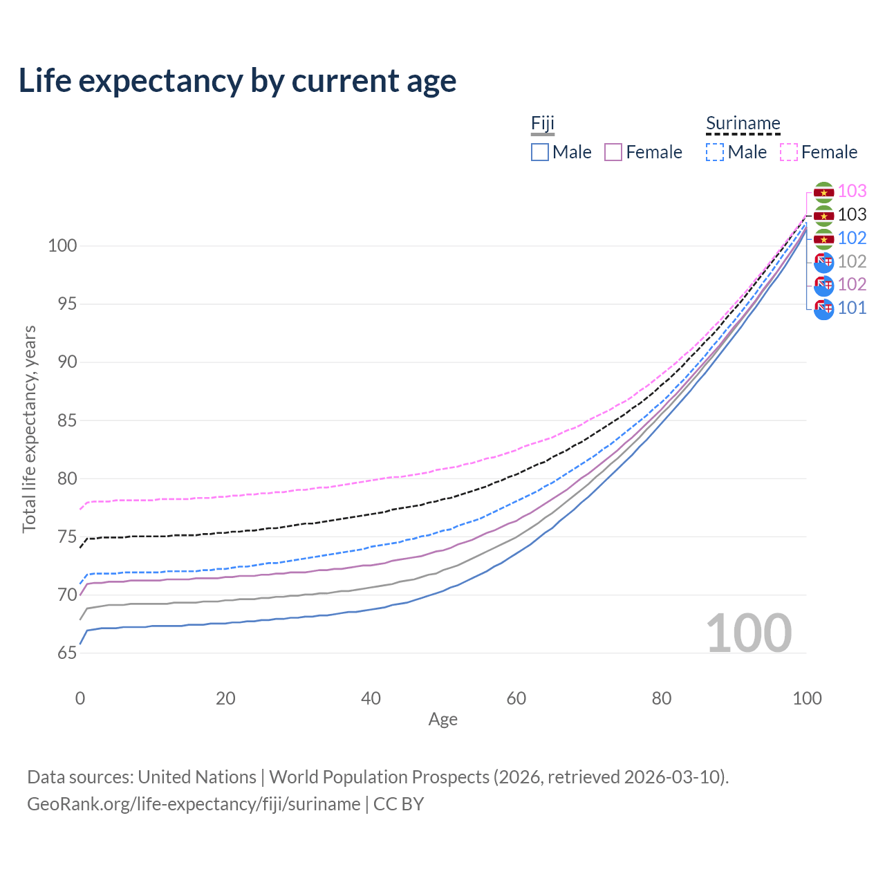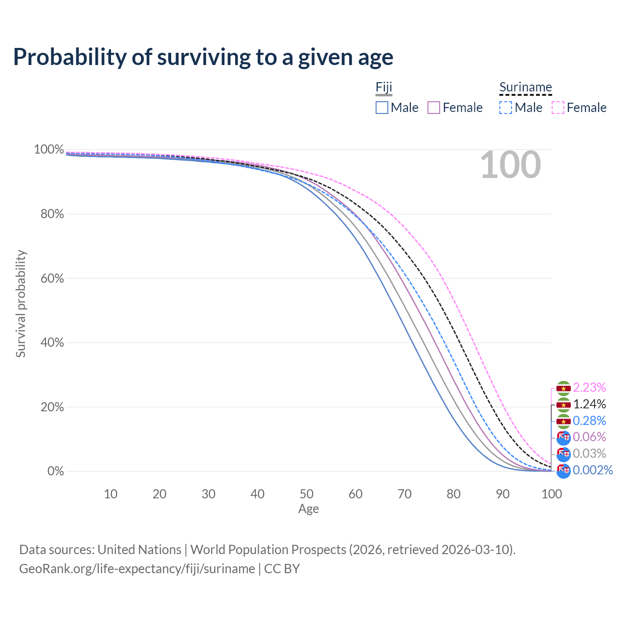 This life expectancy calculator shows the odds of living to 100, 95, 90, and below based on current age for both males and females in Fiji and Suriname, along with mean and median age of death. The calculations are based on the 2026 life tables (actuarial tables) from the UN World Population Prospects.