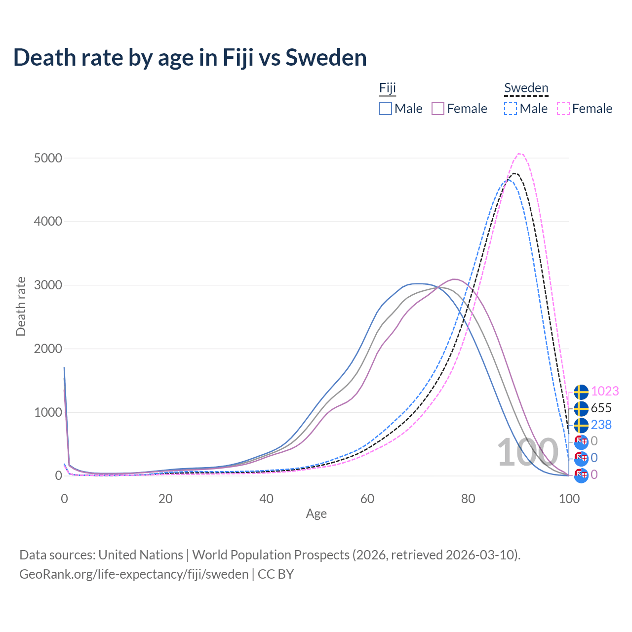 In Fiji, the most common age of death is 74, compared to 89 in Sweden. The median age of death is 70.5 in Fiji and 86.5 in Sweden, meaning only half of each cohort is expected to live past that age.