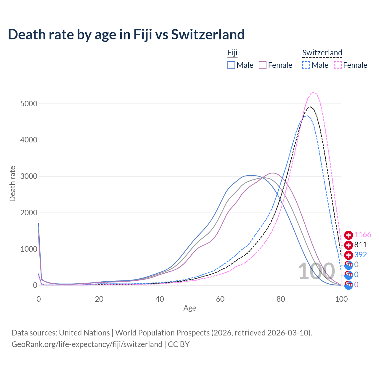 In Fiji, the most common age of death is 74, compared to 90 in Switzerland. The median age of death is 70.5 in Fiji and 87.2 in Switzerland, meaning only half of each cohort is expected to live past that age.
