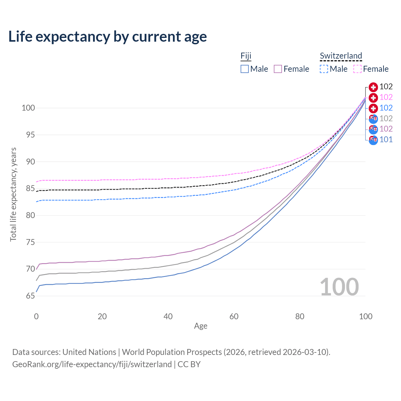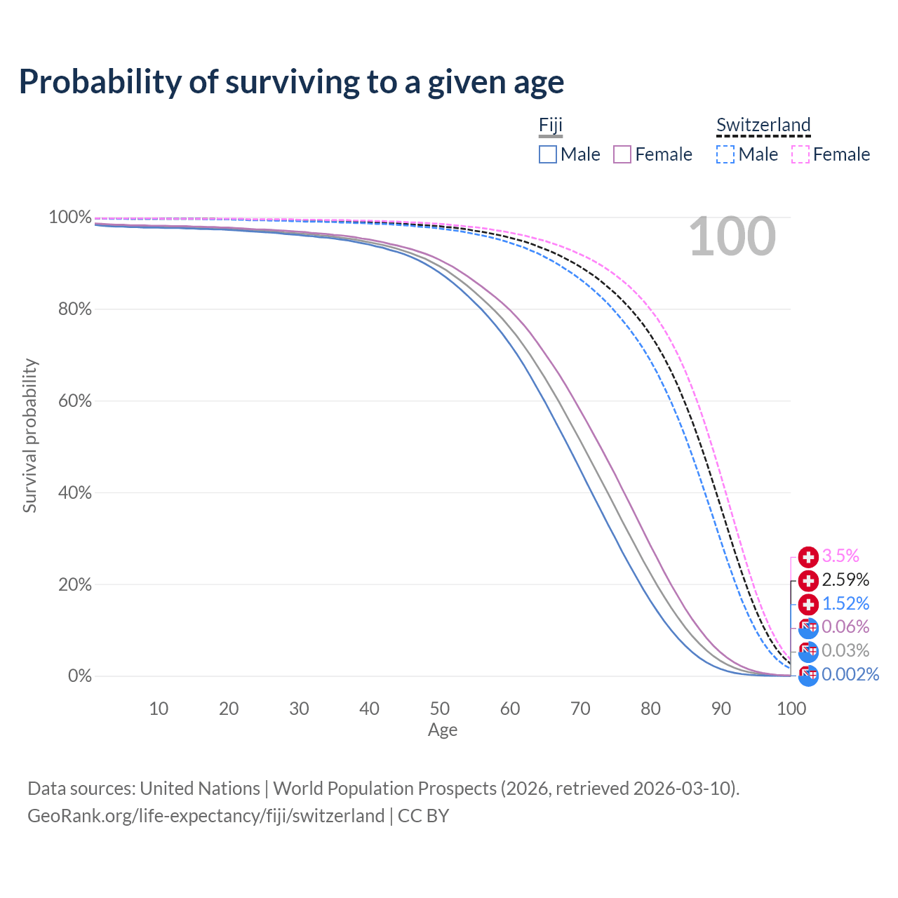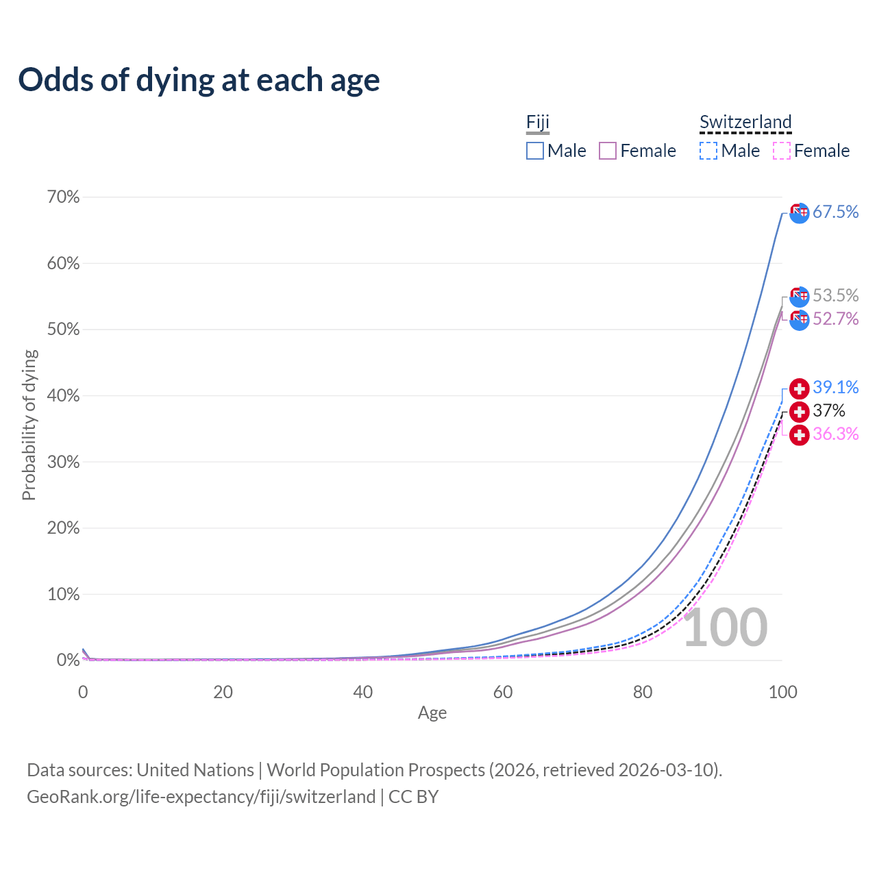 This life expectancy calculator shows the odds of living to 100, 95, 90, and below based on current age for both males and females in Fiji and Switzerland, along with mean and median age of death. The calculations are based on the 2026 life tables (actuarial tables) from the UN World Population Prospects.