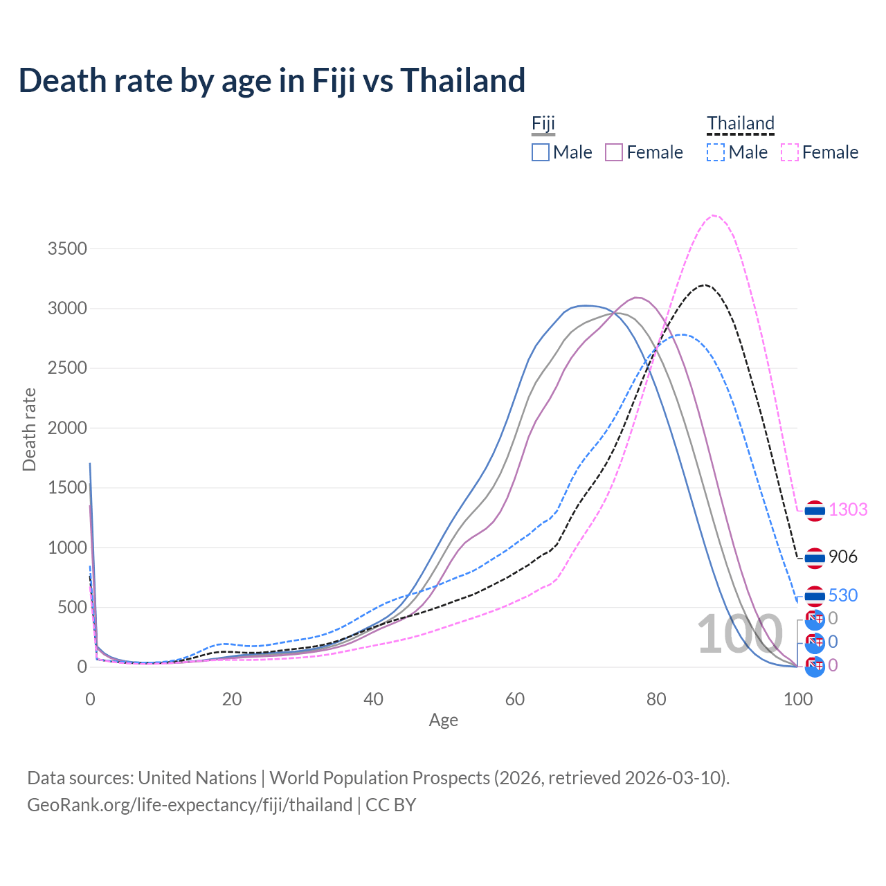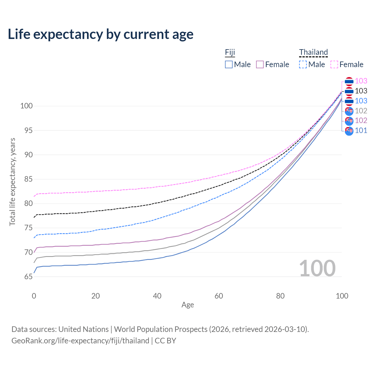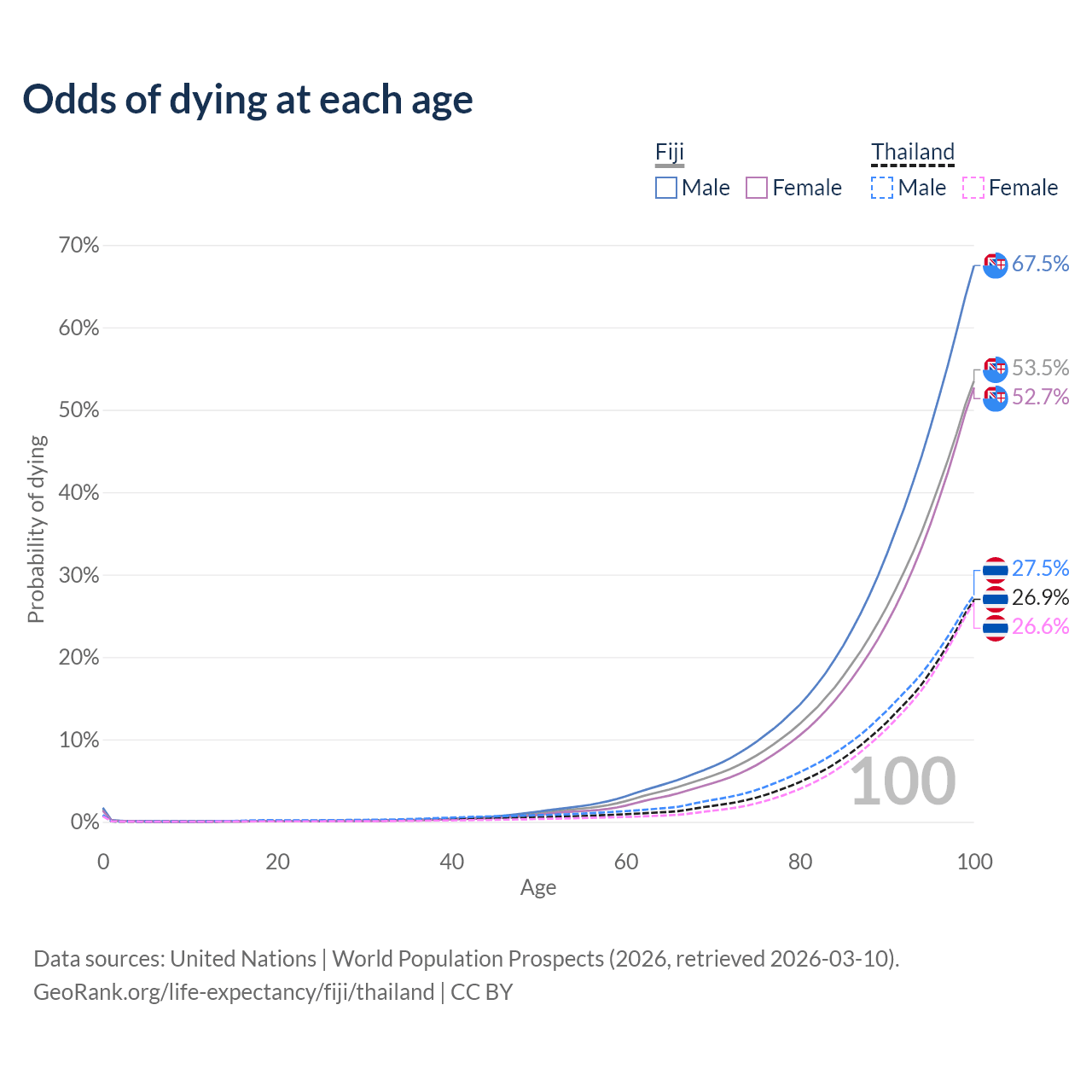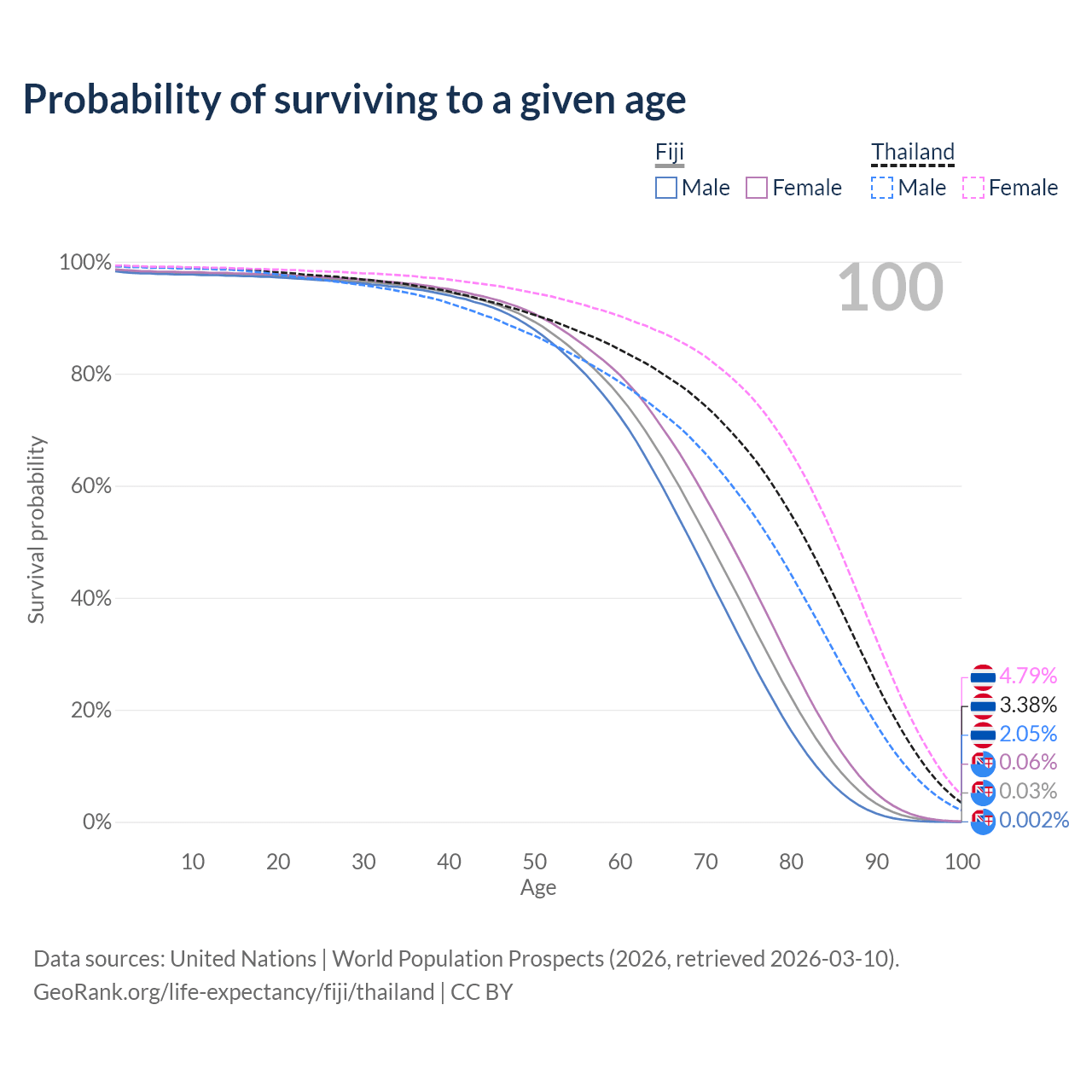 This life expectancy calculator shows the odds of living to 100, 95, 90, and below based on current age for both males and females in Fiji and Thailand, along with mean and median age of death. The calculations are based on the 2026 life tables (actuarial tables) from the UN World Population Prospects.
