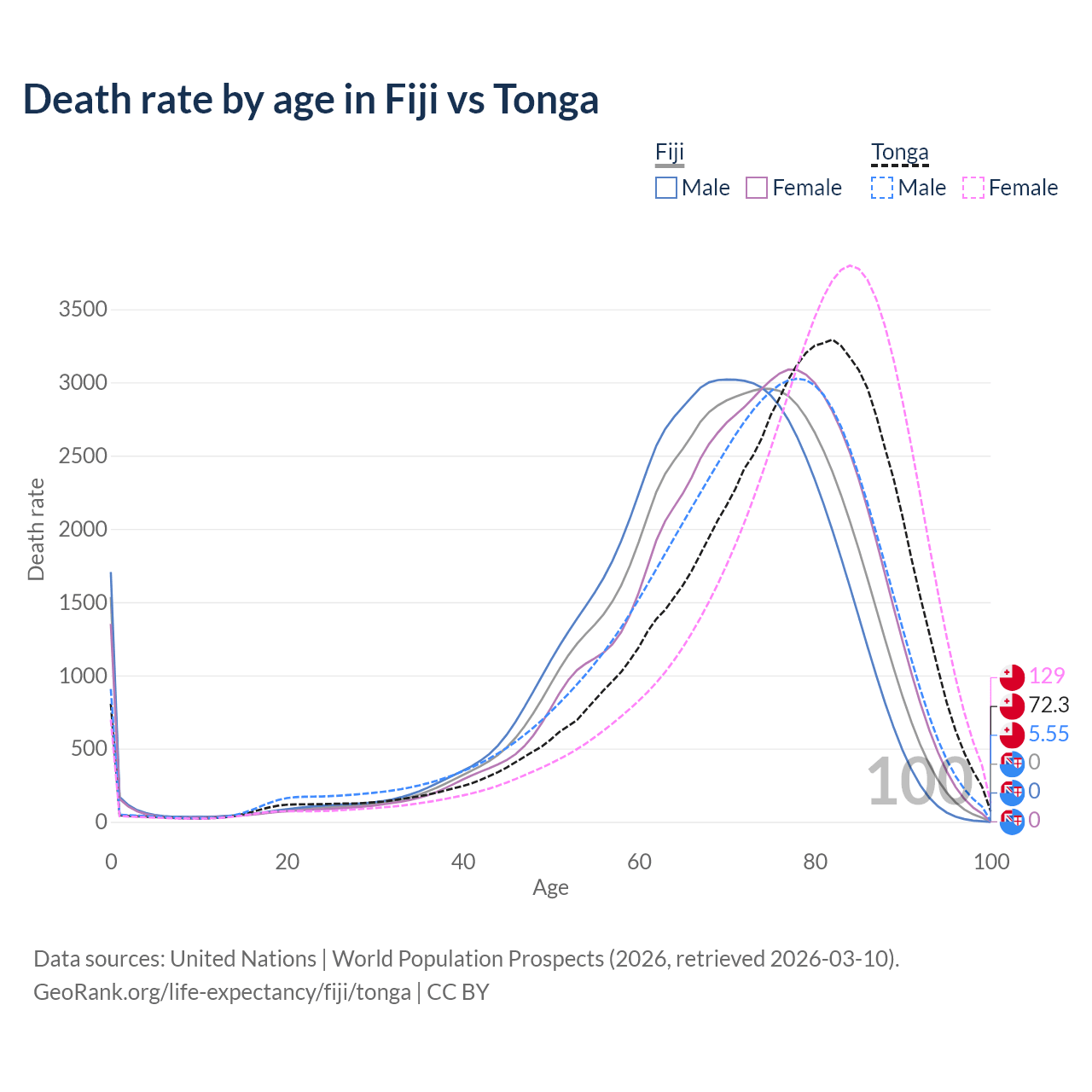 In Fiji, the most common age of death is 74, compared to 82 in Tonga. The median age of death is 70.5 in Fiji and 77 in Tonga, meaning only half of each cohort is expected to live past that age.