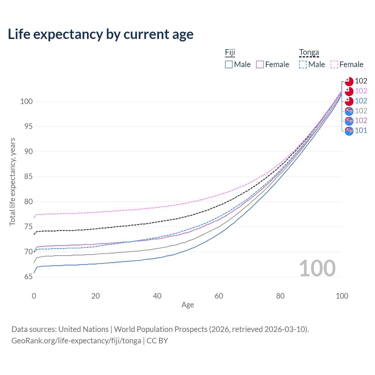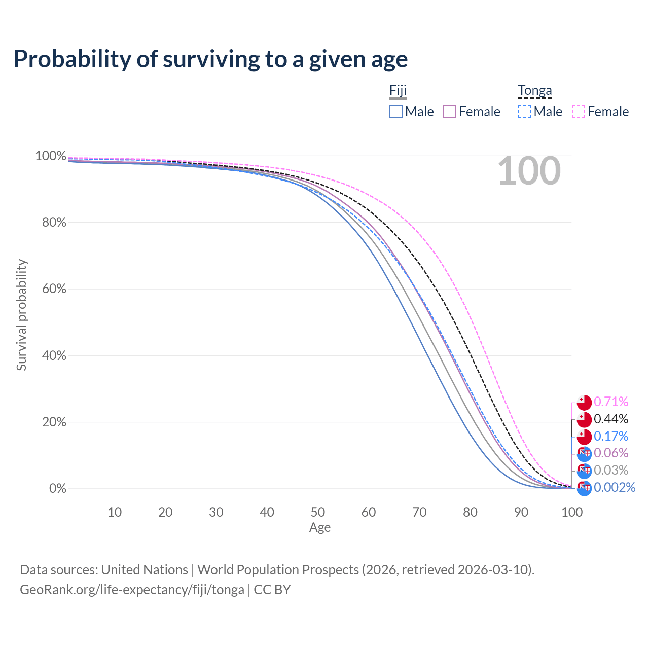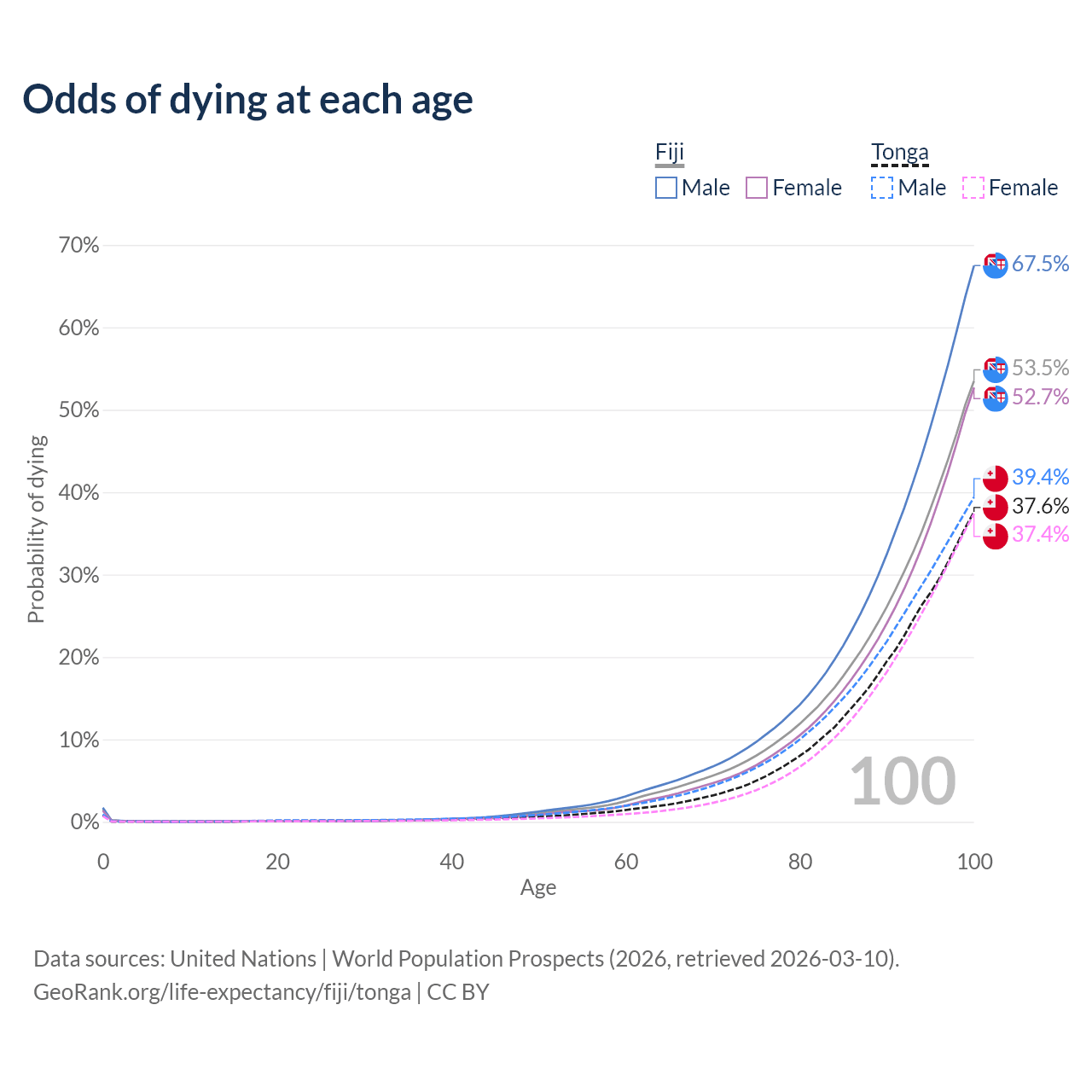 This life expectancy calculator shows the odds of living to 100, 95, 90, and below based on current age for both males and females in Fiji and Tonga, along with mean and median age of death. The calculations are based on the 2026 life tables (actuarial tables) from the UN World Population Prospects.