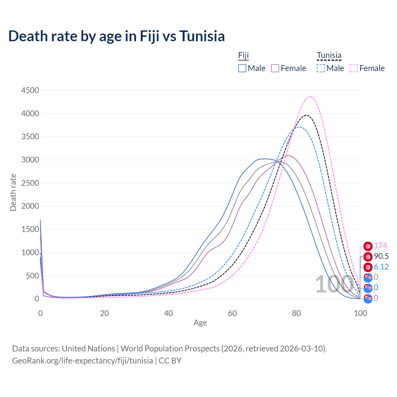 In Fiji, the most common age of death is 74, compared to 83 in Tunisia. The median age of death is 70.5 in Fiji and 80.2 in Tunisia, meaning only half of each cohort is expected to live past that age.