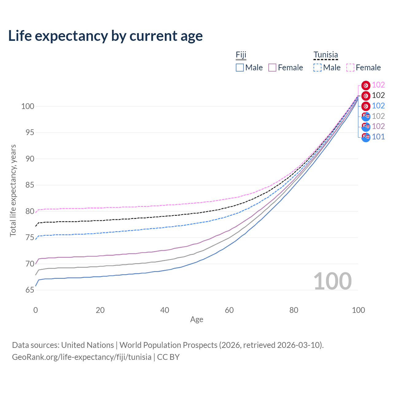 This life expectancy calculator shows the odds of living to 100, 95, 90, and below based on current age for both males and females in Fiji and Tunisia, along with mean and median age of death. The calculations are based on the 2026 life tables (actuarial tables) from the UN World Population Prospects.