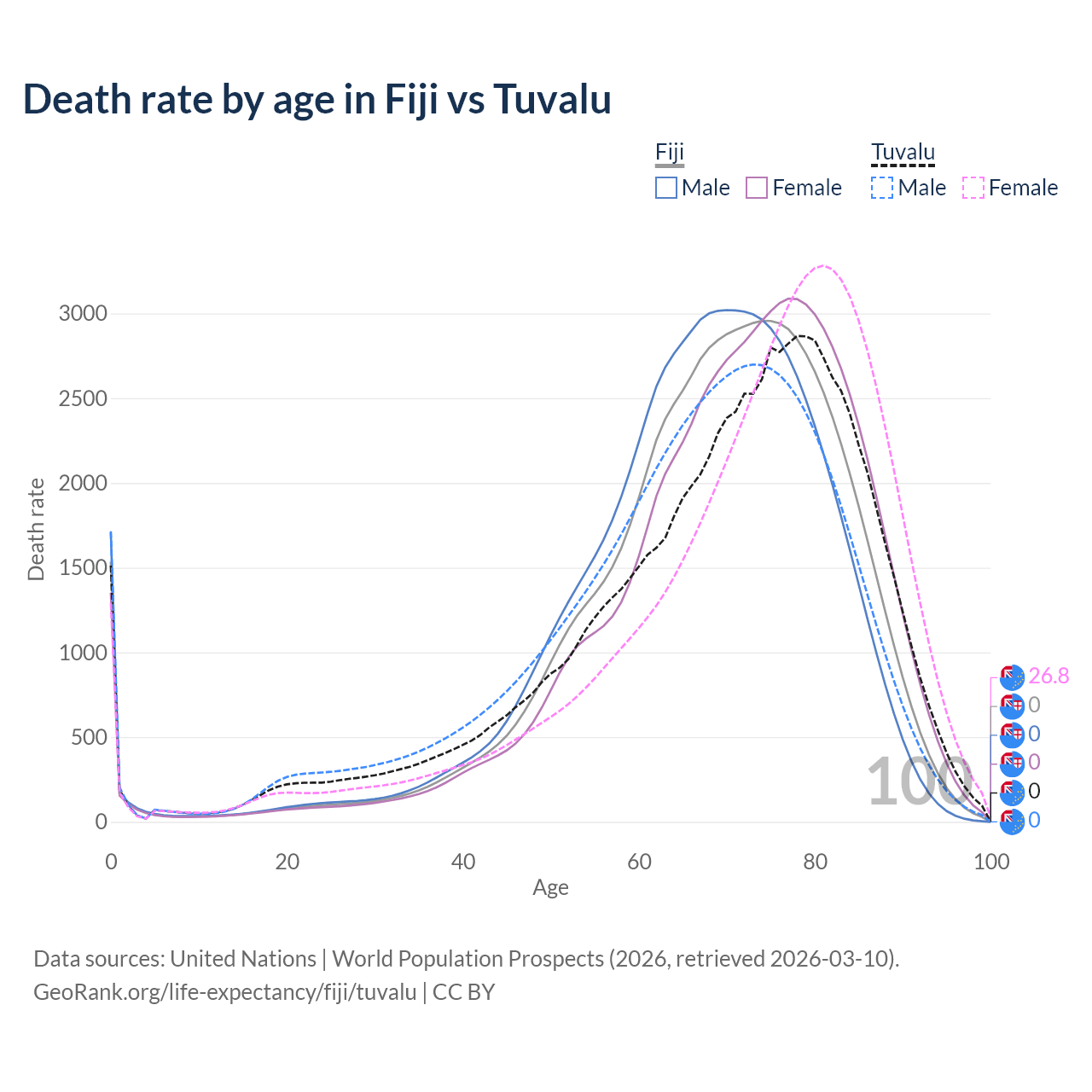 In Fiji, the most common age of death is 74, compared to 78 in Tuvalu. The median age of death is 70.5 in Fiji and 71.9 in Tuvalu, meaning only half of each cohort is expected to live past that age.