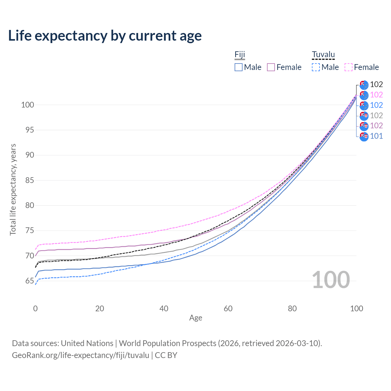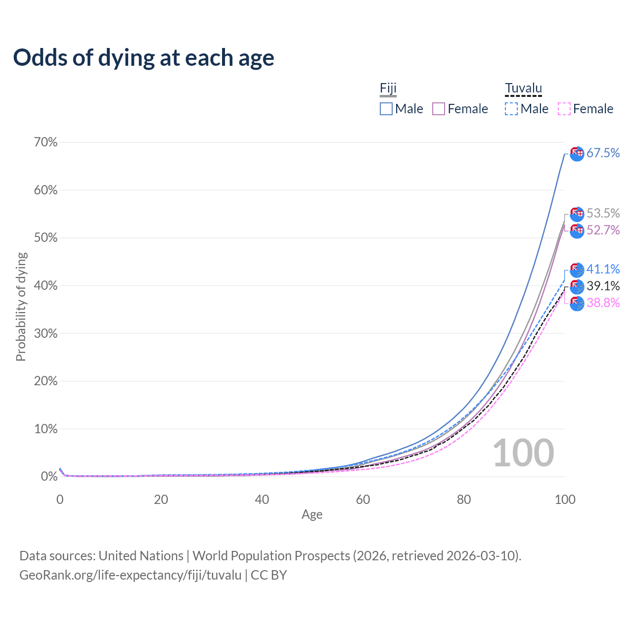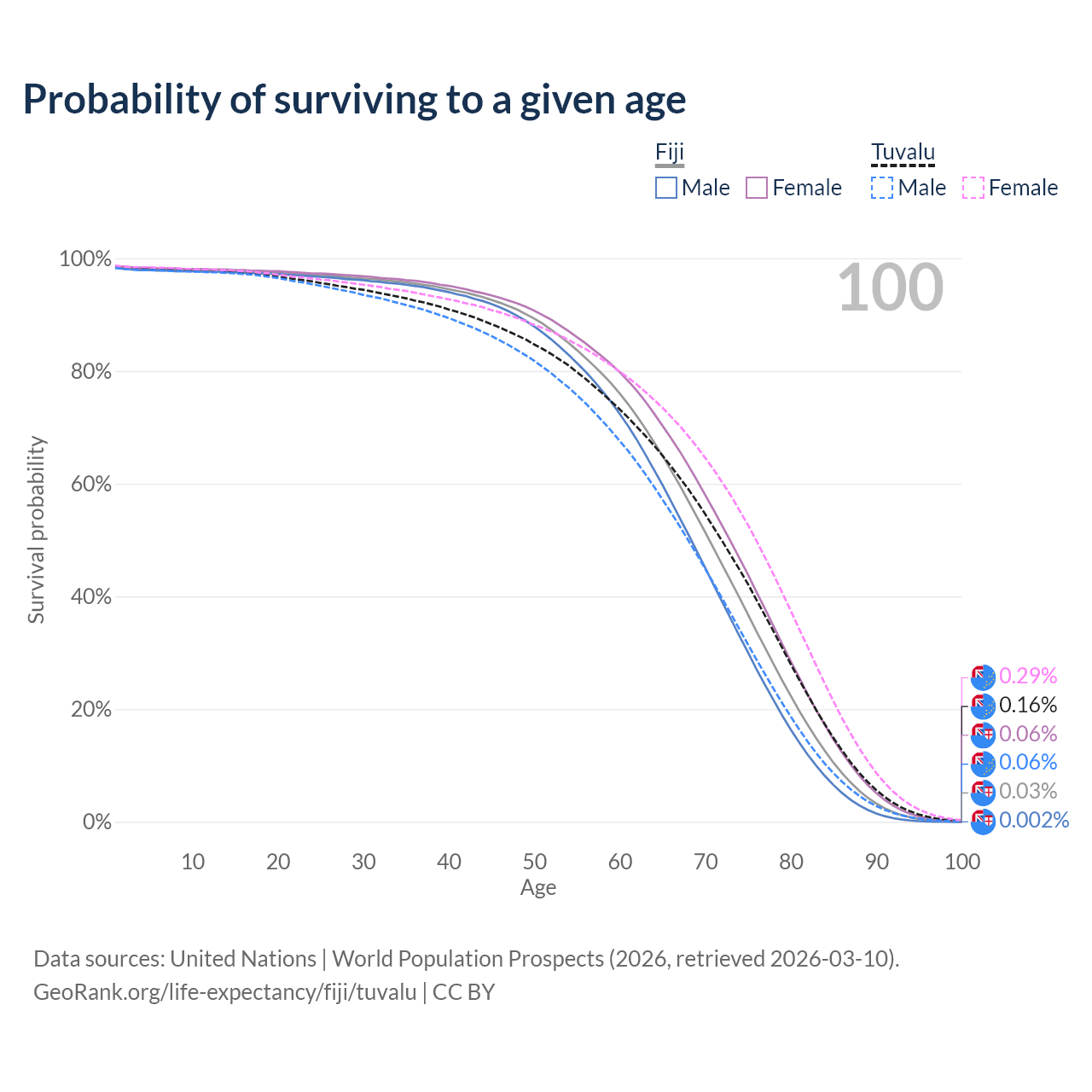 This life expectancy calculator shows the odds of living to 100, 95, 90, and below based on current age for both males and females in Fiji and Tuvalu, along with mean and median age of death. The calculations are based on the 2026 life tables (actuarial tables) from the UN World Population Prospects.