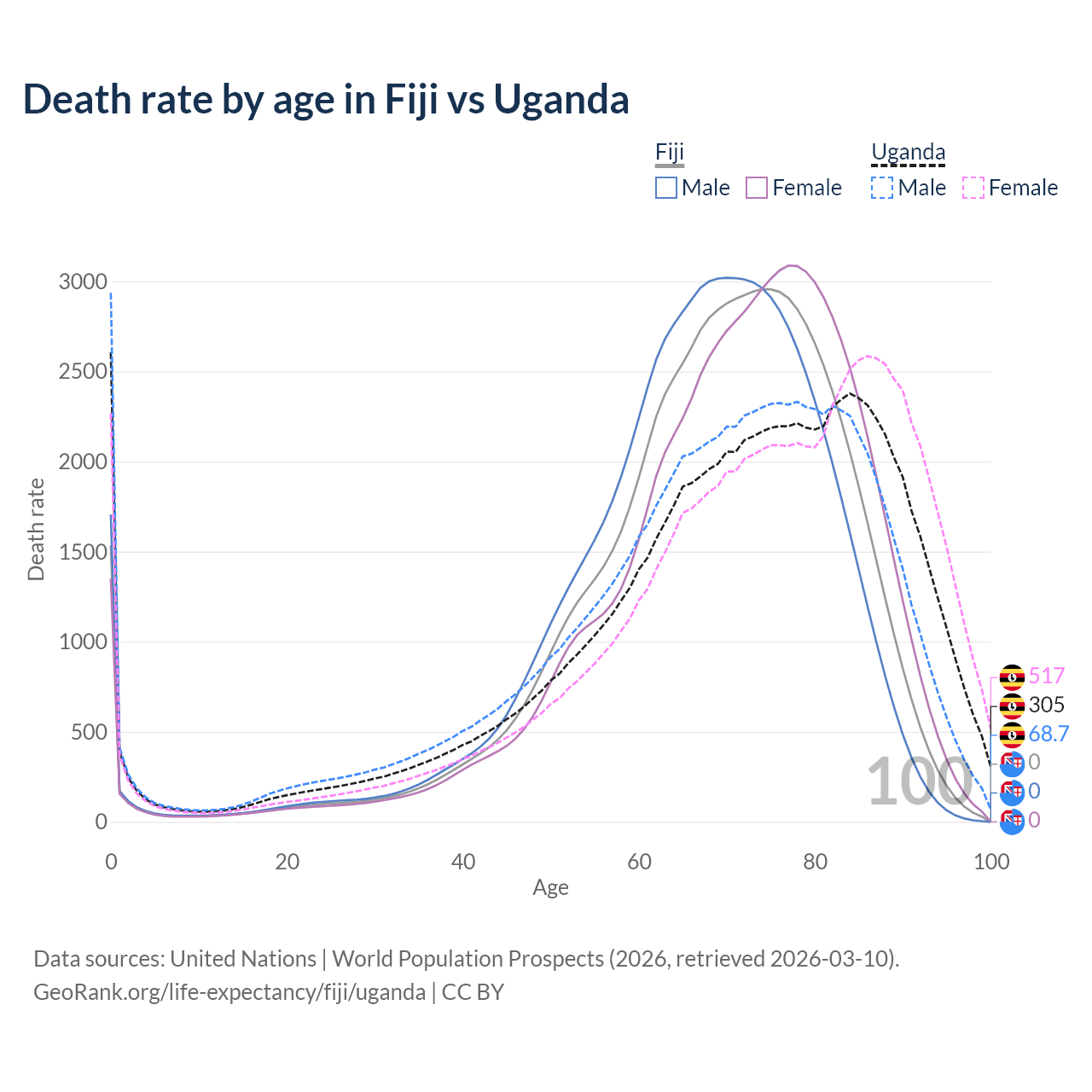 In Fiji, the most common age of death is 74, compared to 0 in Uganda. The median age of death is 70.5 in Fiji and 73.3 in Uganda, meaning only half of each cohort is expected to live past that age.
