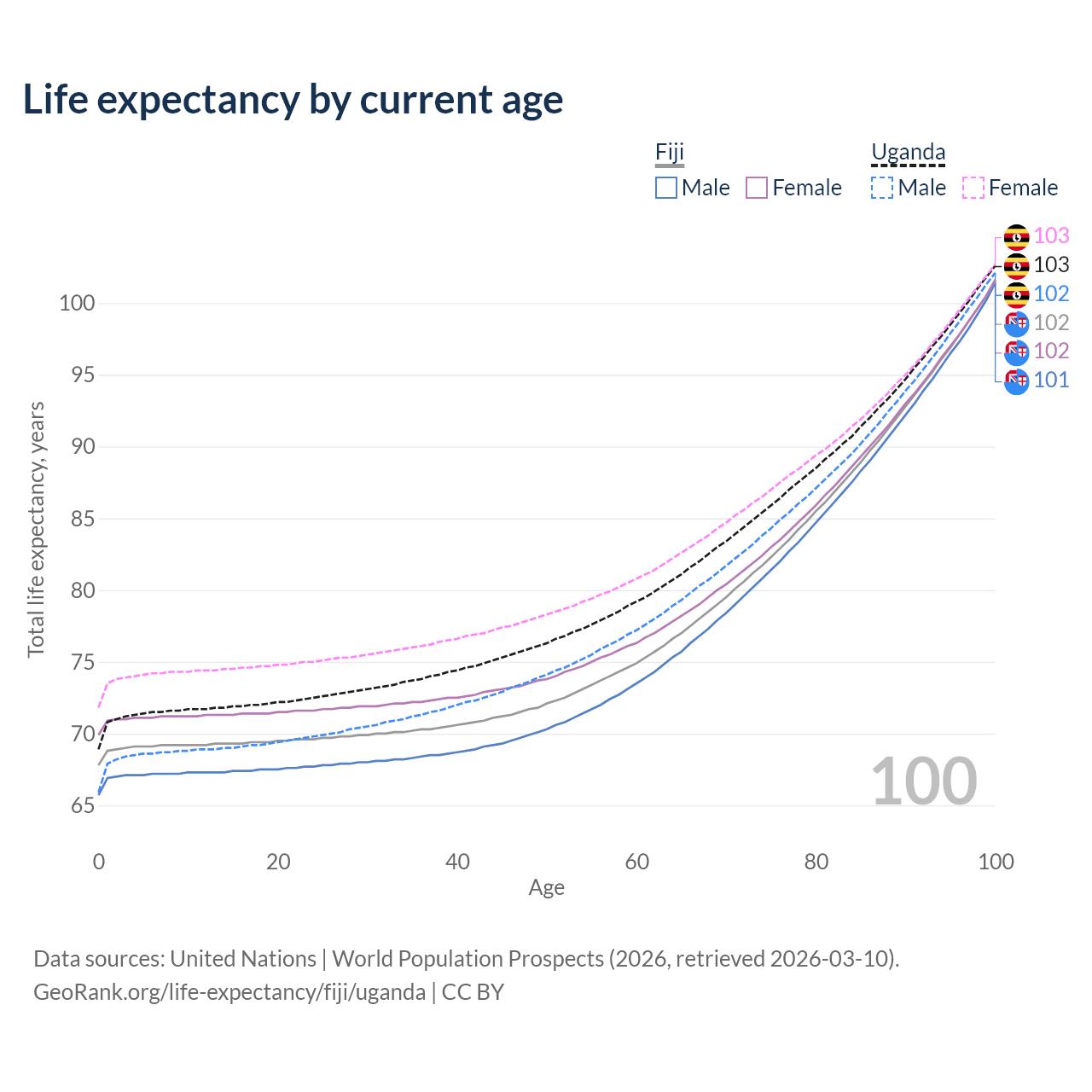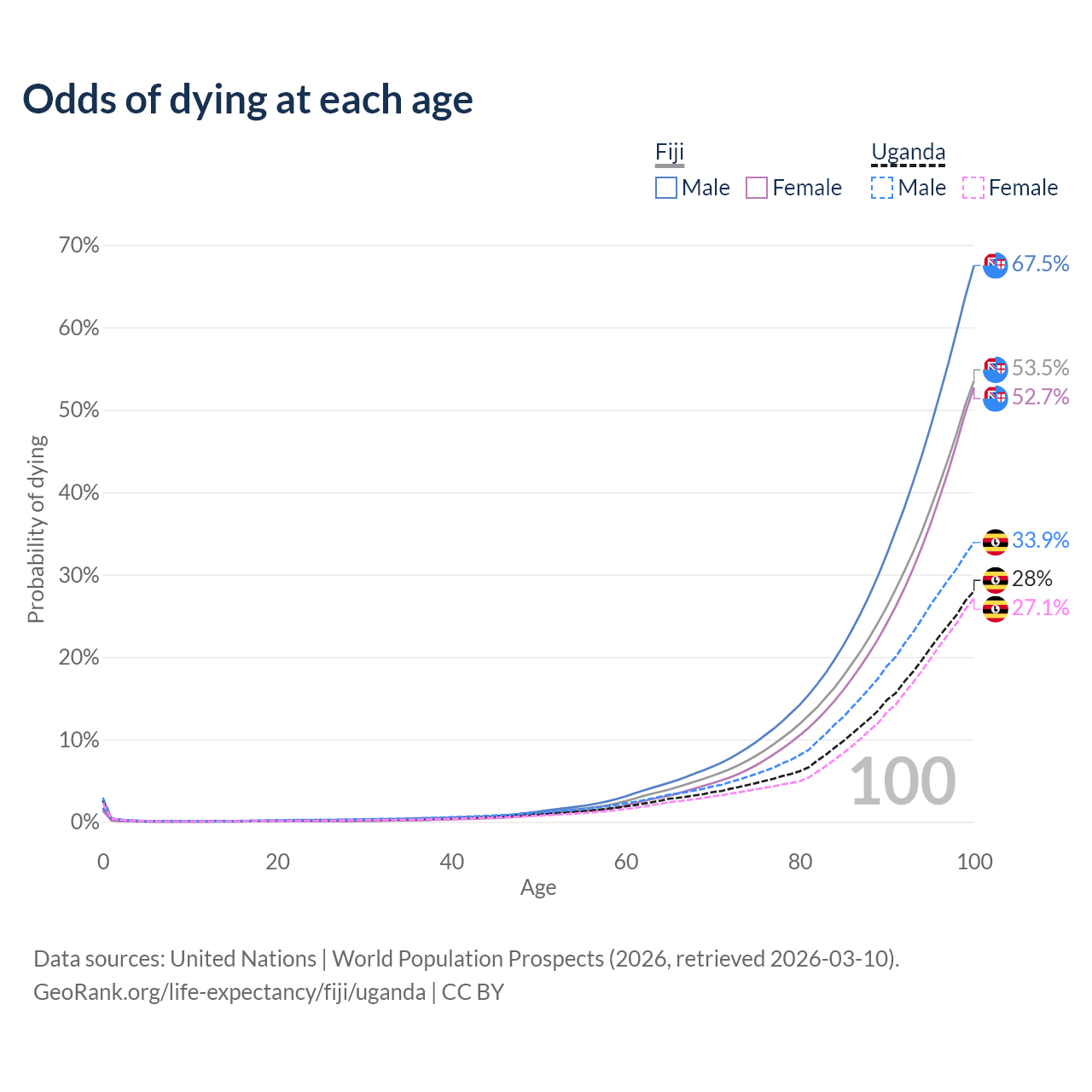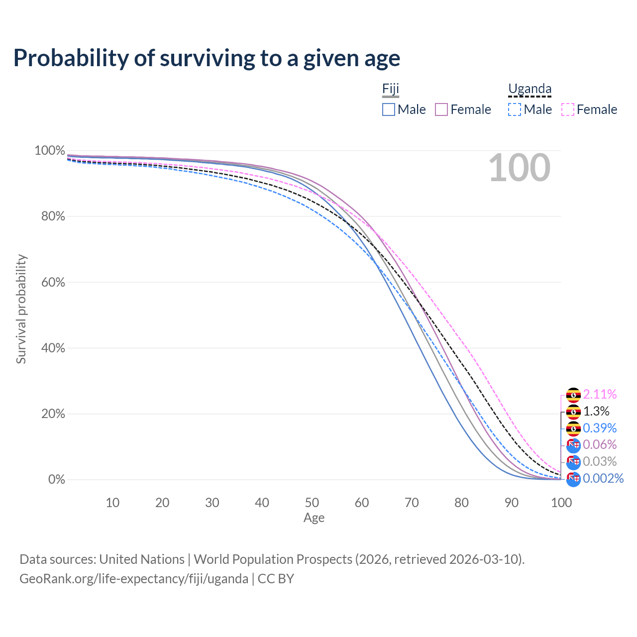 This life expectancy calculator shows the odds of living to 100, 95, 90, and below based on current age for both males and females in Fiji and Uganda, along with mean and median age of death. The calculations are based on the 2026 life tables (actuarial tables) from the UN World Population Prospects.