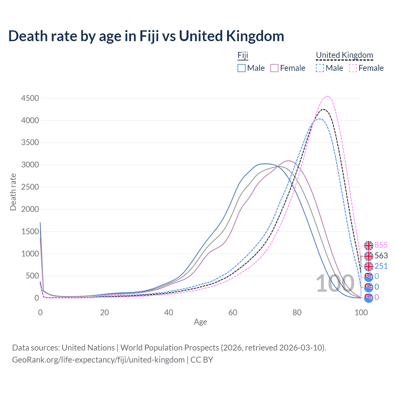 In Fiji, the most common age of death is 74, compared to 88 in the United Kingdom. The median age of death is 70.5 in Fiji and 84.9 in the United Kingdom, meaning only half of each cohort is expected to live past that age.