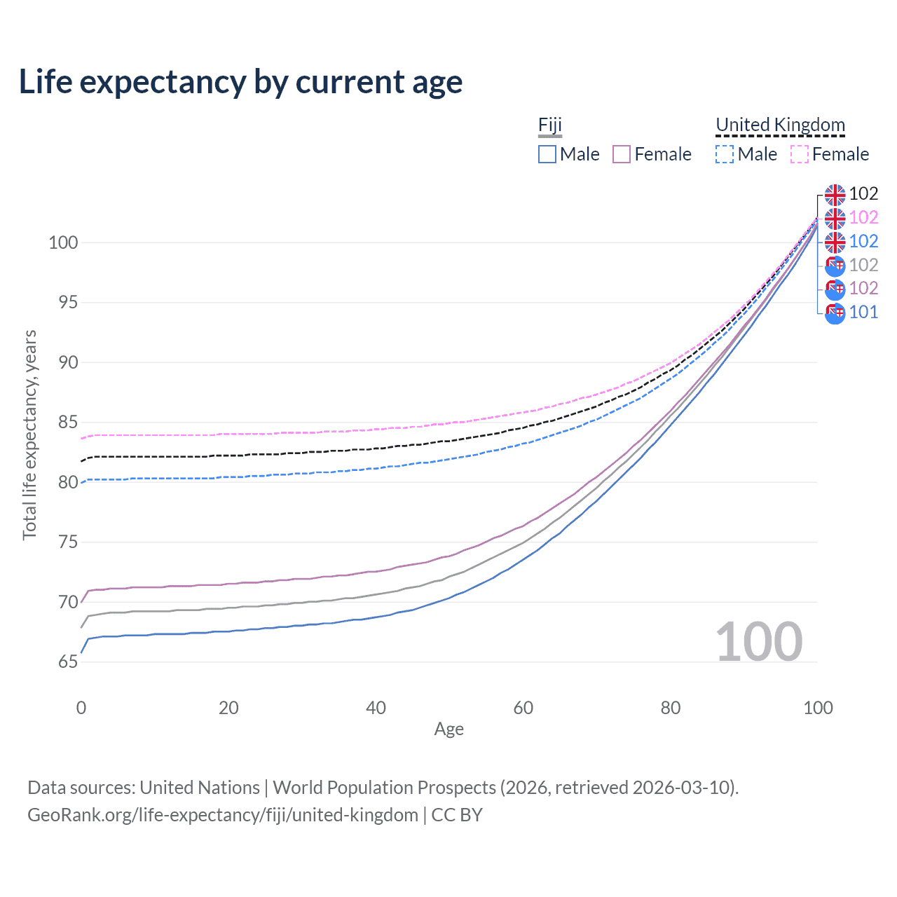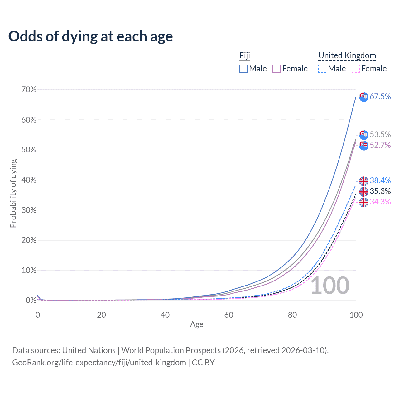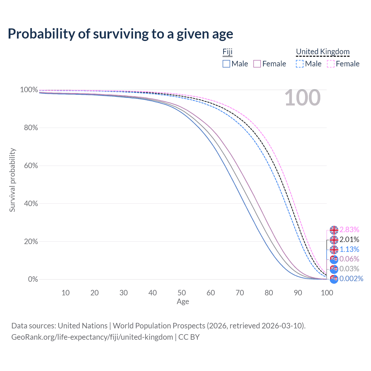 This life expectancy calculator shows the odds of living to 100, 95, 90, and below based on current age for both males and females in Fiji and the United Kingdom, along with mean and median age of death. The calculations are based on the 2026 life tables (actuarial tables) from the UN World Population Prospects.