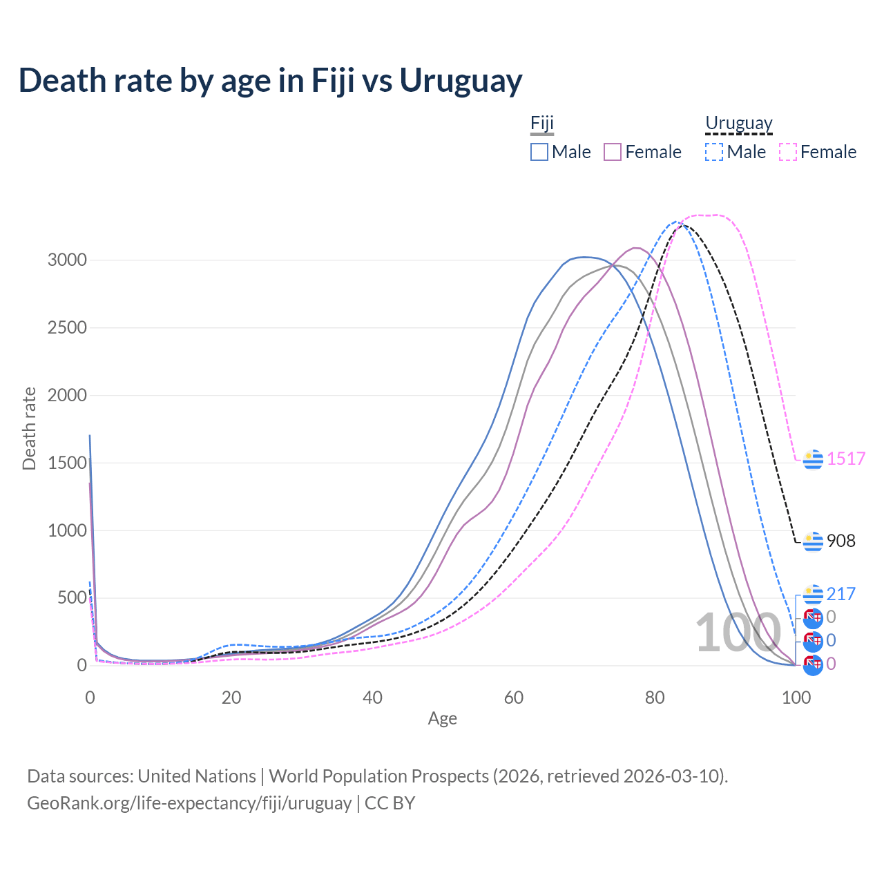 In Fiji, the most common age of death is 74, compared to 84 in Uruguay. The median age of death is 70.5 in Fiji and 81.8 in Uruguay, meaning only half of each cohort is expected to live past that age.