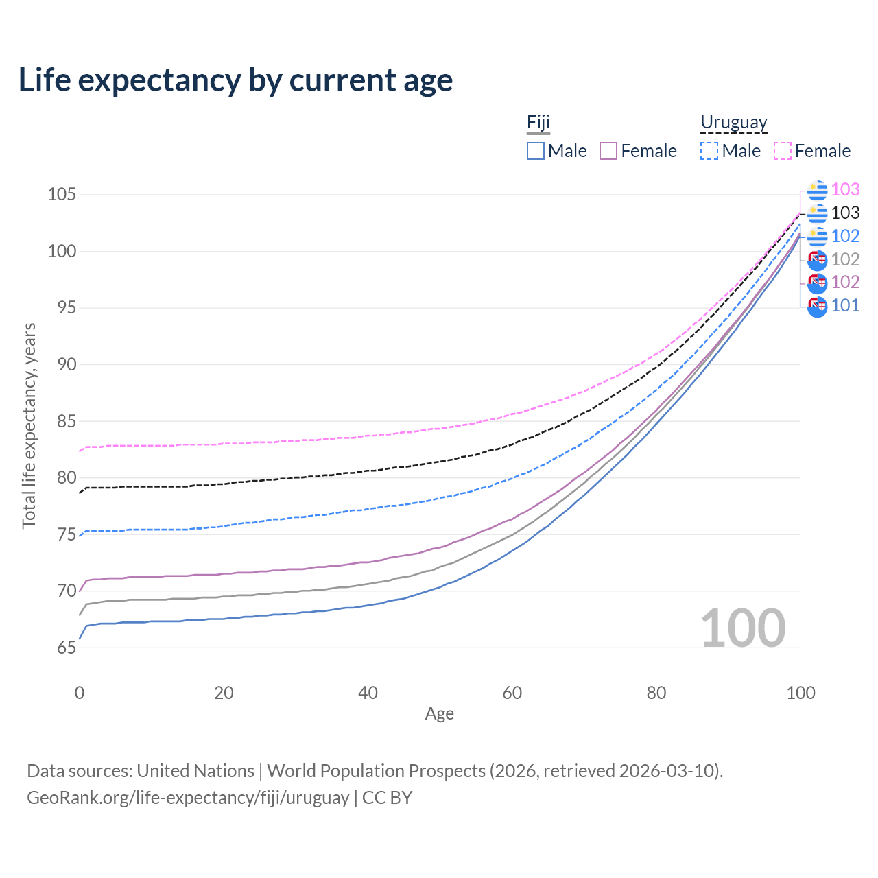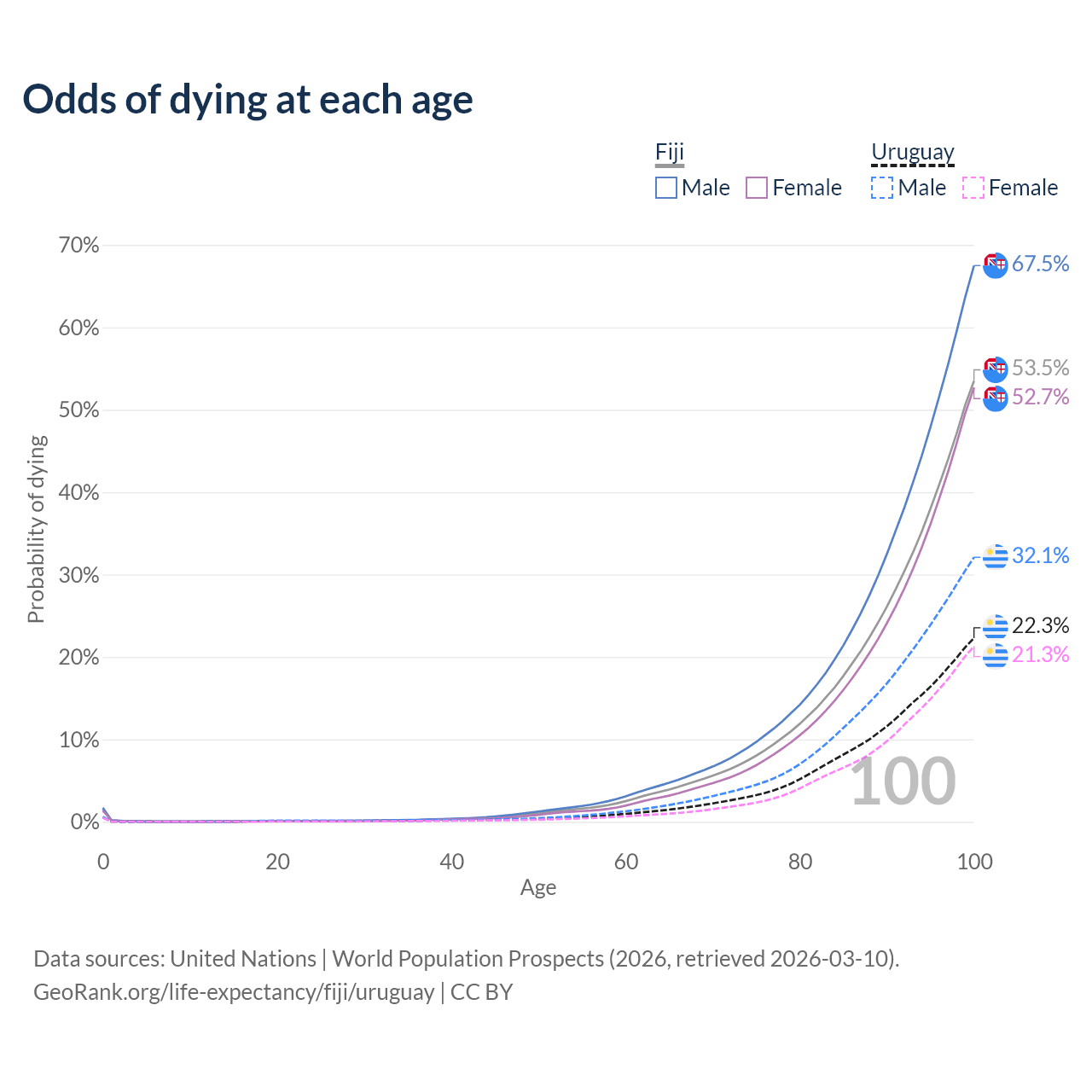 This life expectancy calculator shows the odds of living to 100, 95, 90, and below based on current age for both males and females in Fiji and Uruguay, along with mean and median age of death. The calculations are based on the 2026 life tables (actuarial tables) from the UN World Population Prospects.