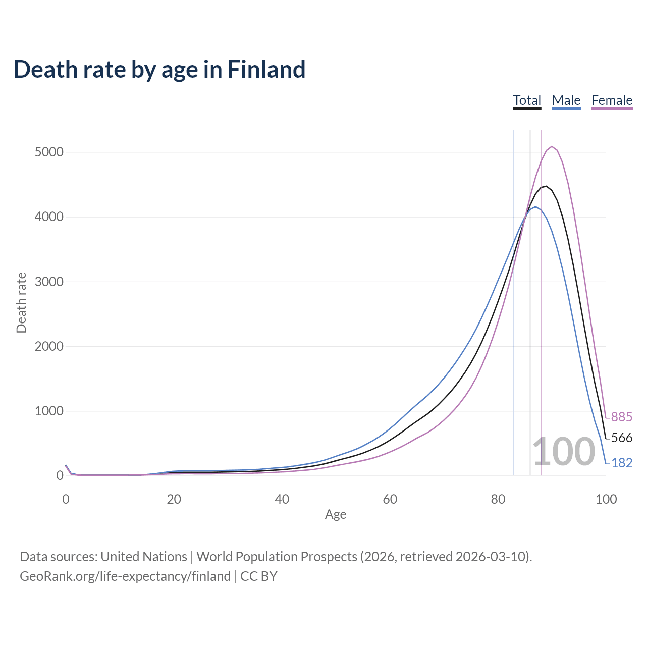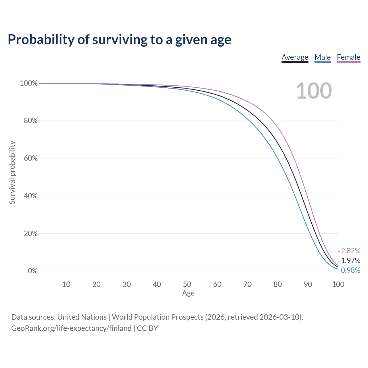 This life expectancy calculator shows the odds of living to 100, 95, 90, and below based on current age for both males and females in Finland, along with mean and median age of death. The calculations are based on the 2026 life tables (actuarial tables) from the UN World Population Prospects.