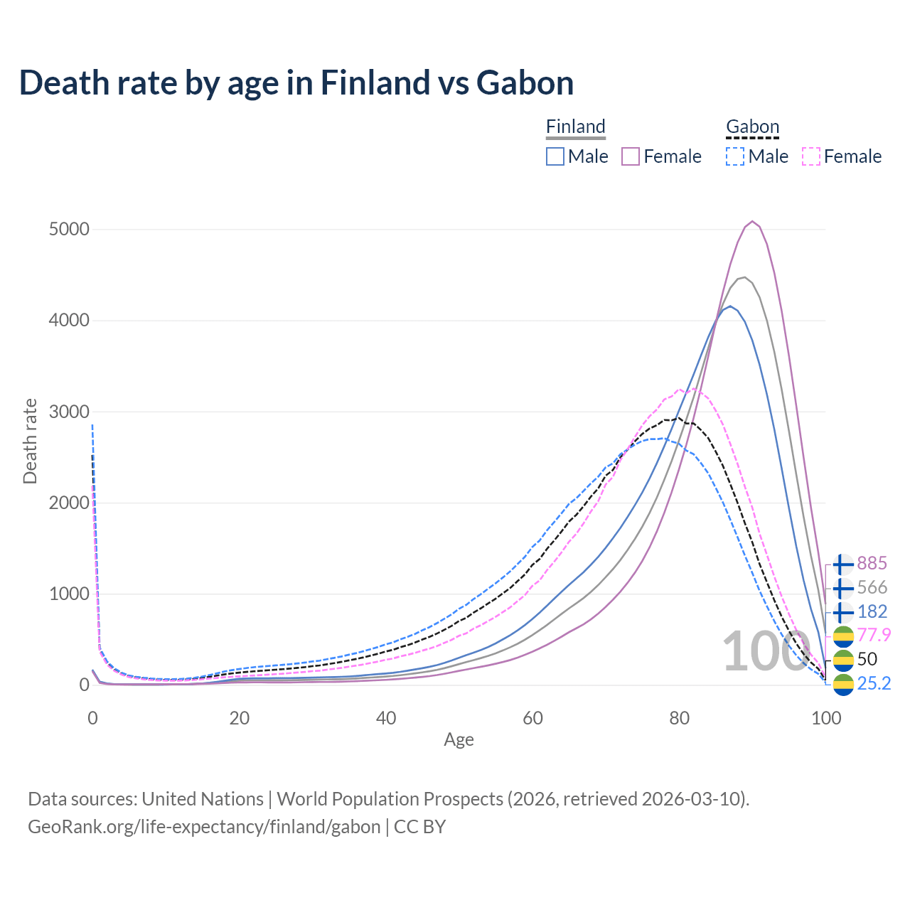 In Finland, the most common age of death is 89, compared to 80 in Gabon. The median age of death is 85.6 in Finland and 73.9 in Gabon, meaning only half of each cohort is expected to live past that age.