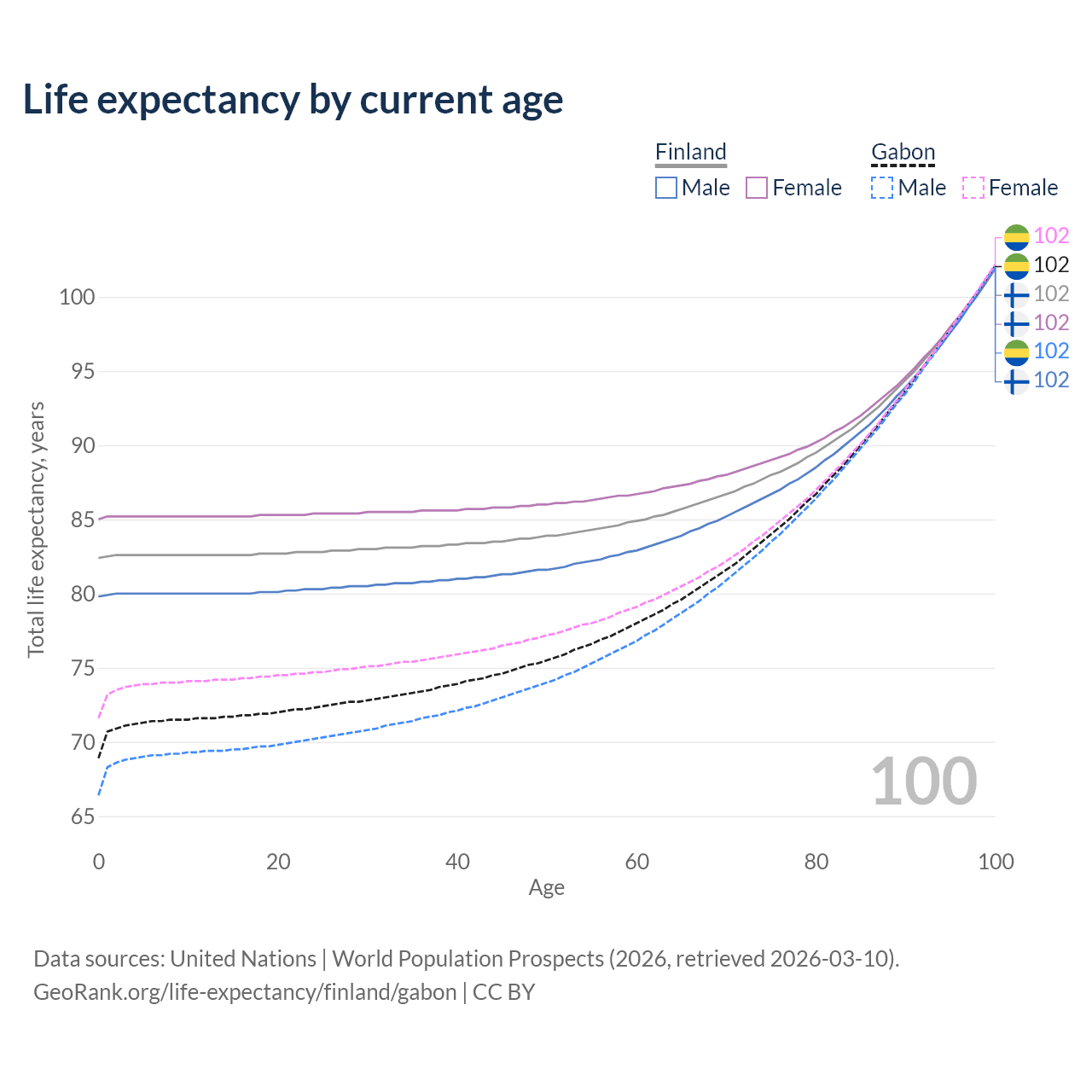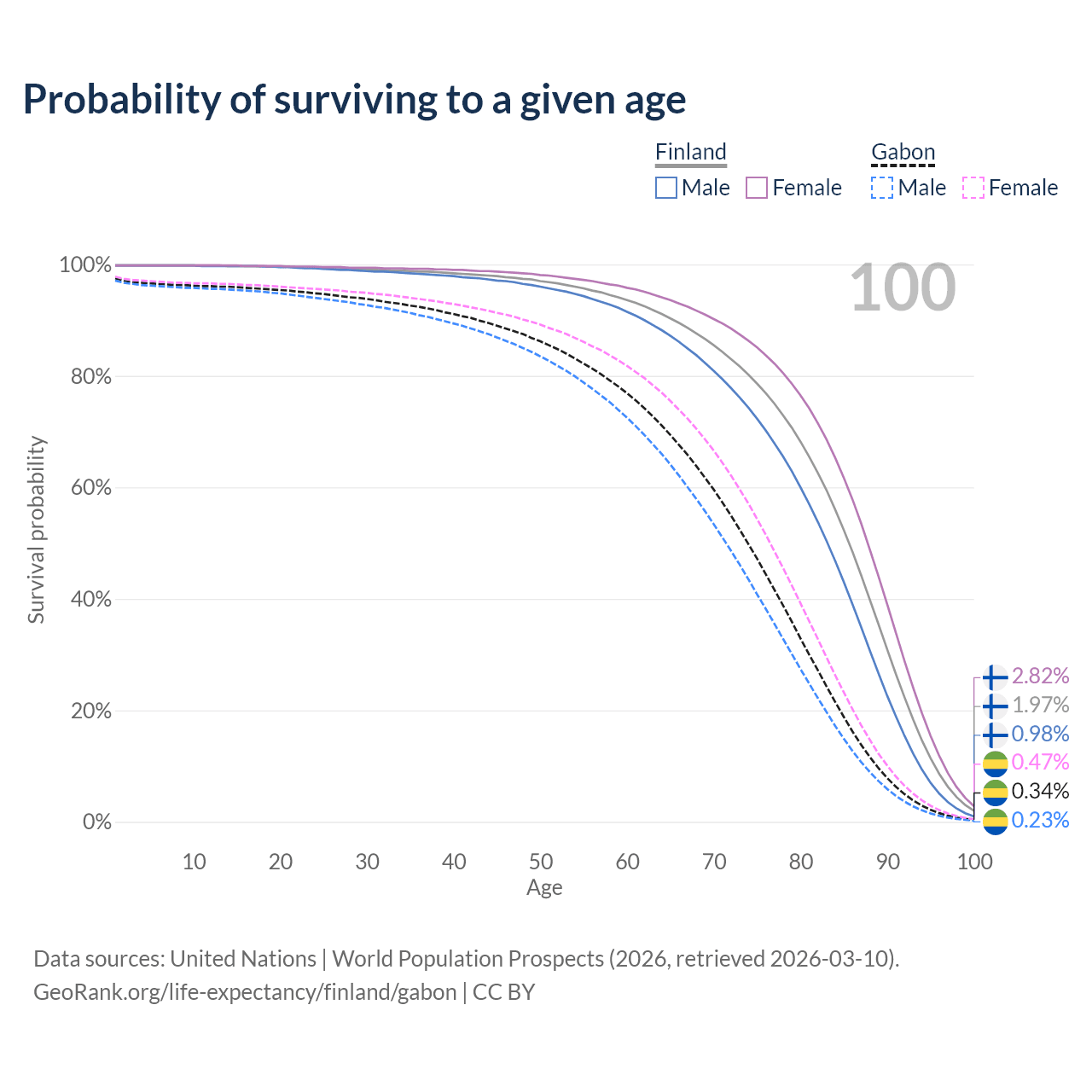 This life expectancy calculator shows the odds of living to 100, 95, 90, and below based on current age for both males and females in Finland and Gabon, along with mean and median age of death. The calculations are based on the 2026 life tables (actuarial tables) from the UN World Population Prospects.