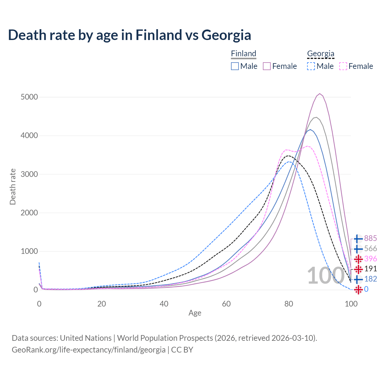 The average life expectancy at birth is 82.4 years in Finland vs 75 in Georgia. Finland is ranked 29/197 by life expectancy, and Georgia is 96/197. In Finland, the life expectancy is 79.8 years for males and 85 years for females. In Georgia, it's 70.1 years for males and 79.5 years for females.