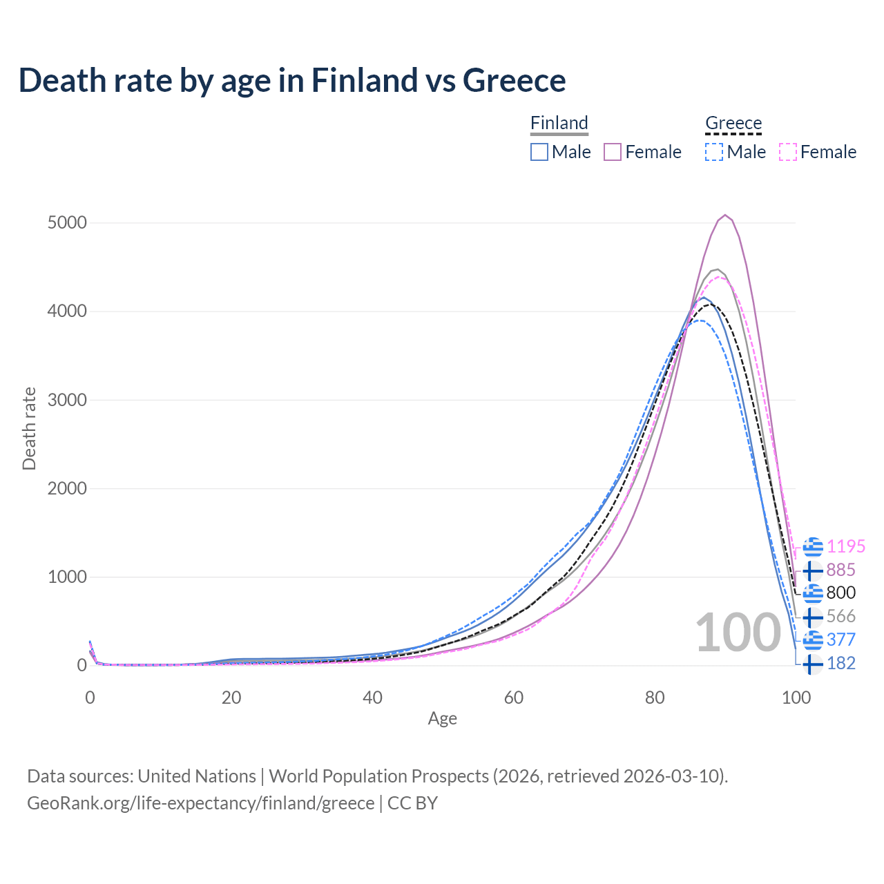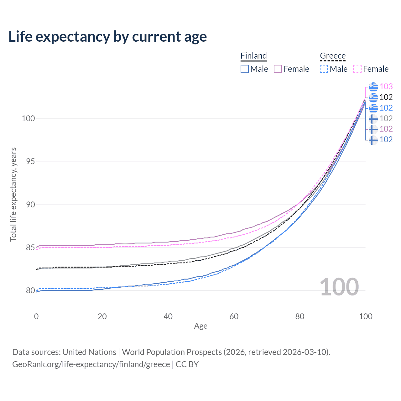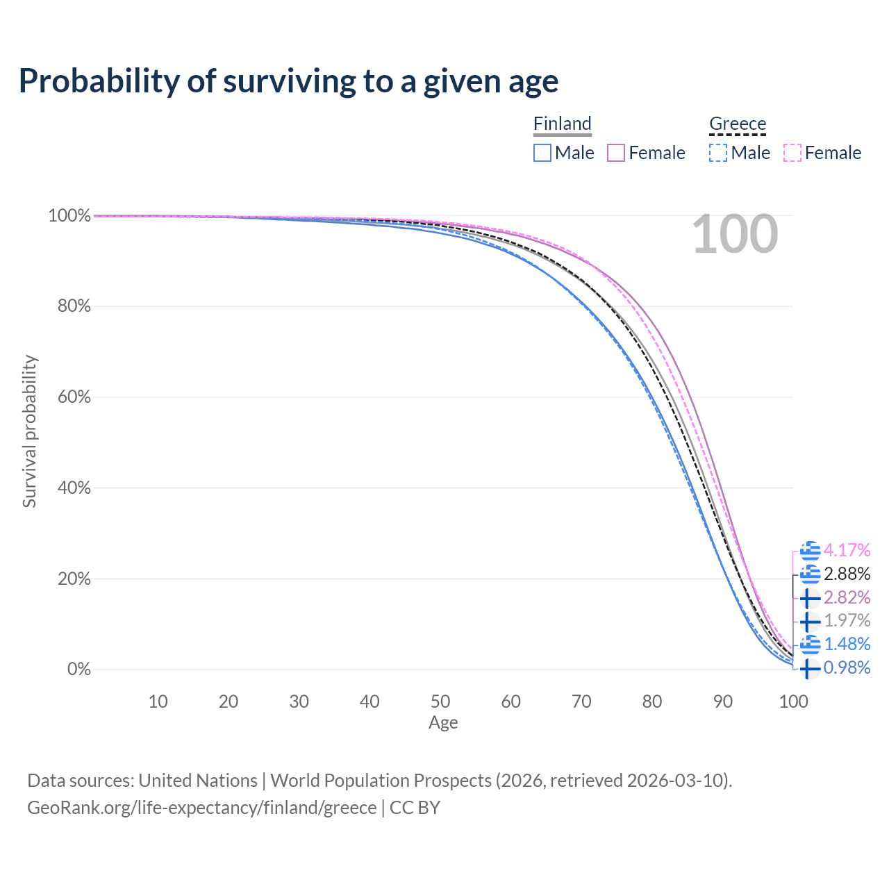 This life expectancy calculator shows the odds of living to 100, 95, 90, and below based on current age for both males and females in Finland and Greece, along with mean and median age of death. The calculations are based on the 2026 life tables (actuarial tables) from the UN World Population Prospects.