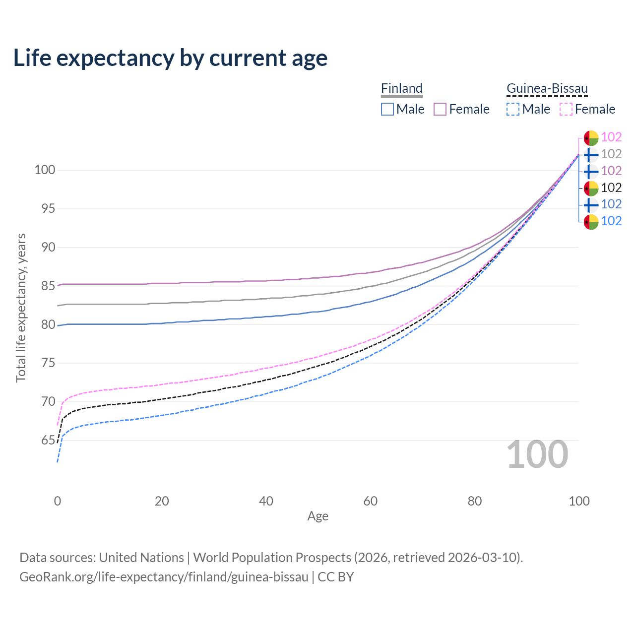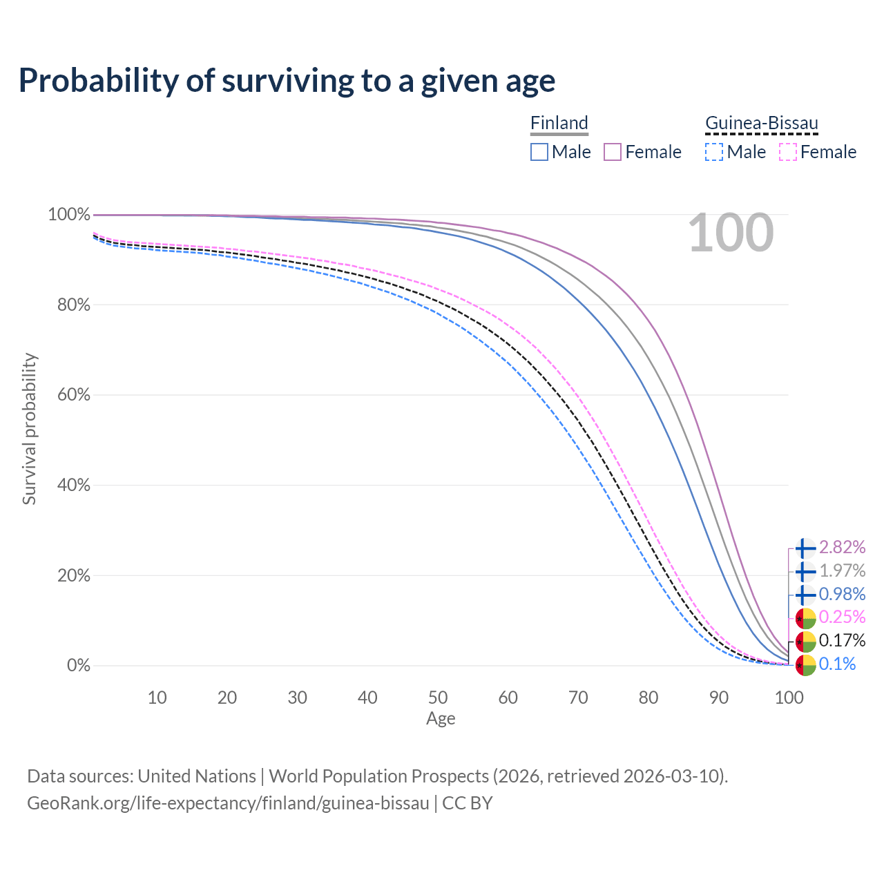 This life expectancy calculator shows the odds of living to 100, 95, 90, and below based on current age for both males and females in Finland and Guinea-Bissau, along with mean and median age of death. The calculations are based on the 2026 life tables (actuarial tables) from the UN World Population Prospects.