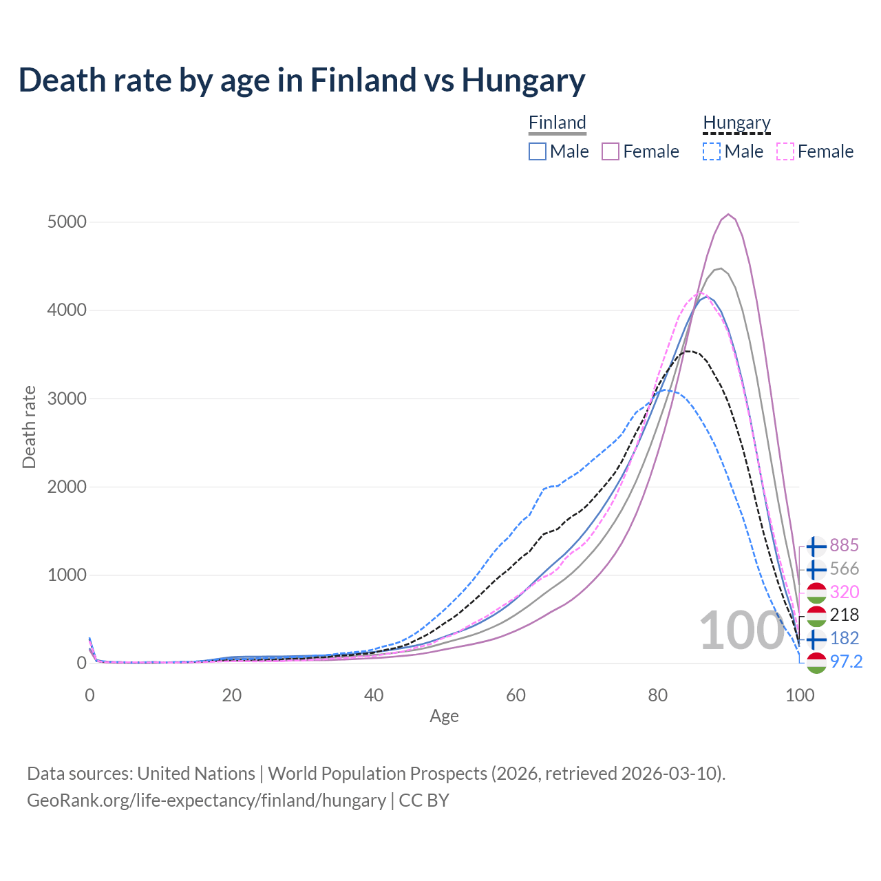This life expectancy calculator shows the odds of living to 100, 95, 90, and below based on current age for both males and females in Finland and Hungary, along with mean and median age of death. The calculations are based on the 2026 life tables (actuarial tables) from the UN World Population Prospects.