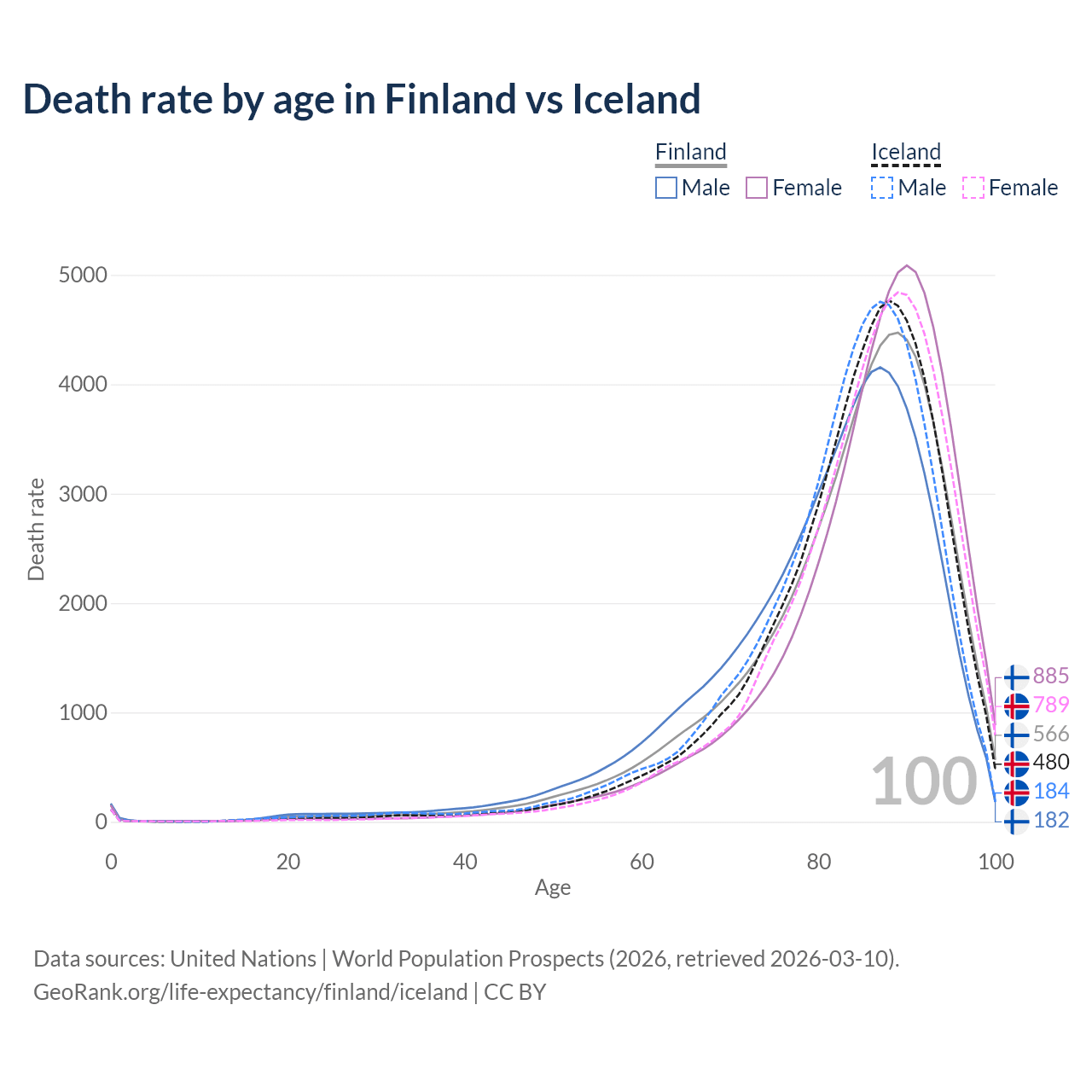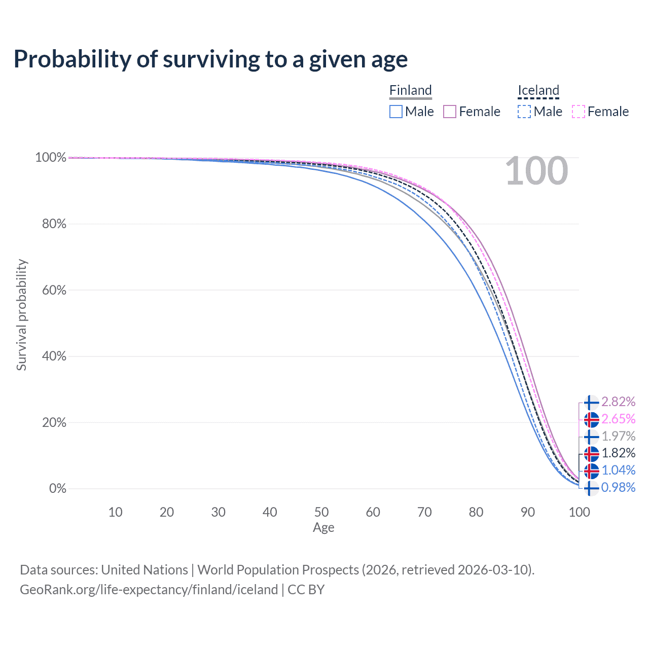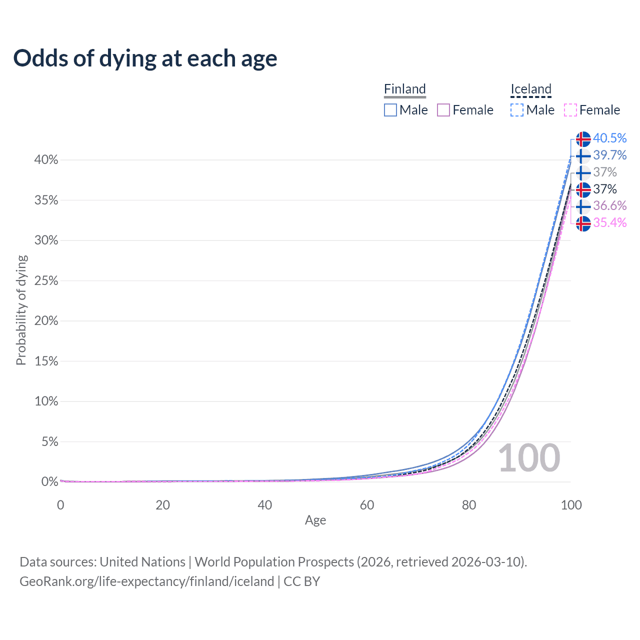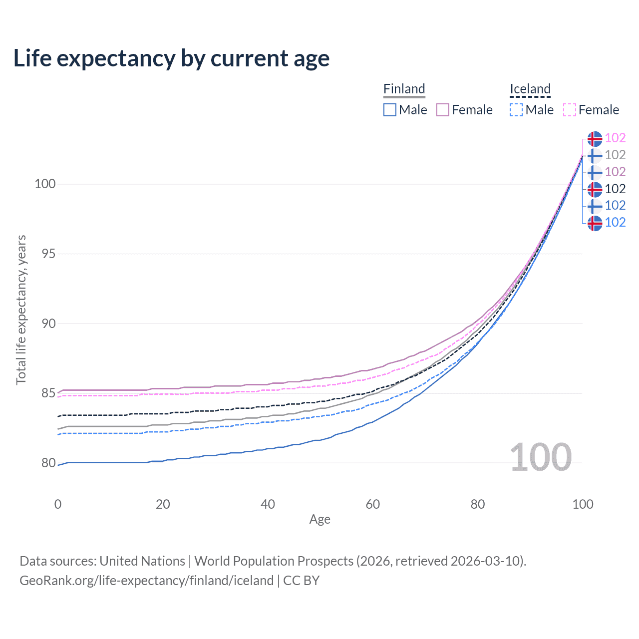 This life expectancy calculator shows the odds of living to 100, 95, 90, and below based on current age for both males and females in Finland and Iceland, along with mean and median age of death. The calculations are based on the 2026 life tables (actuarial tables) from the UN World Population Prospects.