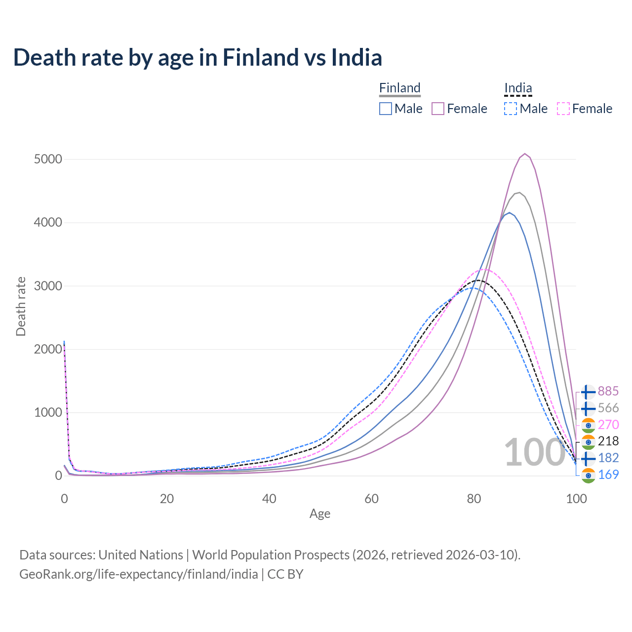 In Finland, the most common age of death is 89, compared to 81 in India. The median age of death is 85.6 in Finland and 76.8 in India, meaning only half of each cohort is expected to live past that age.