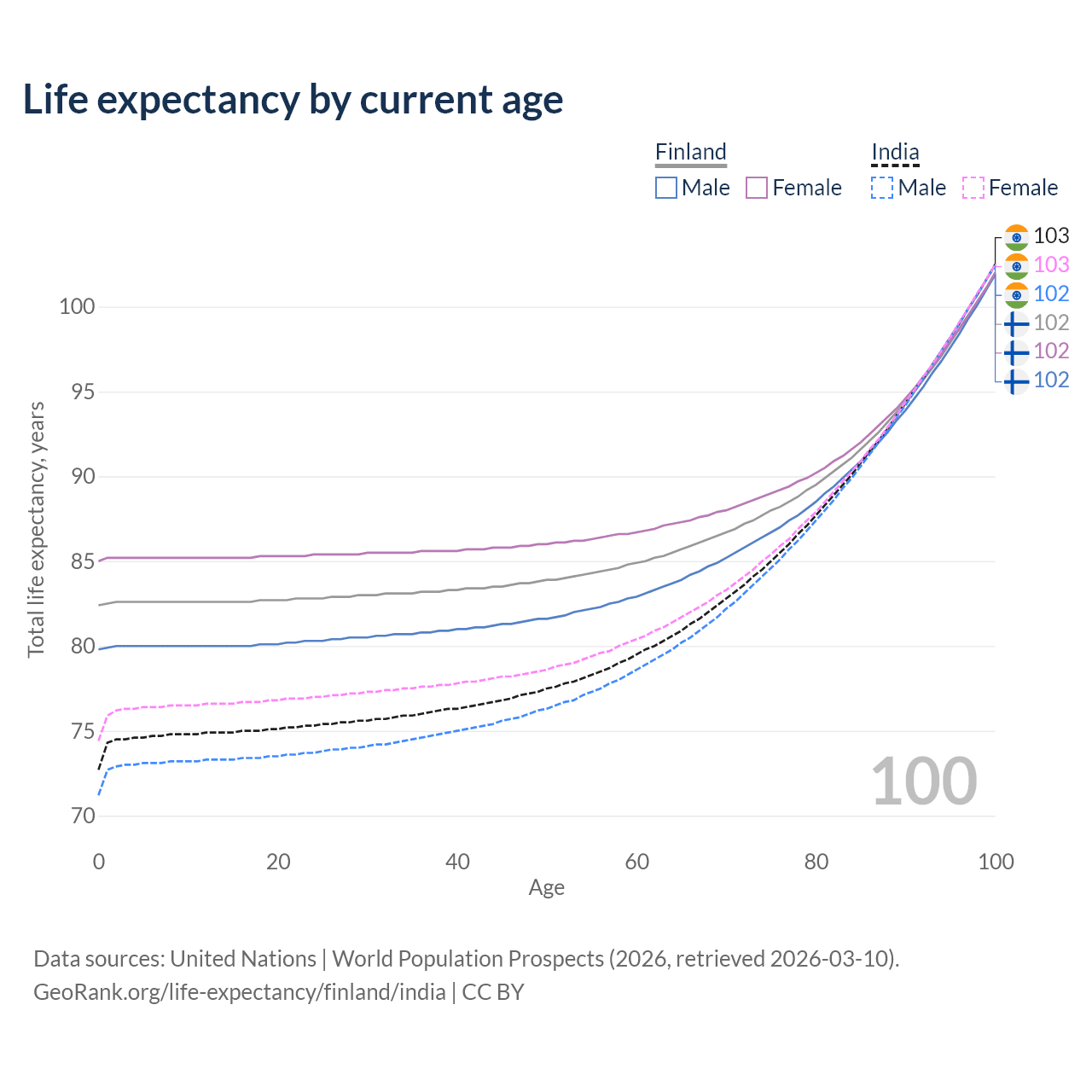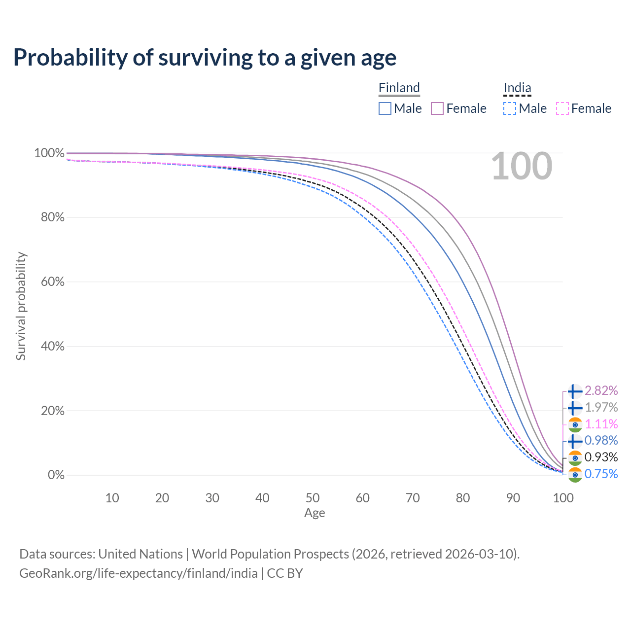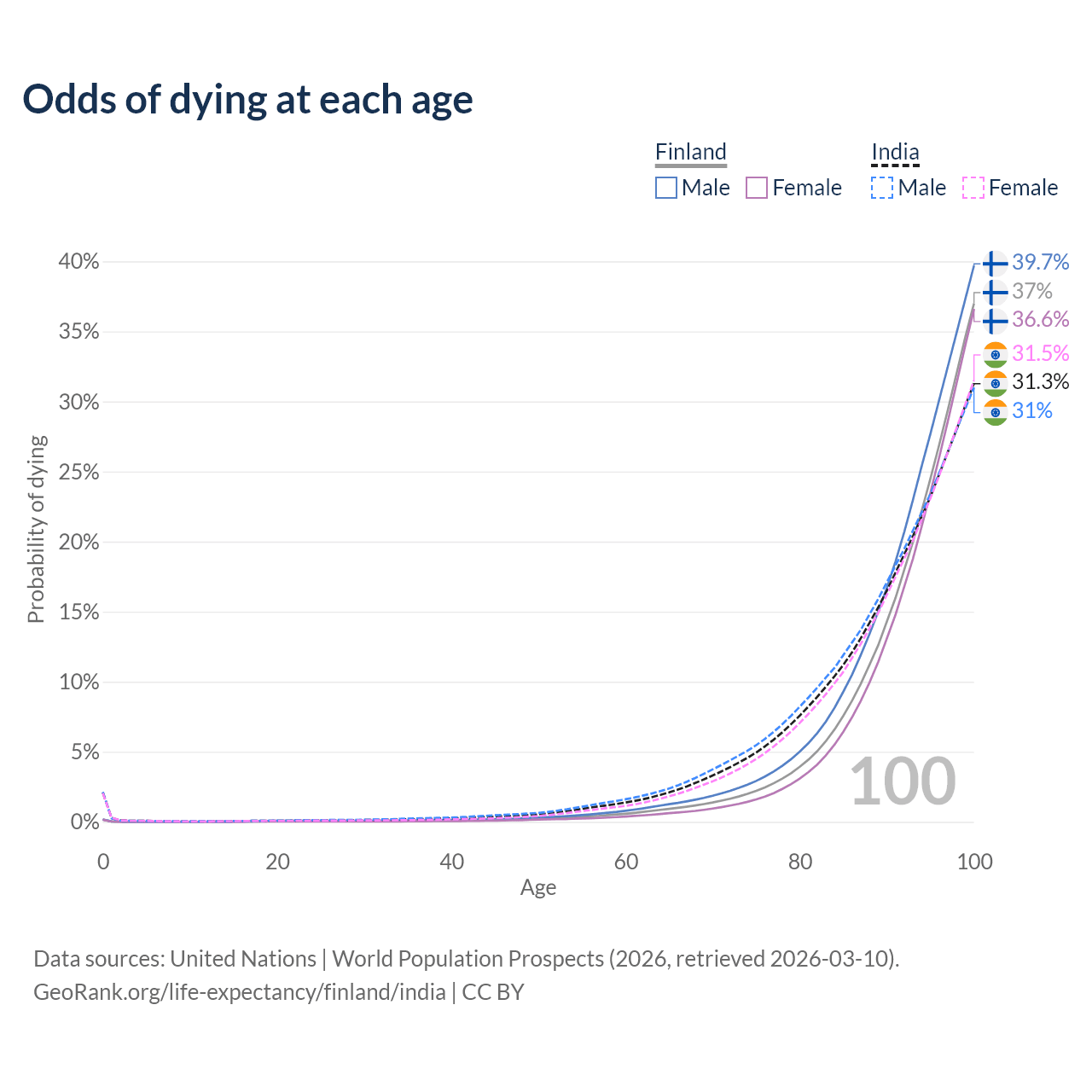 This life expectancy calculator shows the odds of living to 100, 95, 90, and below based on current age for both males and females in Finland and India, along with mean and median age of death. The calculations are based on the 2026 life tables (actuarial tables) from the UN World Population Prospects.