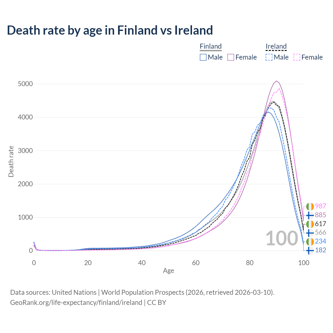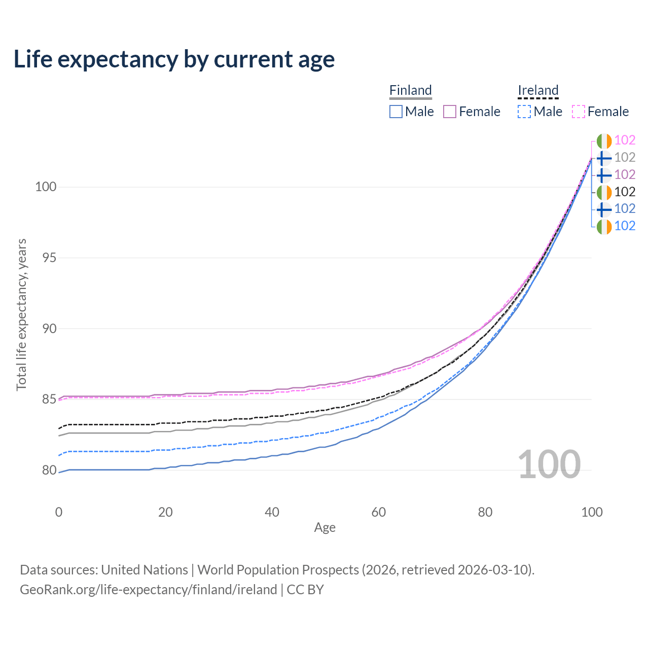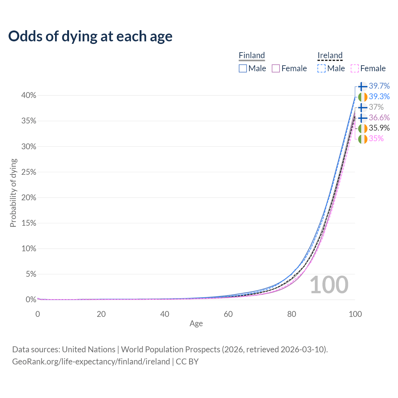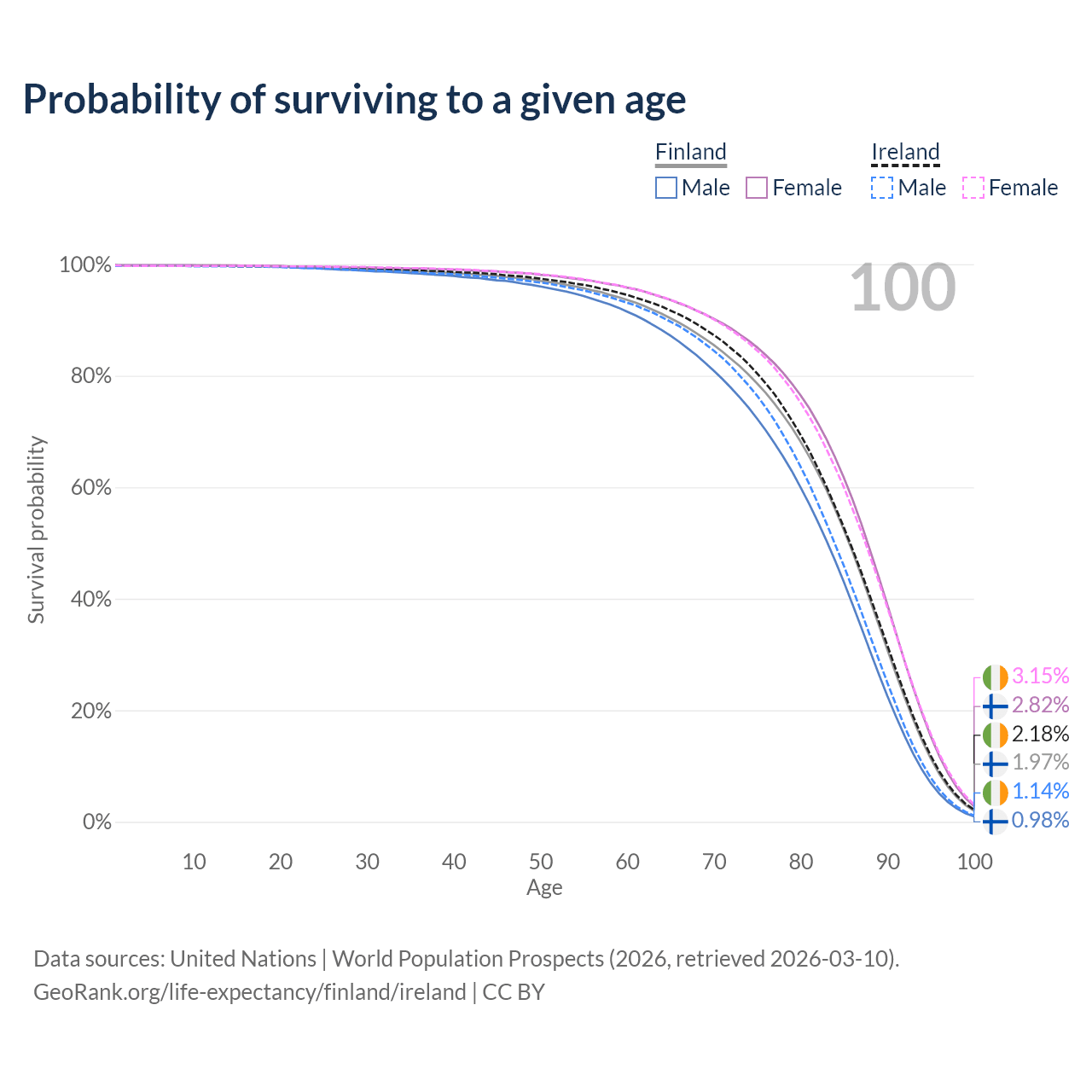 This life expectancy calculator shows the odds of living to 100, 95, 90, and below based on current age for both males and females in Finland and Ireland, along with mean and median age of death. The calculations are based on the 2026 life tables (actuarial tables) from the UN World Population Prospects.