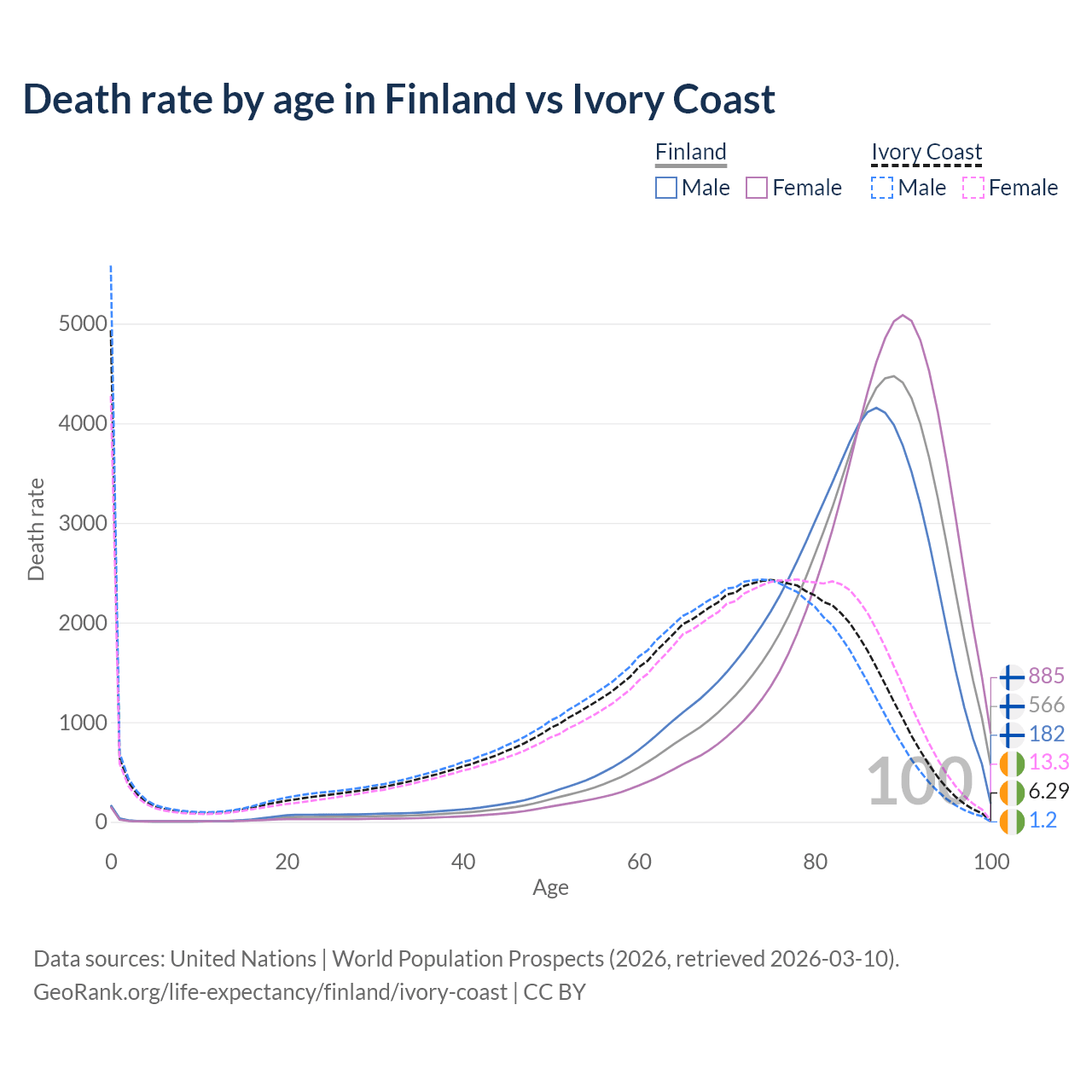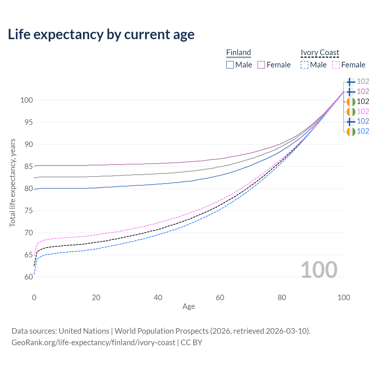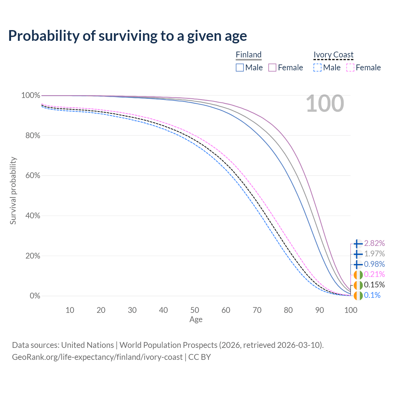 This life expectancy calculator shows the odds of living to 100, 95, 90, and below based on current age for both males and females in Finland and Ivory Coast, along with mean and median age of death. The calculations are based on the 2026 life tables (actuarial tables) from the UN World Population Prospects.