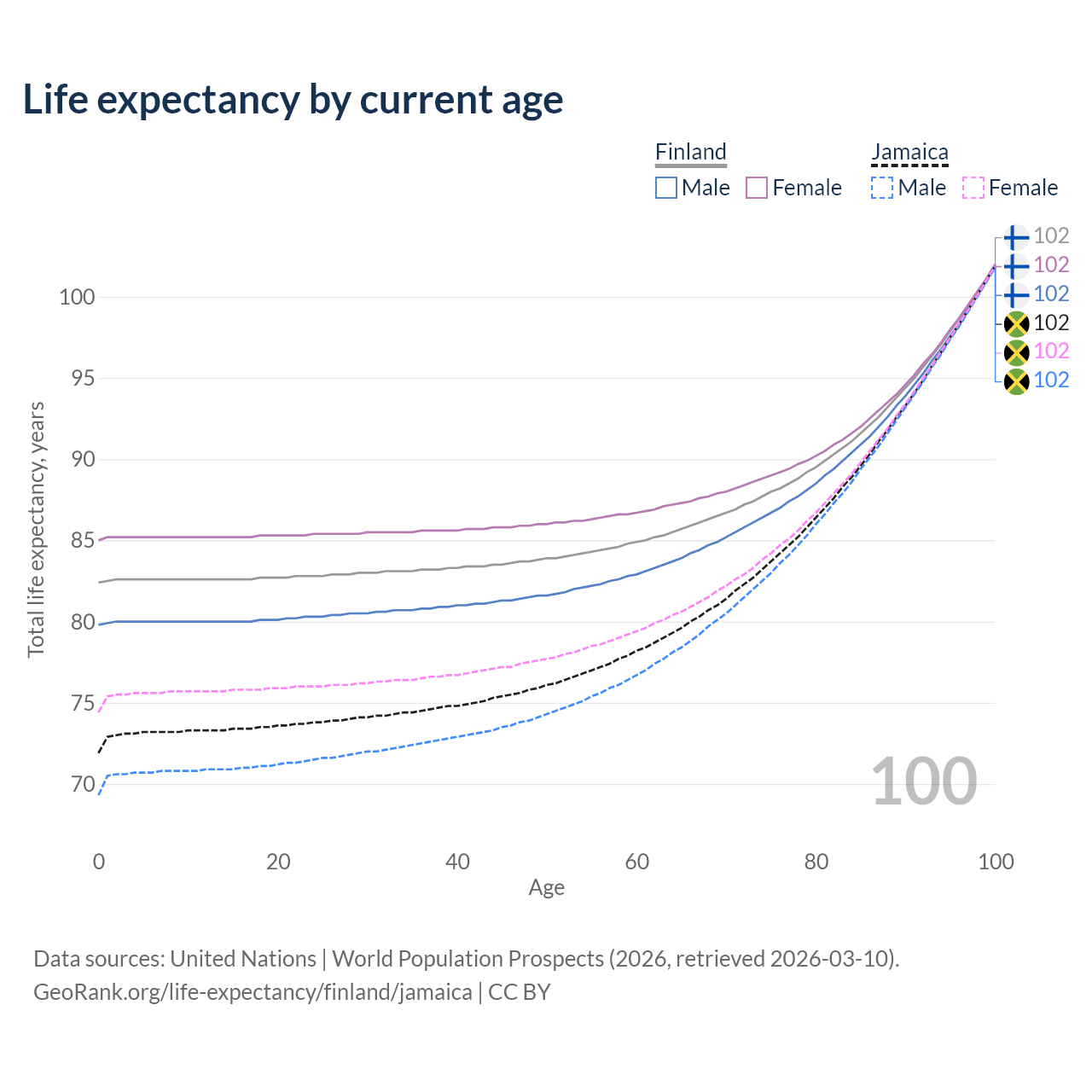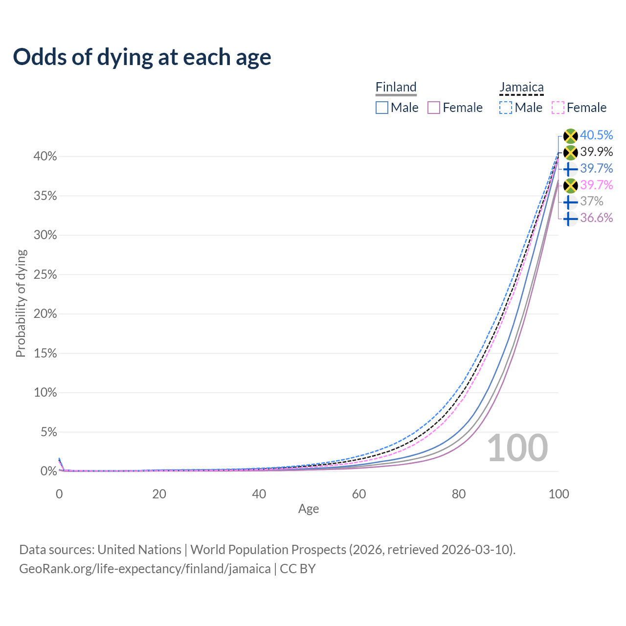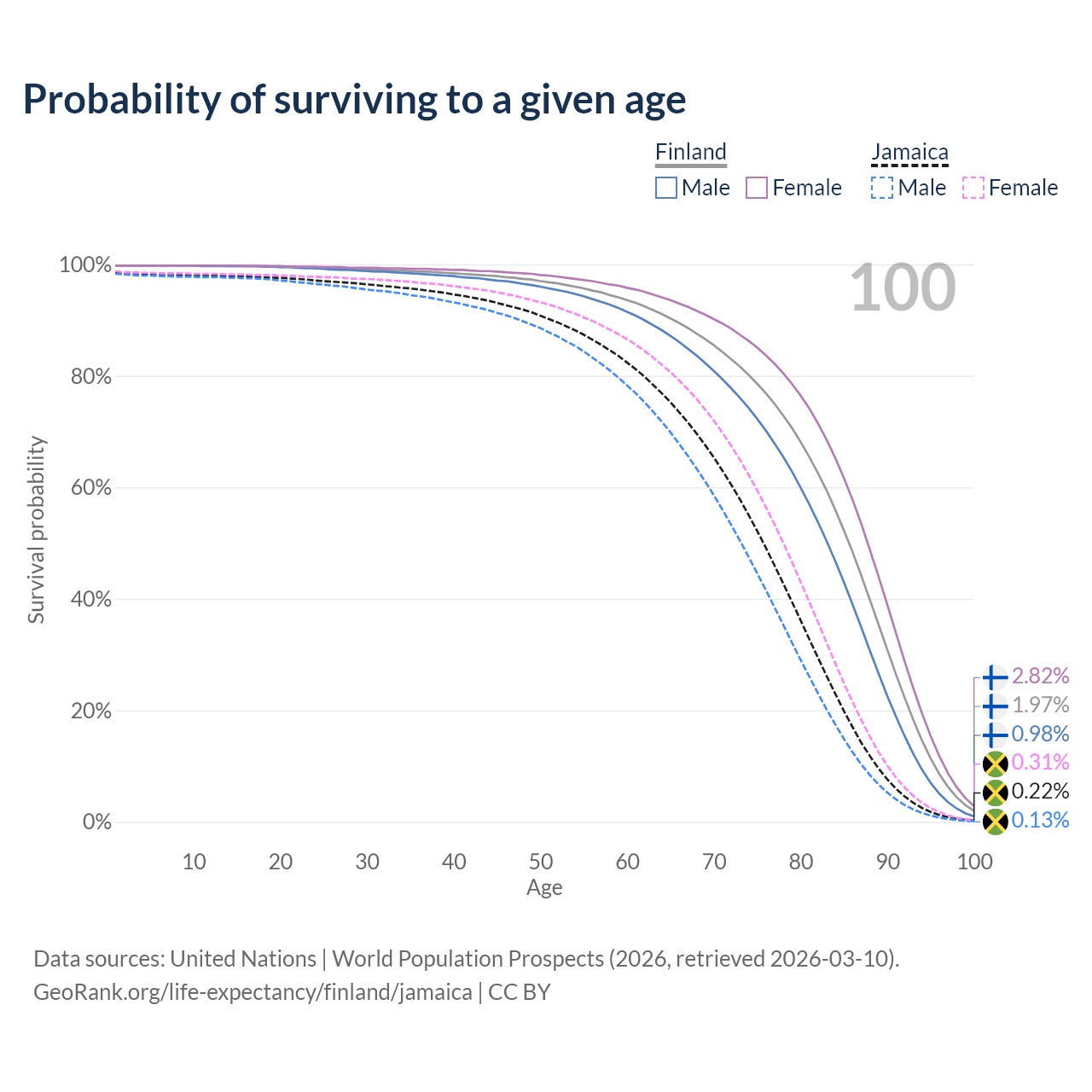 This life expectancy calculator shows the odds of living to 100, 95, 90, and below based on current age for both males and females in Finland and Jamaica, along with mean and median age of death. The calculations are based on the 2026 life tables (actuarial tables) from the UN World Population Prospects.