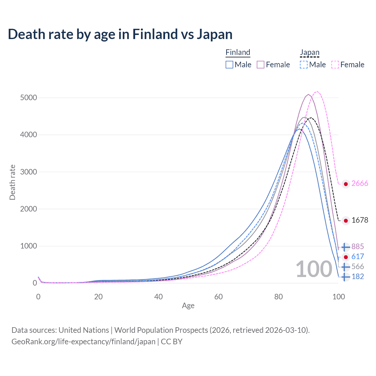 In Finland, the most common age of death is 89, compared to 91 in Japan. The median age of death is 85.6 in Finland and 88.1 in Japan, meaning only half of each cohort is expected to live past that age.