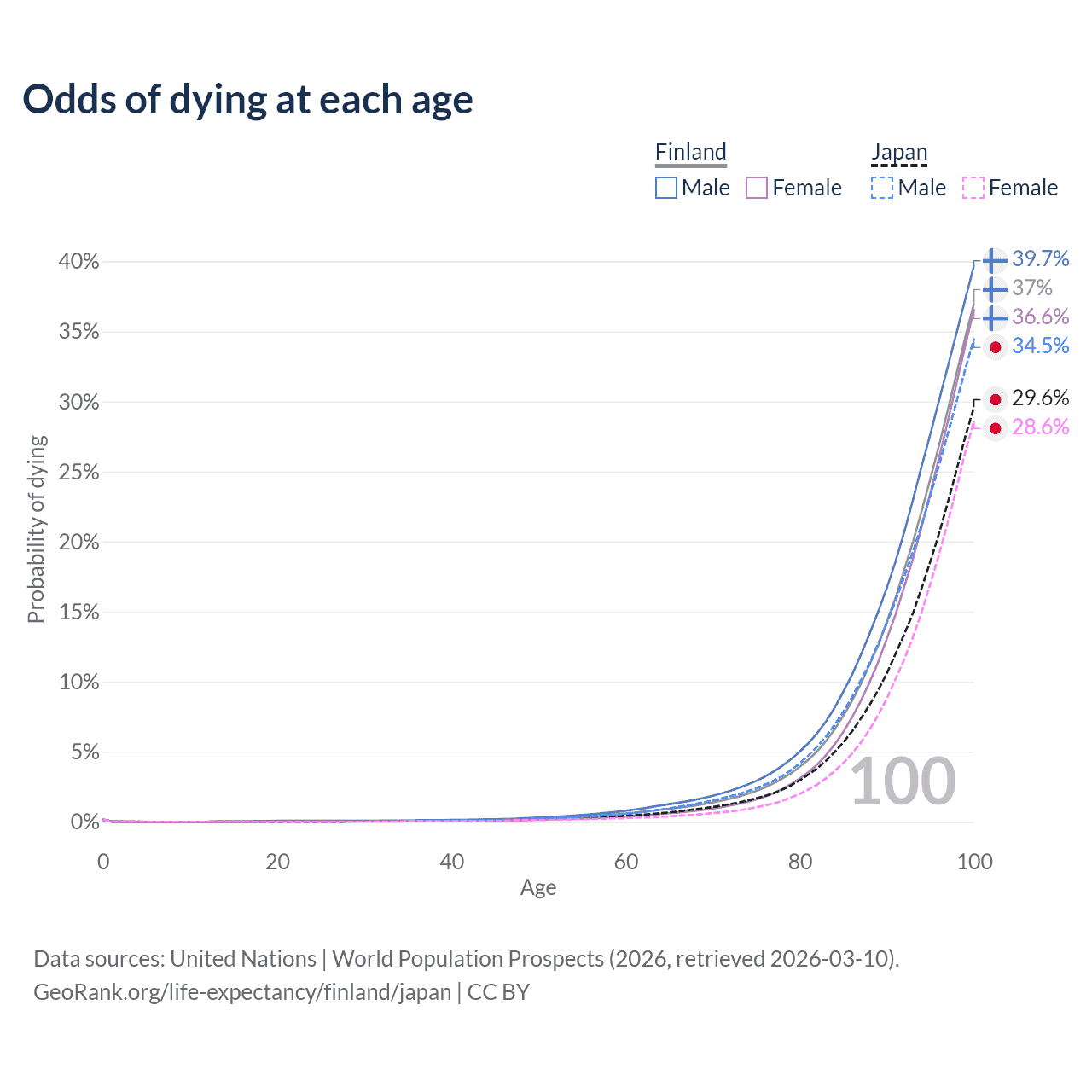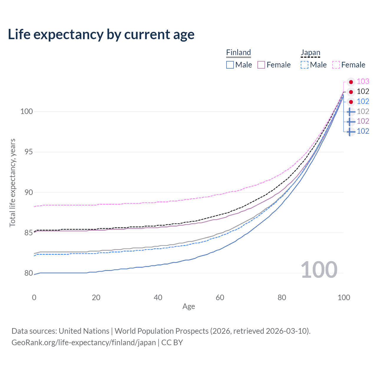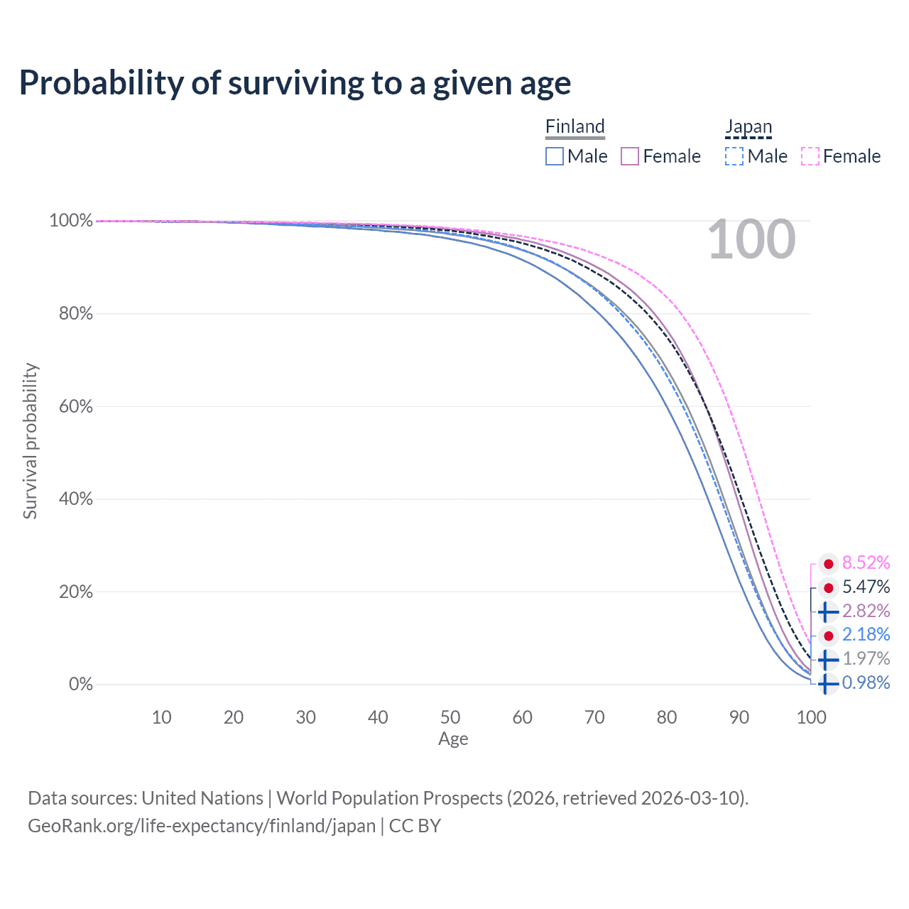This life expectancy calculator shows the odds of living to 100, 95, 90, and below based on current age for both males and females in Finland and Japan, along with mean and median age of death. The calculations are based on the 2026 life tables (actuarial tables) from the UN World Population Prospects.