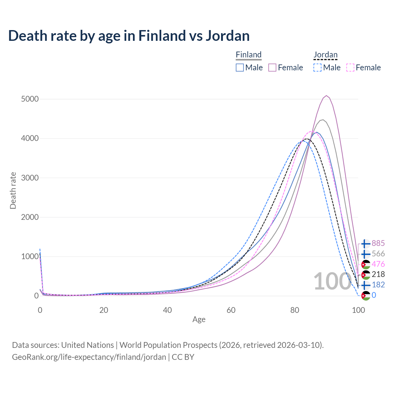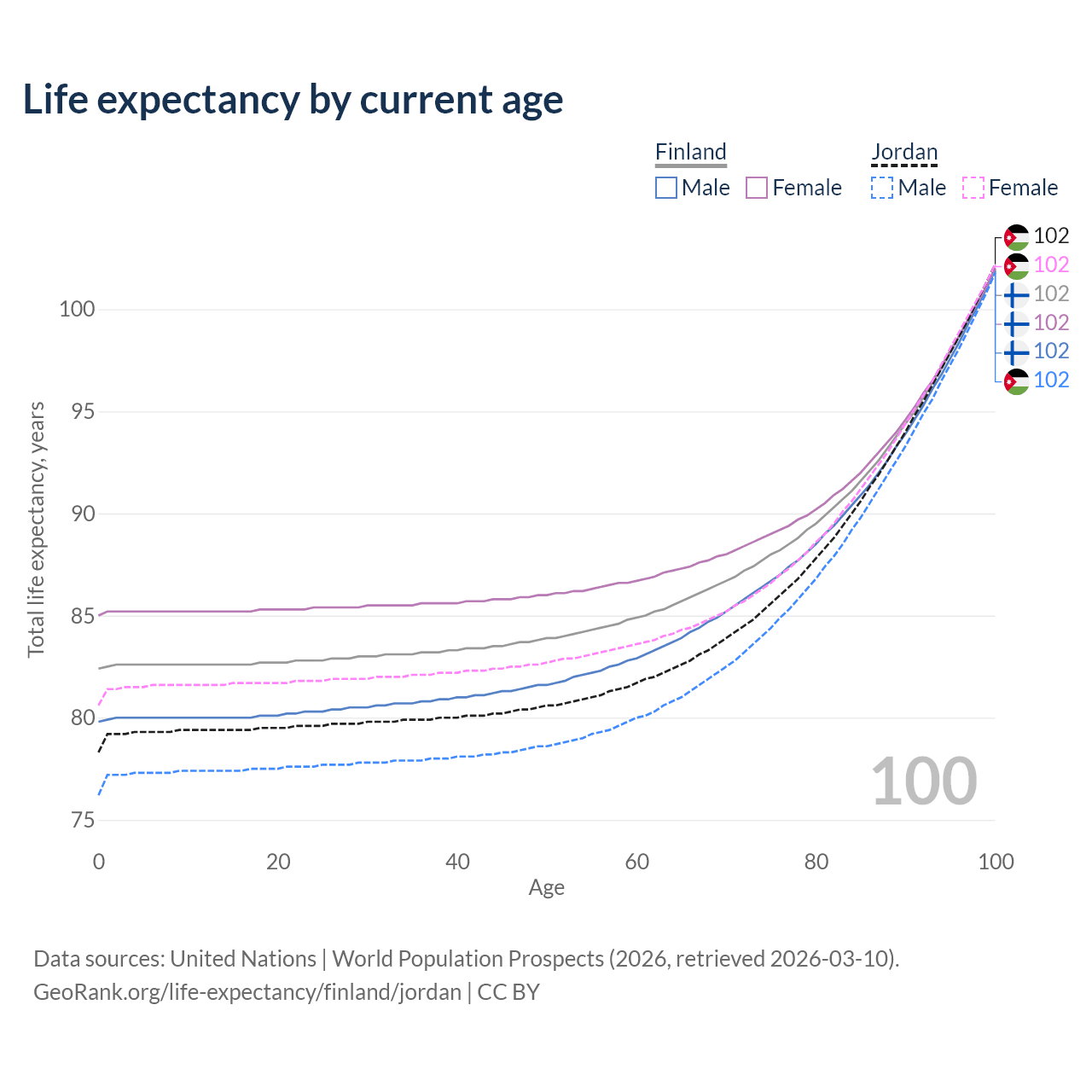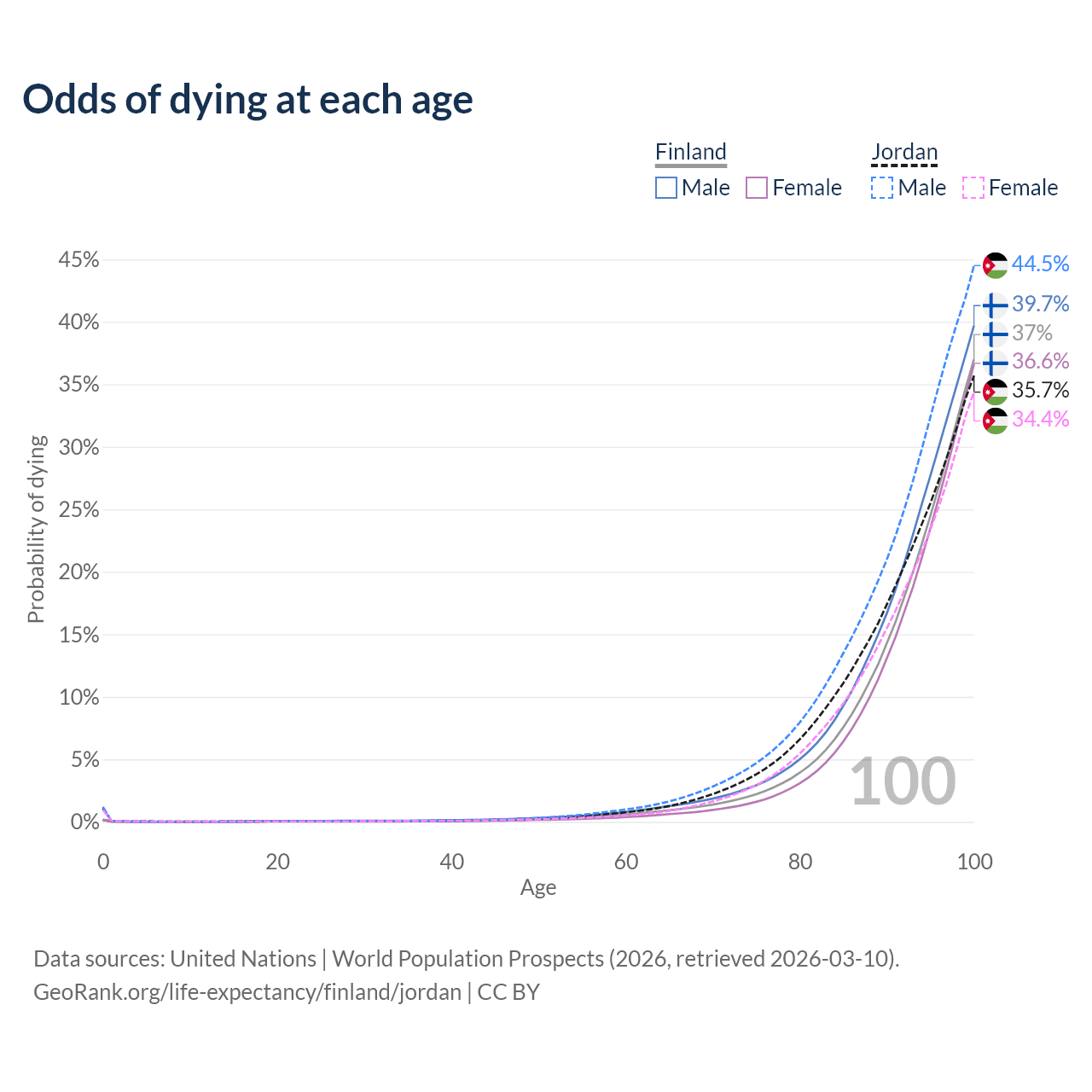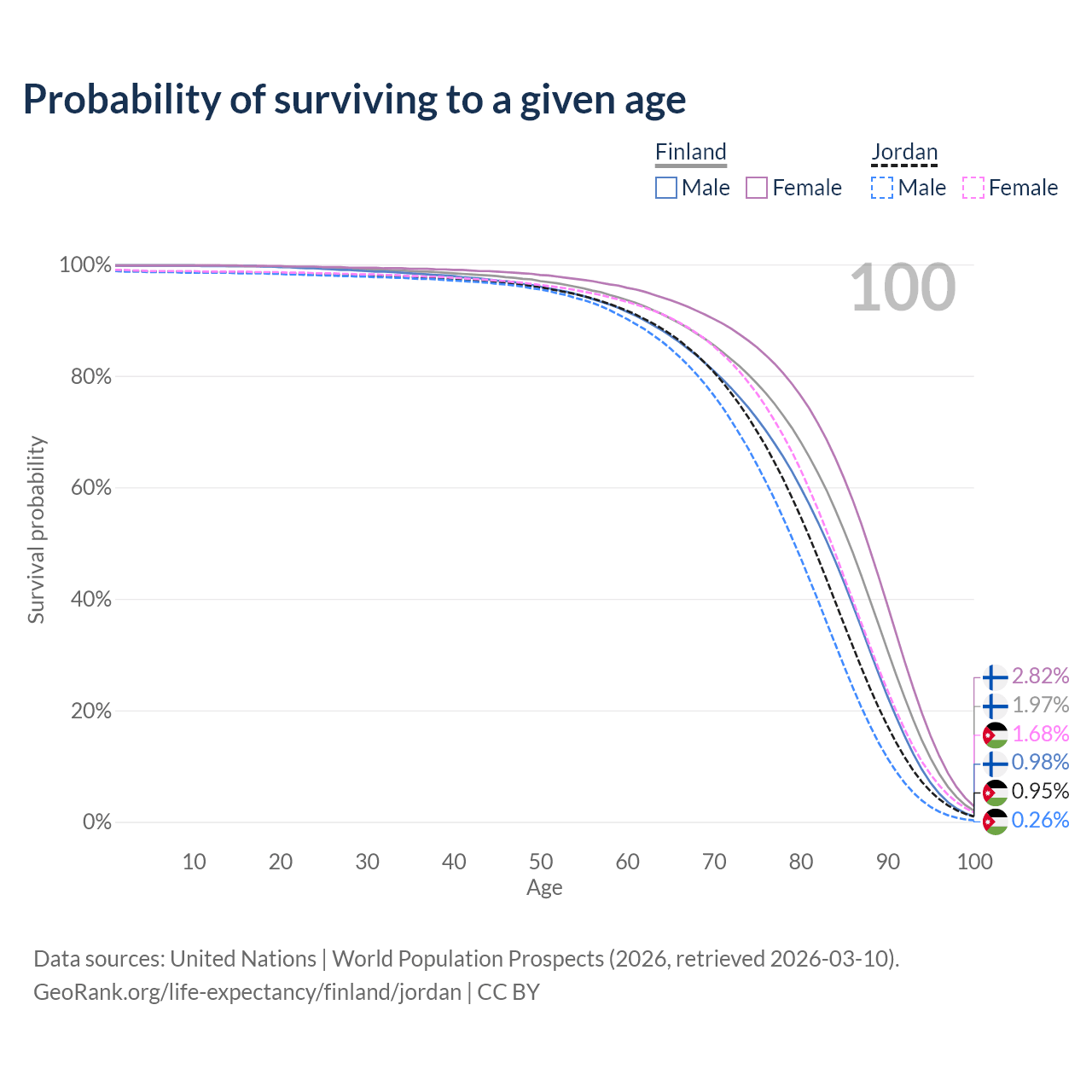 This life expectancy calculator shows the odds of living to 100, 95, 90, and below based on current age for both males and females in Finland and Jordan, along with mean and median age of death. The calculations are based on the 2026 life tables (actuarial tables) from the UN World Population Prospects.