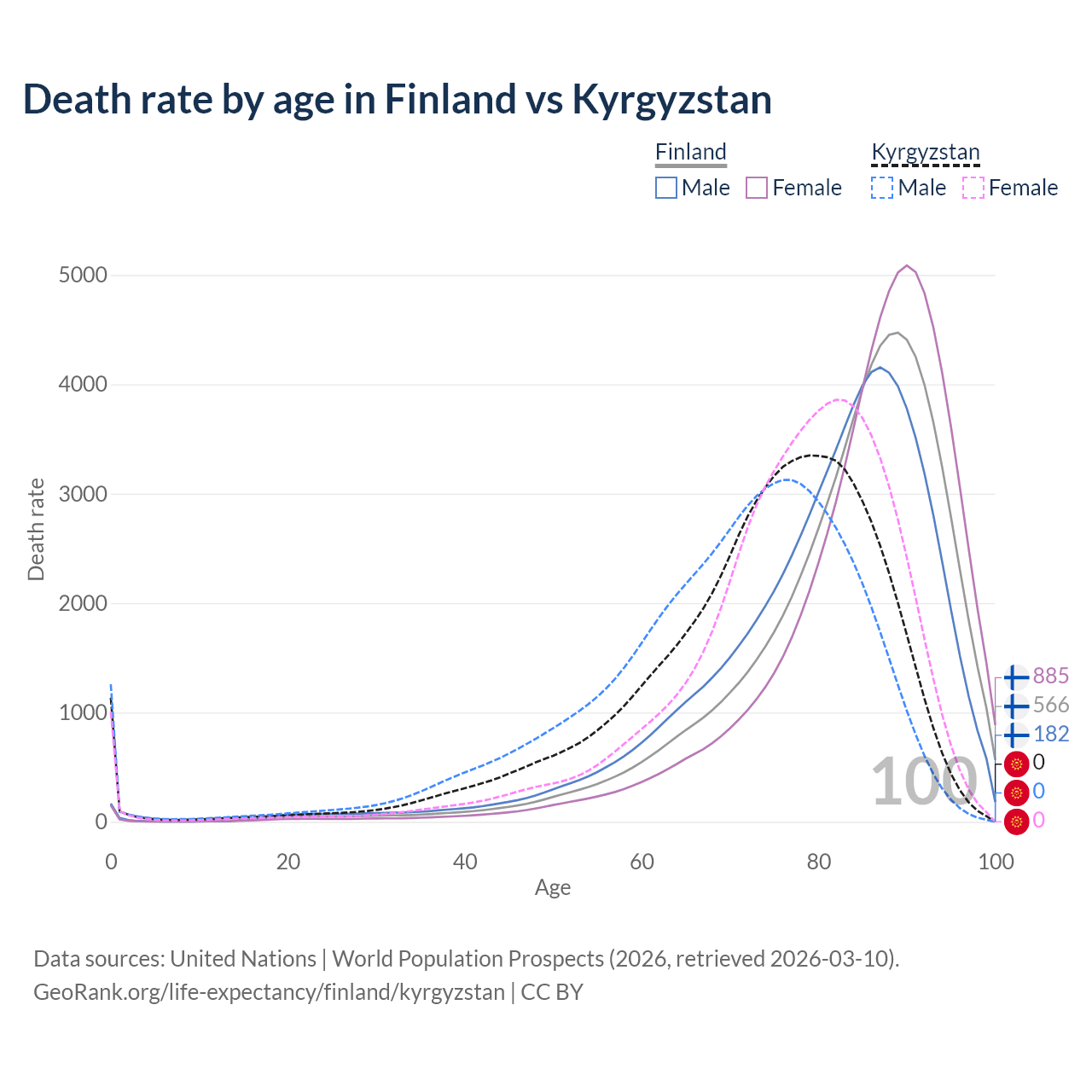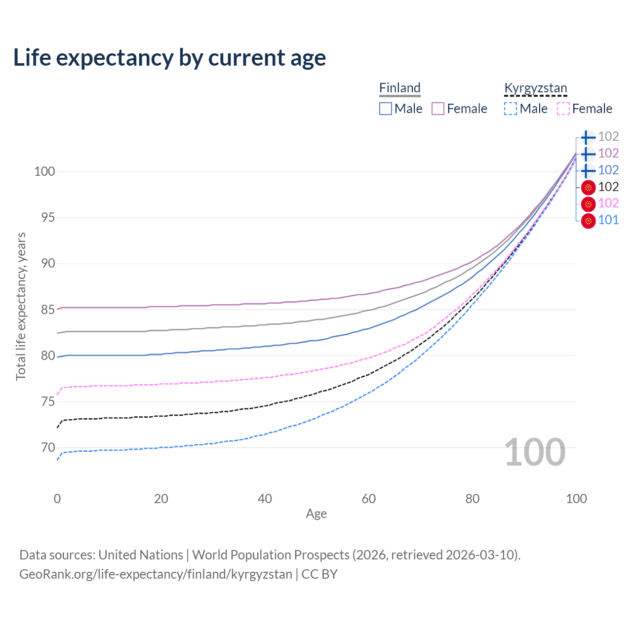 This life expectancy calculator shows the odds of living to 100, 95, 90, and below based on current age for both males and females in Finland and Kyrgyzstan, along with mean and median age of death. The calculations are based on the 2026 life tables (actuarial tables) from the UN World Population Prospects.