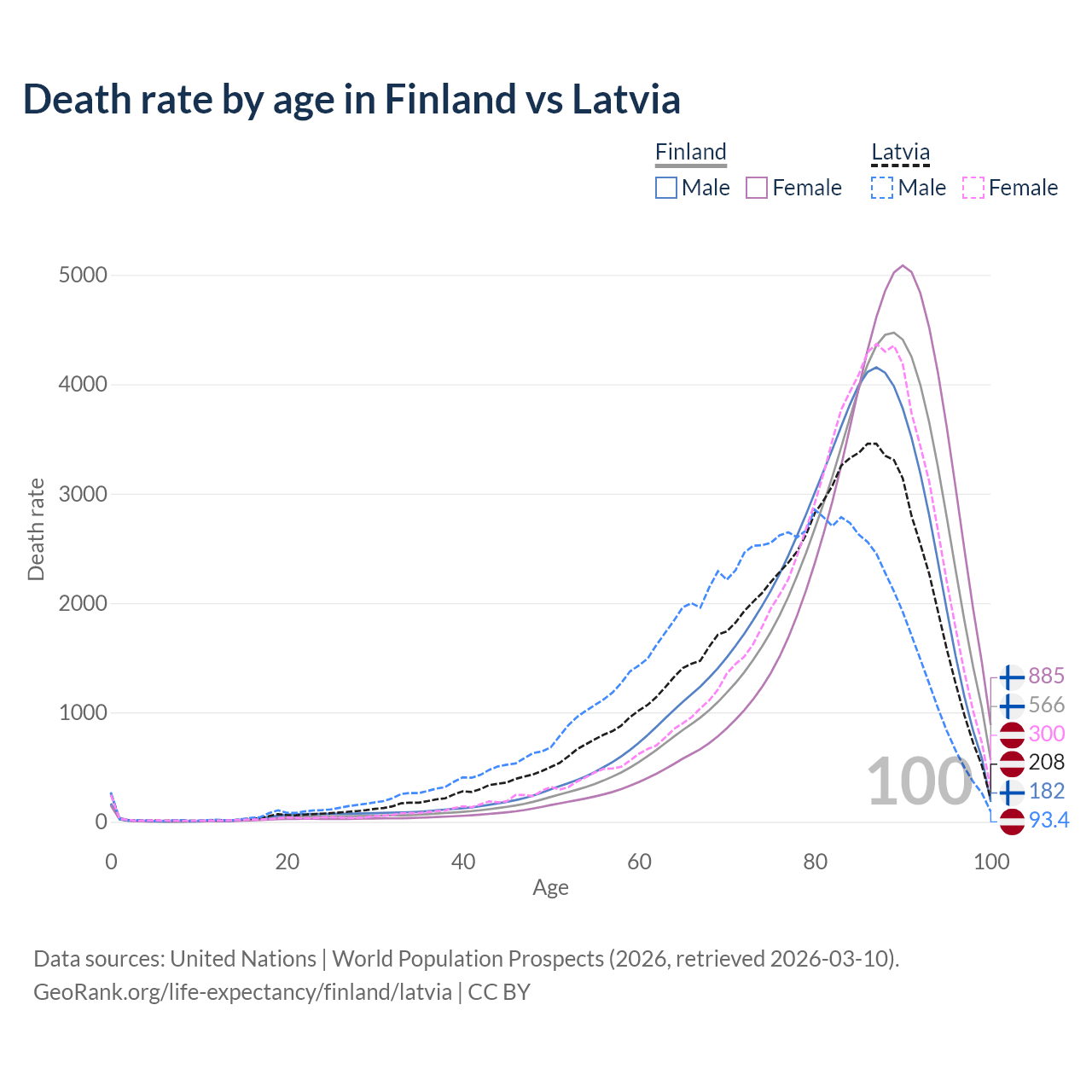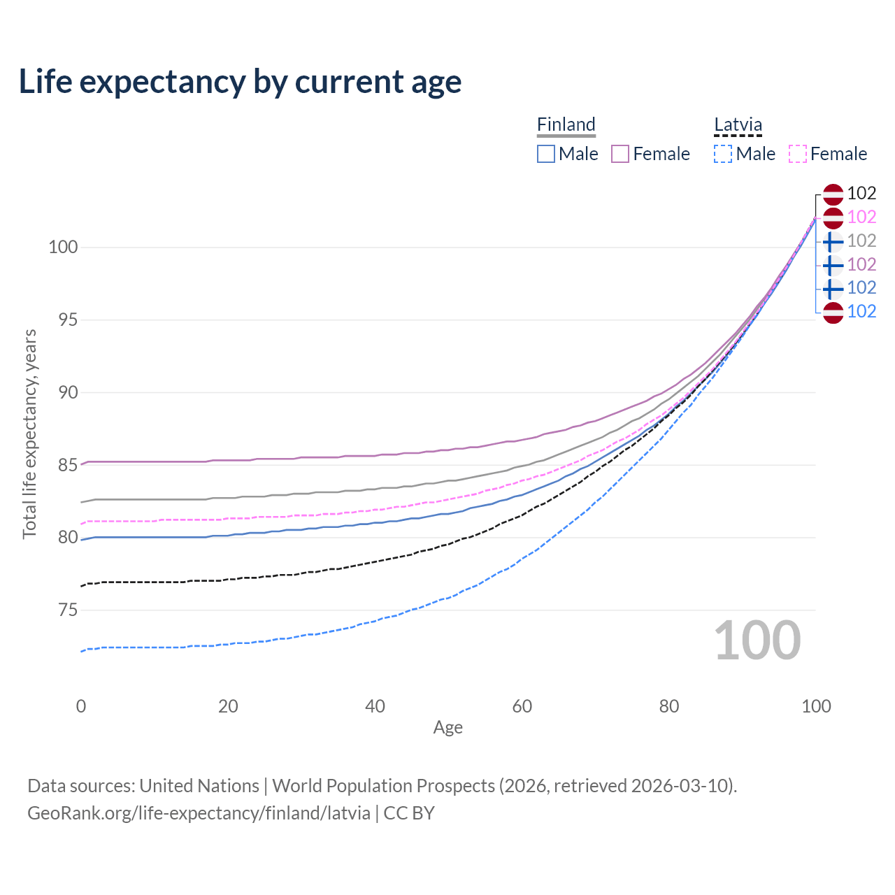 This life expectancy calculator shows the odds of living to 100, 95, 90, and below based on current age for both males and females in Finland and Latvia, along with mean and median age of death. The calculations are based on the 2026 life tables (actuarial tables) from the UN World Population Prospects.
