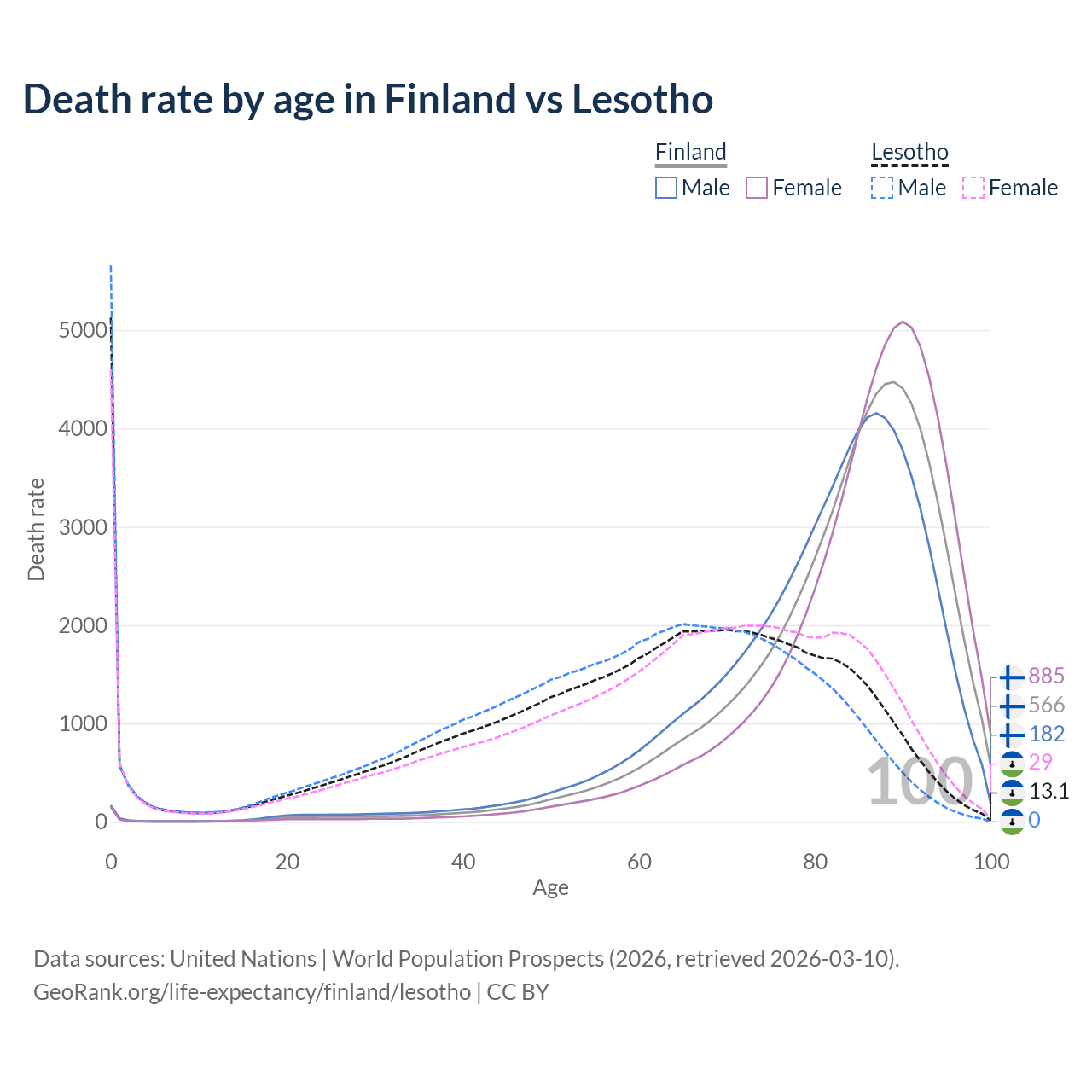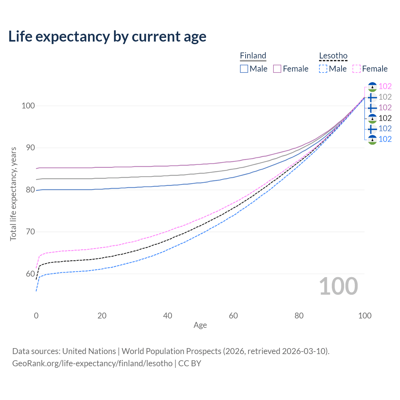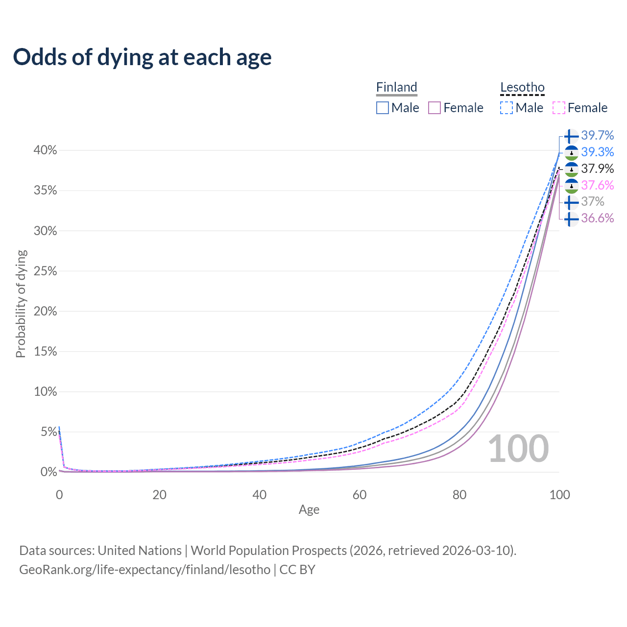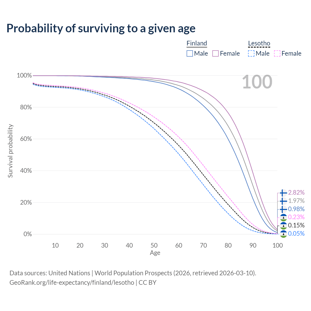 This life expectancy calculator shows the odds of living to 100, 95, 90, and below based on current age for both males and females in Finland and Lesotho, along with mean and median age of death. The calculations are based on the 2026 life tables (actuarial tables) from the UN World Population Prospects.