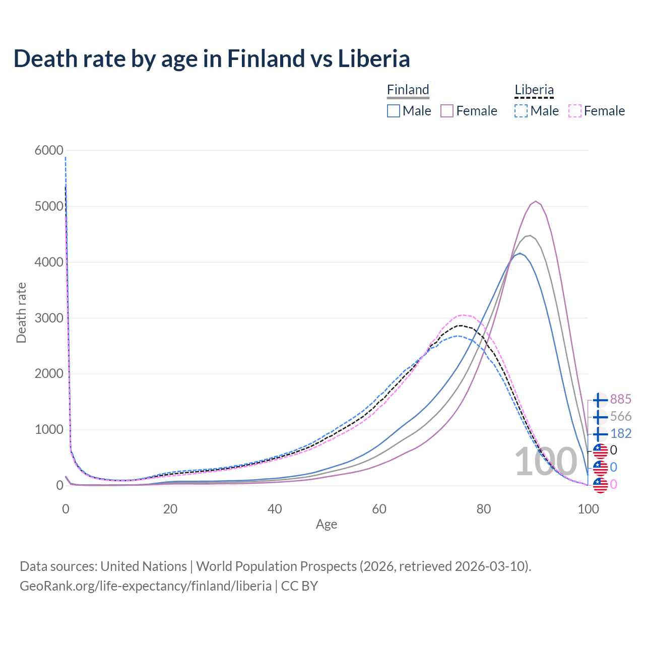 The average life expectancy at birth is 82.4 years in Finland vs 62.6 in Liberia. Finland is ranked 29/197 by life expectancy, and Liberia is 182/197. In Finland, the life expectancy is 79.8 years for males and 85 years for females. In Liberia, it's 61.3 years for males and 64 years for females.