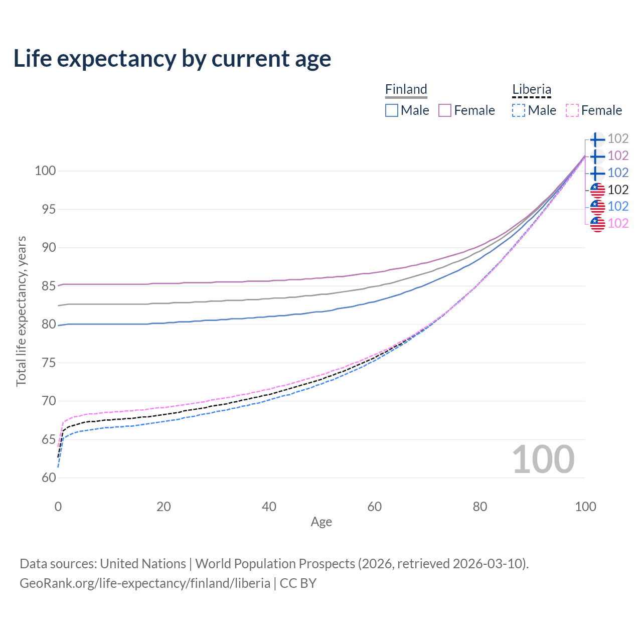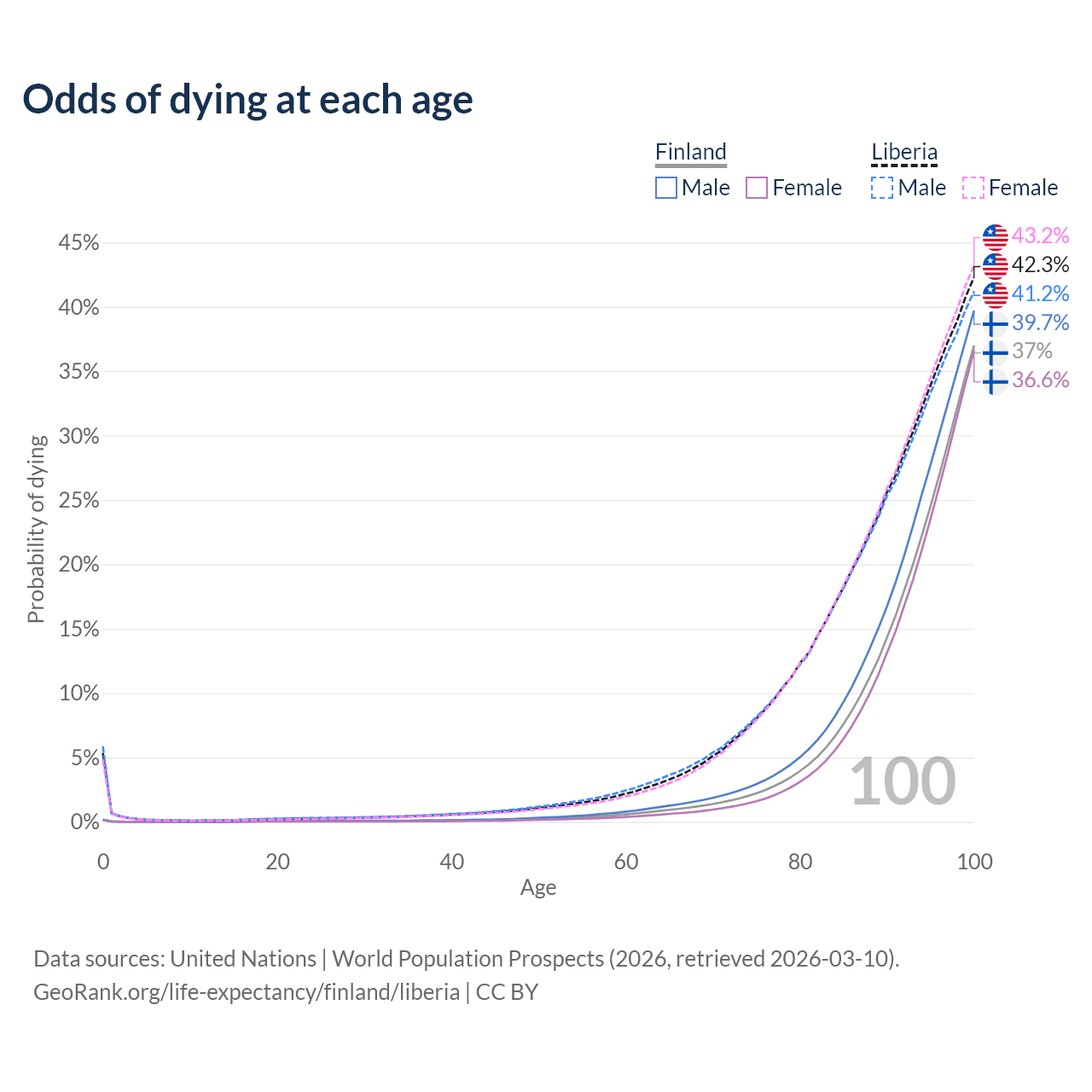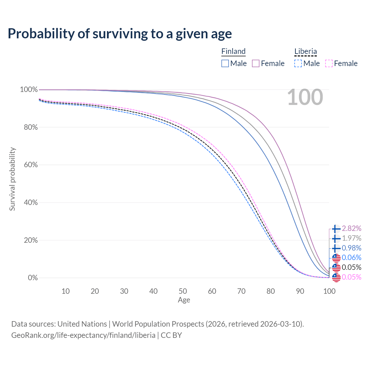 This life expectancy calculator shows the odds of living to 100, 95, 90, and below based on current age for both males and females in Finland and Liberia, along with mean and median age of death. The calculations are based on the 2026 life tables (actuarial tables) from the UN World Population Prospects.