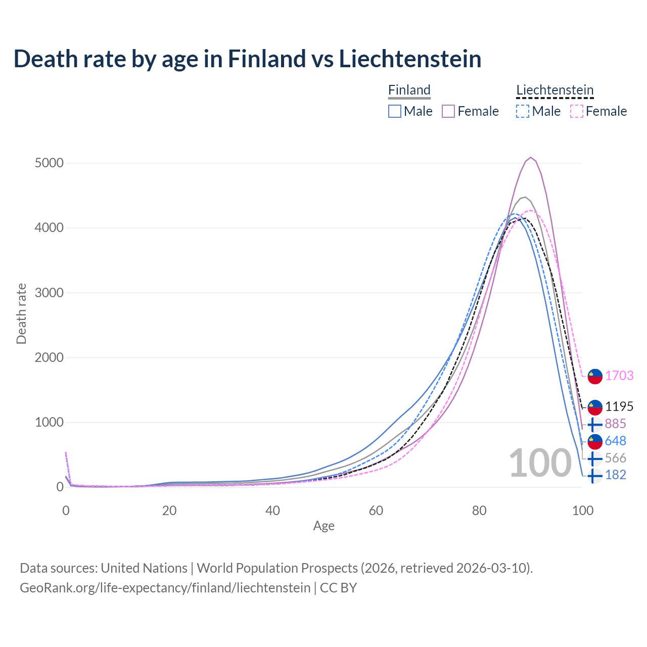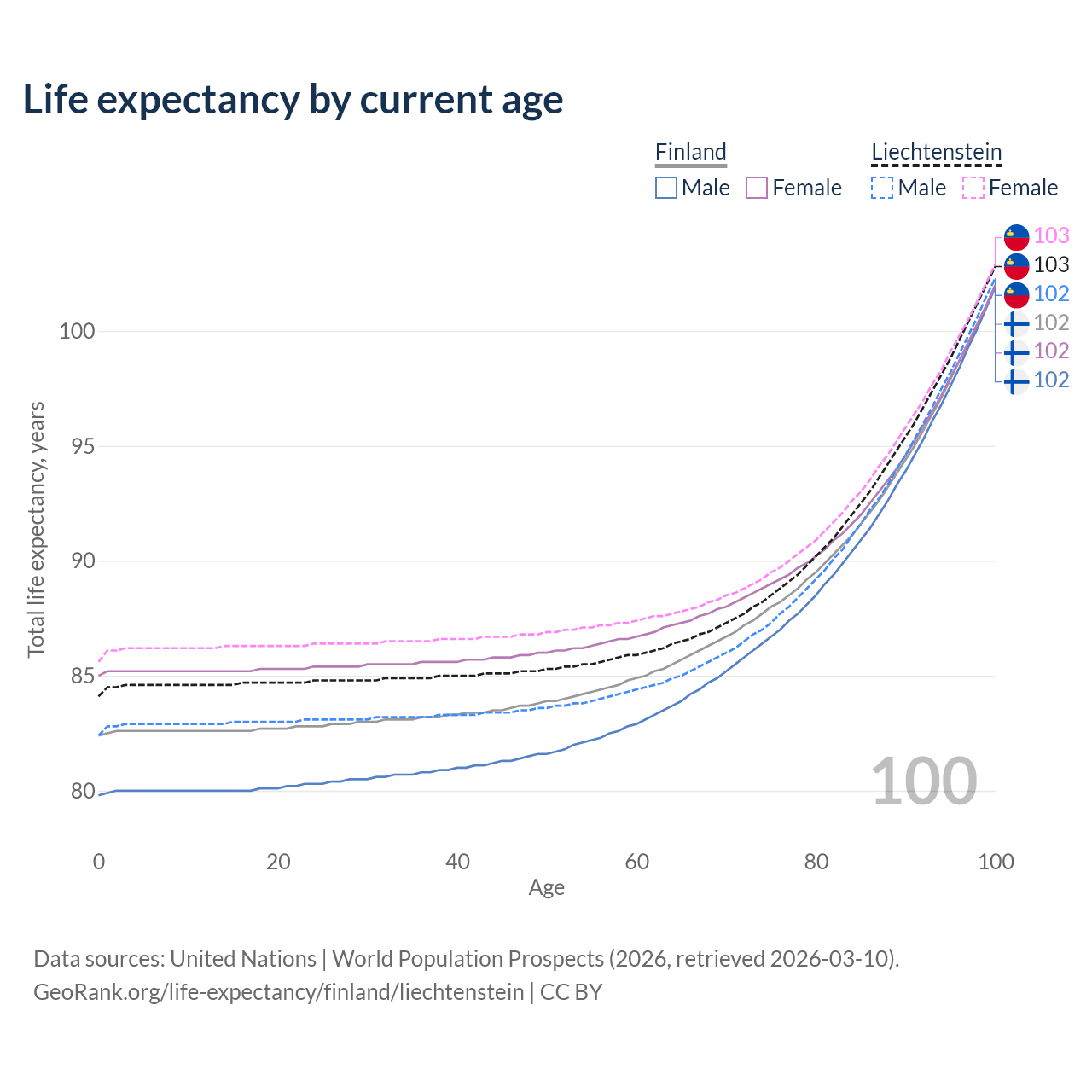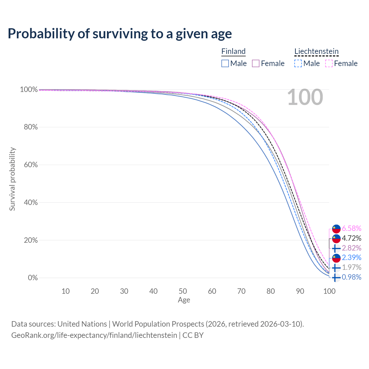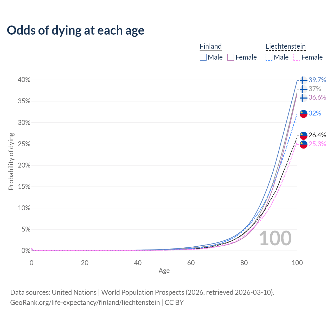 This life expectancy calculator shows the odds of living to 100, 95, 90, and below based on current age for both males and females in Finland and Liechtenstein, along with mean and median age of death. The calculations are based on the 2026 life tables (actuarial tables) from the UN World Population Prospects.